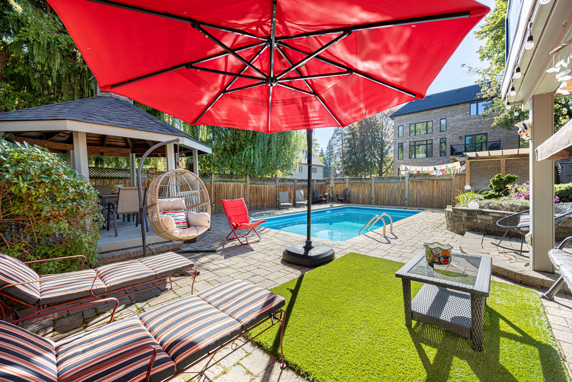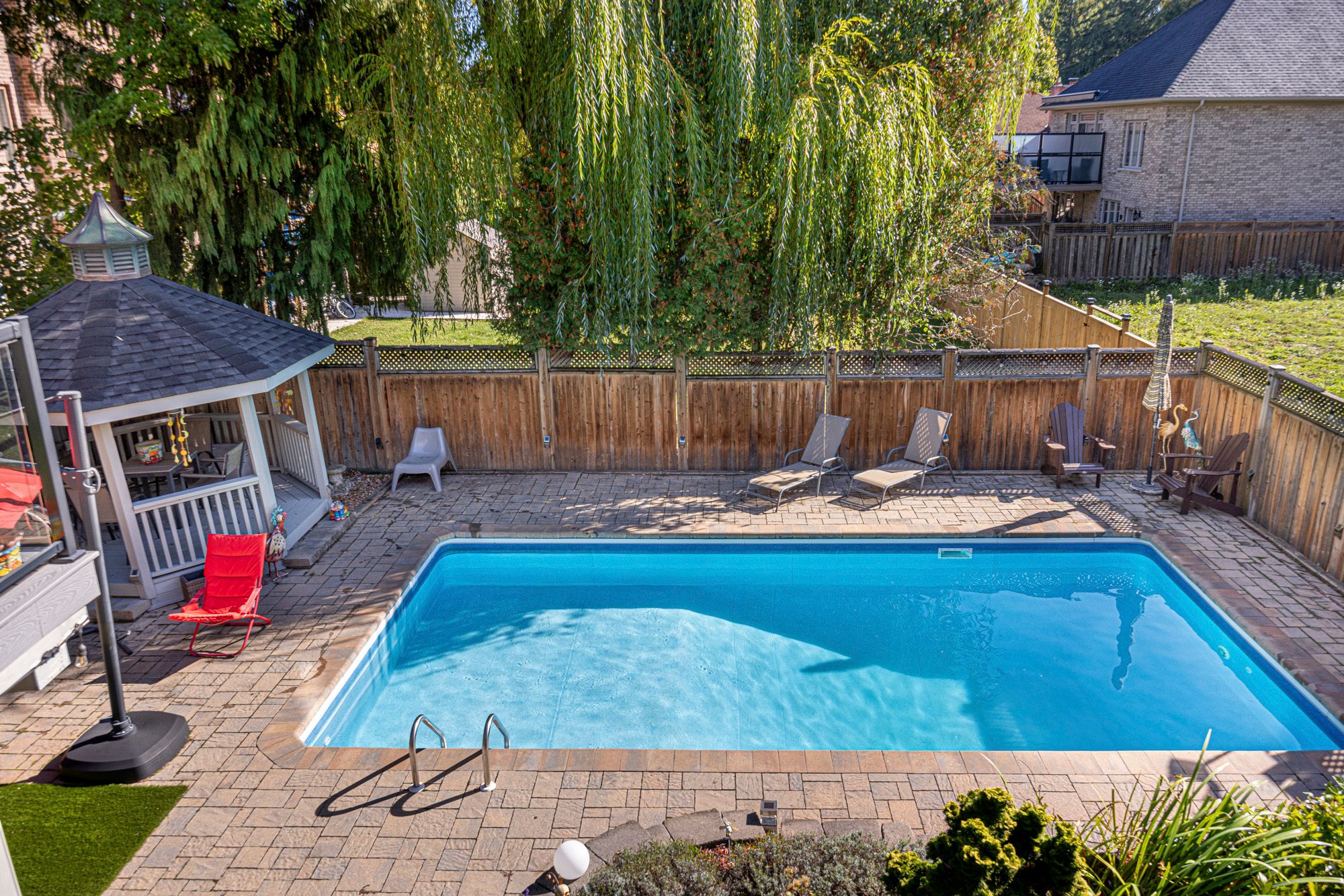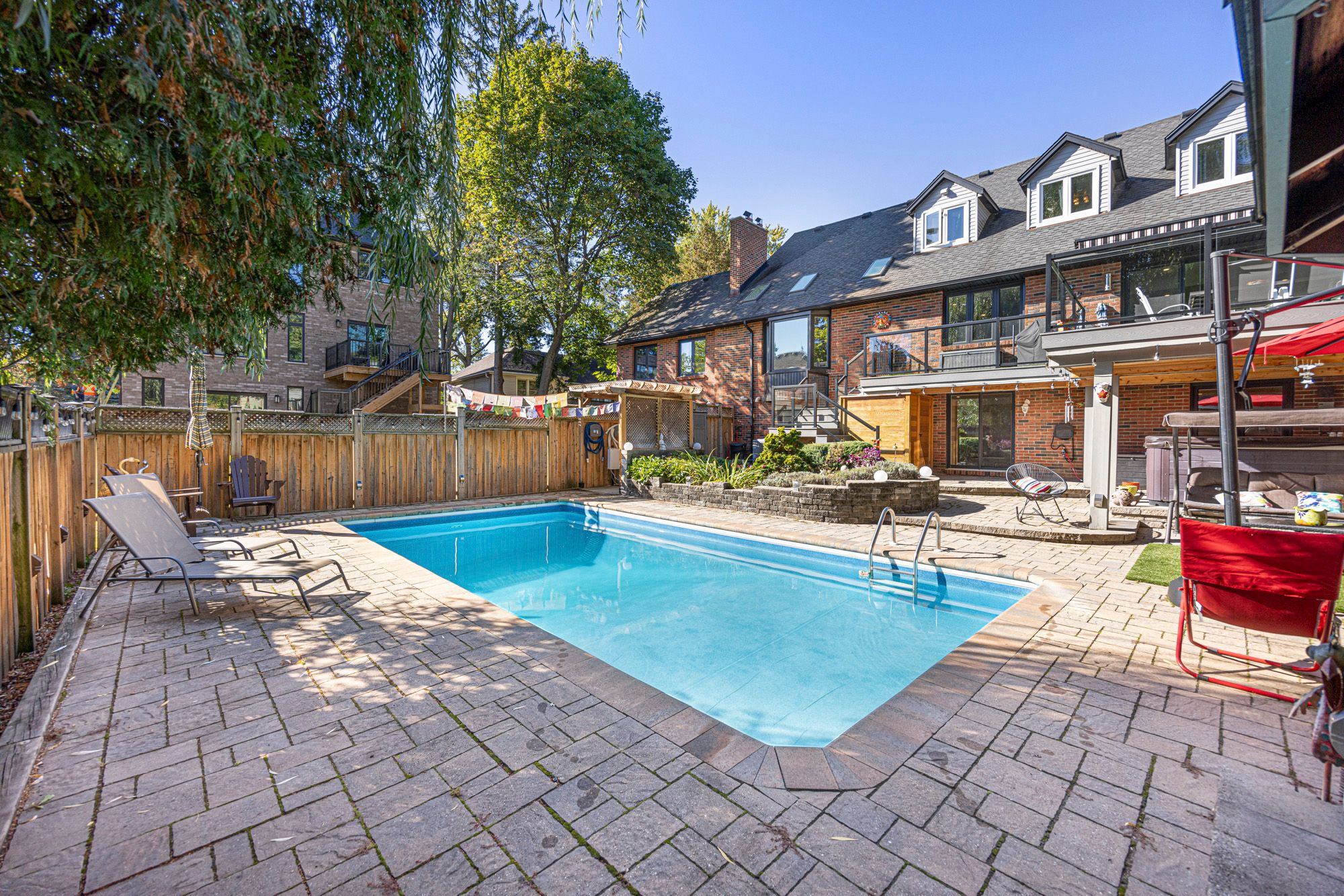 Professionally renovated executive home offering over 5,000 sq. Ft. Of finished living space in one of ancaster's most sought-after neighbourhoods. This impressive property features 4 + 1 bedrooms, 5 bathrooms, and 3,689 sq. Ft. Above grade, with an additional 2,048 sq. Ft. Finished walkout lower level providing exceptional living space and storage. A standout and rare feature of this property is the separate self-contained in-law suite with private front and rear entrances. This thoughtfully designed space includes a full kitchen, living room, bedroom, and bathroom, offering an ideal setup for multigenerational living, live-in caregivers, guests, or potential income opportunities while maintaining privacy and independence. The main level showcases dark hardwood flooring, upgraded doors and trim, and thoughtfully curated finishes throughout. The chef-inspired kitchen is the heart of the home, featuring a large quartz island, premium appliances, and ample space for both everyday living and entertaining. Elegant principal rooms include a formal dining area, inviting family room with skylights, formal sitting room, and a dedicated library or home office. Renovated bathrooms throughout the home offer modern fixtures and spacious glass showers. The primary bedroom retreat is truly exceptional, complete with a luxurious 5-piece ensuite and an expansive walk-in closet, creating the perfect private sanctuary. Step outside to a beautiful backyard oasis designed for relaxation and entertaining, featuring a pool, hot tub, gazebo, expansive deck with awning, stone patio, and storage shed-an ideal setting for memorable gatherings with family and friends. A double garage and spacious driveway provide ample parking and convenience. Ideally located close to top-rated schools, parks, golf courses, conservation areas, shopping, and major highway access, turn-key living with outstanding flexibility for large or multi-generational families and income potential.
