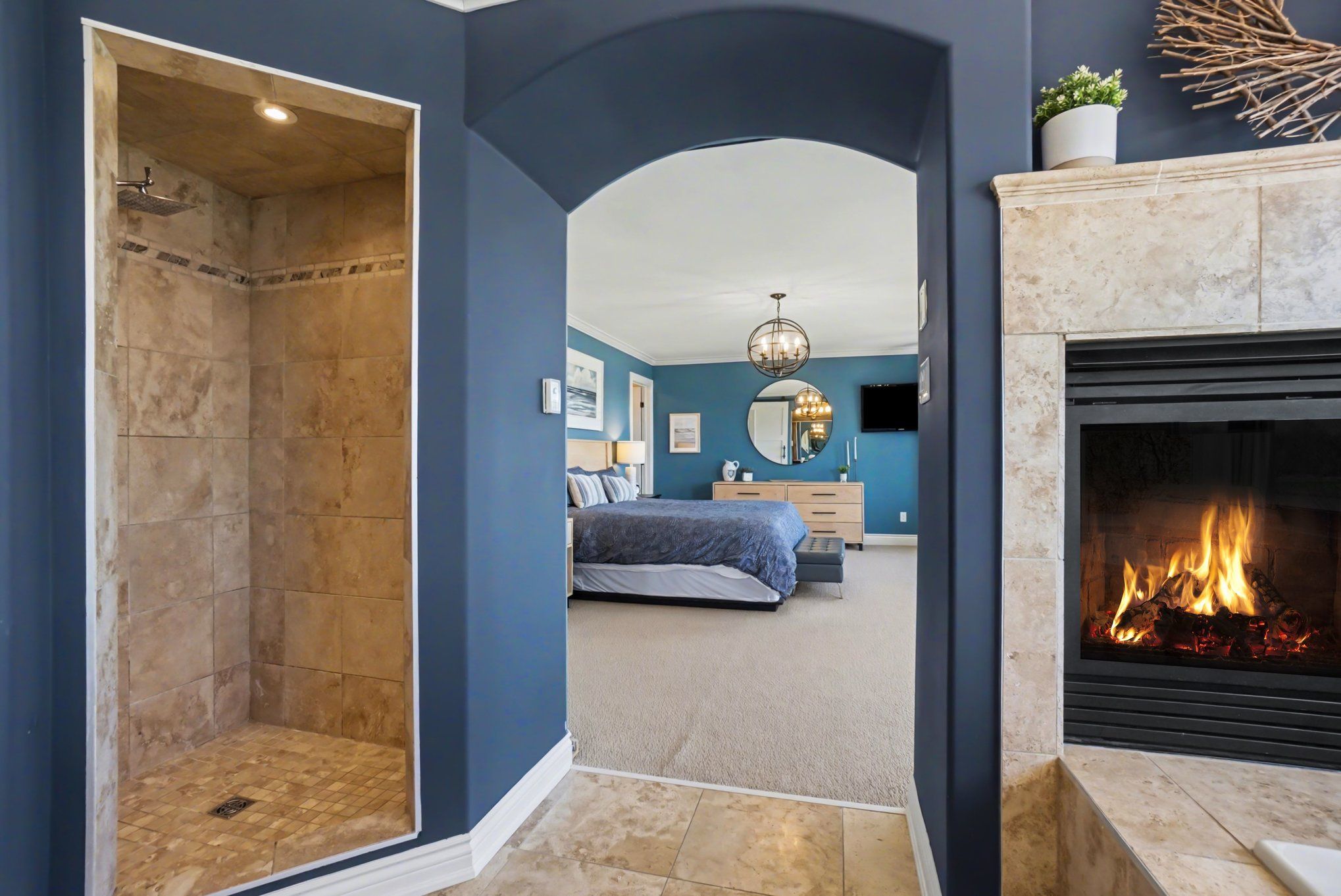 • Luxurious primary suite featuring lakeside sitting area and double-sided fireplace.