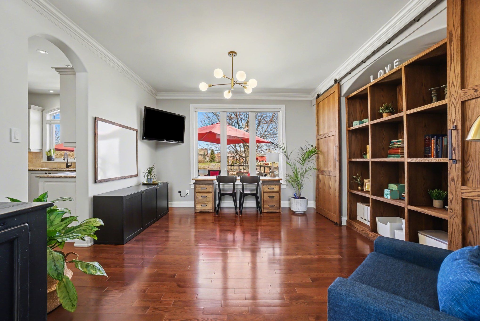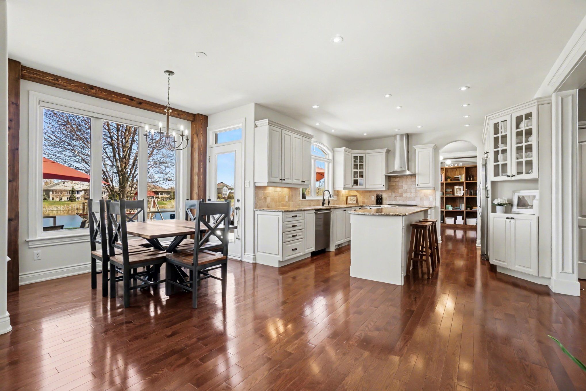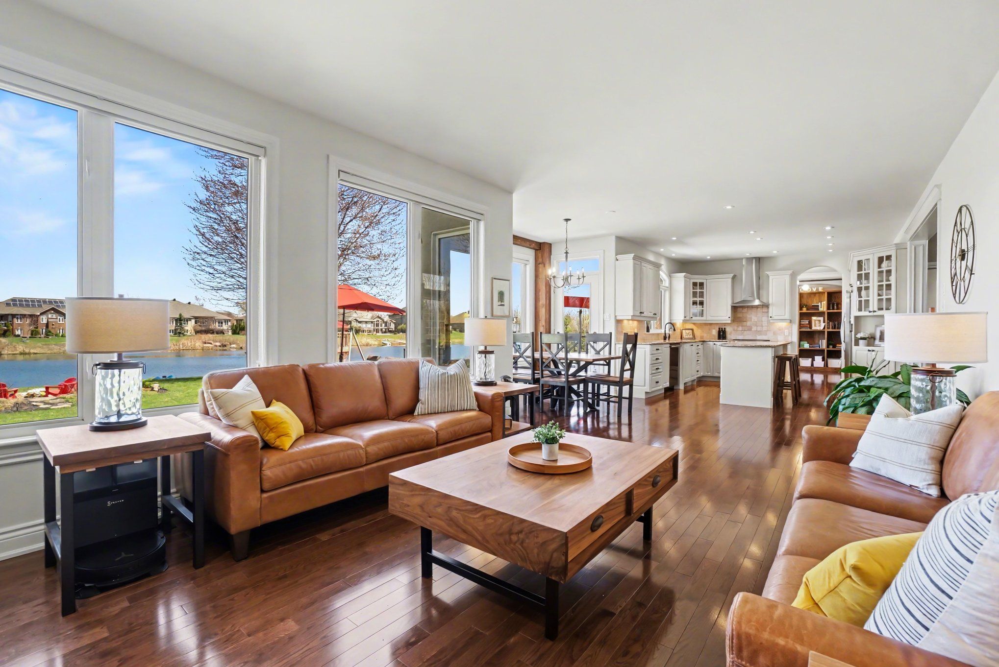 Experience refined waterfront living in this stunning 4+1 bedroom home on southwood lake in the coveted woodstream community. Bathed in natural light, the home's foyer welcomes you with 18' vaulted ceilings that flow seamlessly into an elegant living room, where a dramatic picture window and rich hardwood floors extend throughout the main level. A formal dining room-currently styled as an office-comfortably hosts up to 10 guests and features custom built-in shelving with chic barn doors. The chef-inspired eat-in kitchen offers granite countertops, stainless steel appliances including a beverage centre, under-cabinet lighting, and a bright solarium-style breakfast area with water views and walkout to a composite, two-tier deck. The family room features large windows, providing tranquil lake views and a gas fireplace with stone surround. A main-floor bedroom/den with cheater access to a full bath provides flexibility for guests, multigenerational living, or a private workspace. A mudroom with laundry and direct garage access adds everyday convenience. The hardwood staircase leads to the second floor with a luxurious primary suite featuring a lakeside sitting area, a custom walk-in wardrobe, and a double-sided fireplace shared with the 5-piece ensuite with soaker tub, double vanity, and separate shower. There are two additional bedrooms, one with cathedral ceilings, and each have their own private ensuite bathroom. The finished lower level offers a spacious recreation/games room, pantry/wine room, fifth bedroom, and abundant storage. Outdoors, a beautifully landscaped lot with bonfire area, irrigation system and a treehouse invite lakeside living- waterskiing, boating, fishing, and skating/hockey in winter. Inviting community association provides use of a private community centre, saltwater pool, tennis and basketball courts, and a gym (annual fee $450), walking/biking paths, and year-round events. 24hrs irrevocable on all offers.