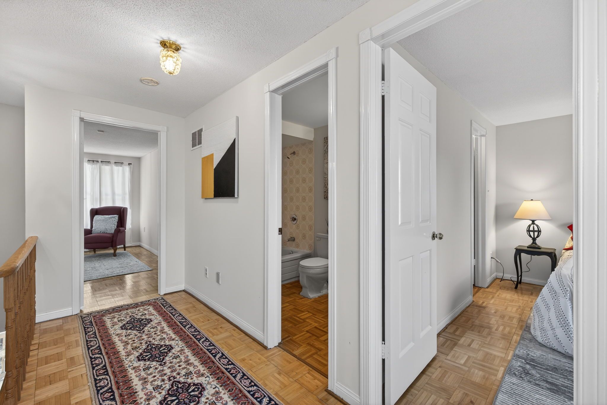 This is your chance to get into exclusive "olde thornhill" and put your mark on this fabulous corner unit townhouse. This residence offers approximately 2340 sq ft of living space including a fully finished basement. The main level walkout to a deck is accessed by both the living room and dining room. Large bright windows accent this space, and the living room actually has a charming electric fireplace. The main level kitchen is large and boasts a lovely breakfast room. The upper level has a massive primary bedroom with a walkout to its own balcony, that is also shared with the second family bedroom. Ample walk-in closets and a 4-piece ensuite bath complete the primary suite. The third bedroom on this level is spacious and also has a walk-in closet. Rounding out this property is a lower level recreation room with wood-burning fireplace, and there is even another bedroom on this level. Don't miss this opportunity.