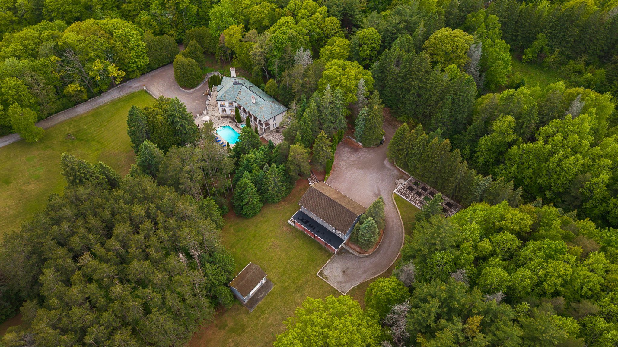 Gated and tree-lined for total privacy, 68 crows pass is a gordon ridgely-designed indiana-limestone and slate manor that delivers true four-season living just forty-five minutes from downtown toronto via direct highway 407 access. The home wraps approximately 7,000 sq ft of interiors around authentic 1802 farmhouse stone walls and hewn beams, beginning with a marble rotunda and hand-forged spiral staircase that lead to principal rooms opening onto a 100-foot limestone terrace overlooking a heated salt-water pool, whirlpool and hot tub. A sub-zero, thermador and miele kitchen centres a twelve-foot island and sun-splashed breakfast bay, while the adjoining beam-clad family room and original stone dining hall celebrate the estates heritage. Upstairs, five ensuite bedrooms and a library or sixth bedroom await; the forty-three-foot primary wing enjoys three sets of french doors to private balconies, a fireplace sitting area, twin walnut dressing rooms and a spa bath framed by a palladian window. The walk-out lower level provides a games lounge, wet bar, guest suite and covered loggia, ensuring effortless indoor-outdoor entertaining through every season. Lifestyle amenities continue outside: a heated three-plus-car coach house currently a full gym and additional bedroom the loft-style second garage crowns the stone-clad barn for additional collectibles. Equestrians will value three stalls, a tack room, two cross-ties and a fenced paddock, and ready for an arena, and dual gated drives simplify daily comings and goings. This home offers starlink, multi-zone hvac, water purification, ev charger, credit valley sandstone accents and a slate roof complete this rare fusion of architectural pedigree, resort comfort and year-round recreation, with dagmar and lakeridge ski clubs, golf courses and trail networks only minutes away. Zoning per township of scugog zoning by-law: orm-ep (oak ridges moraine environmental protection)