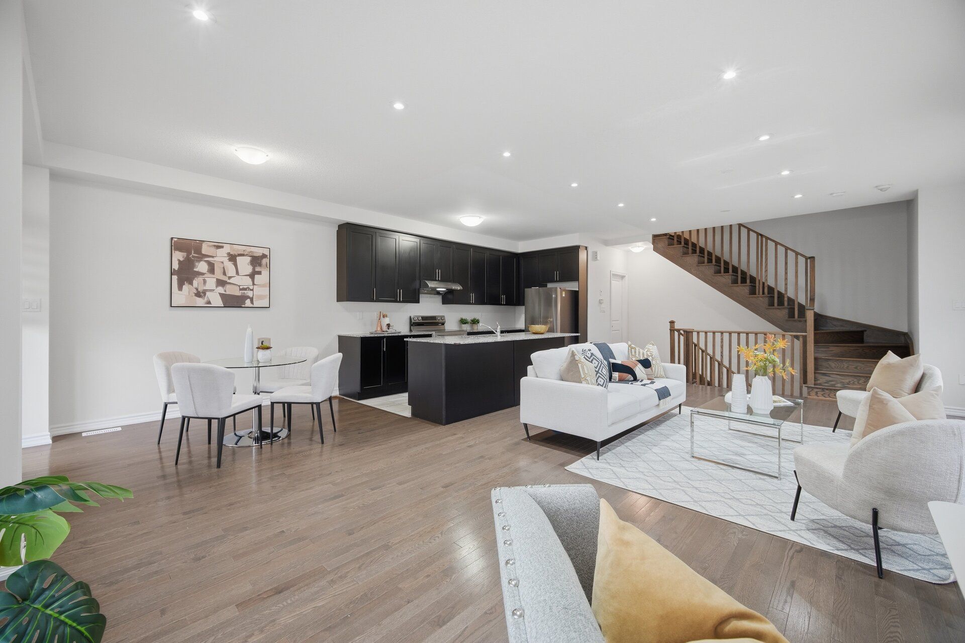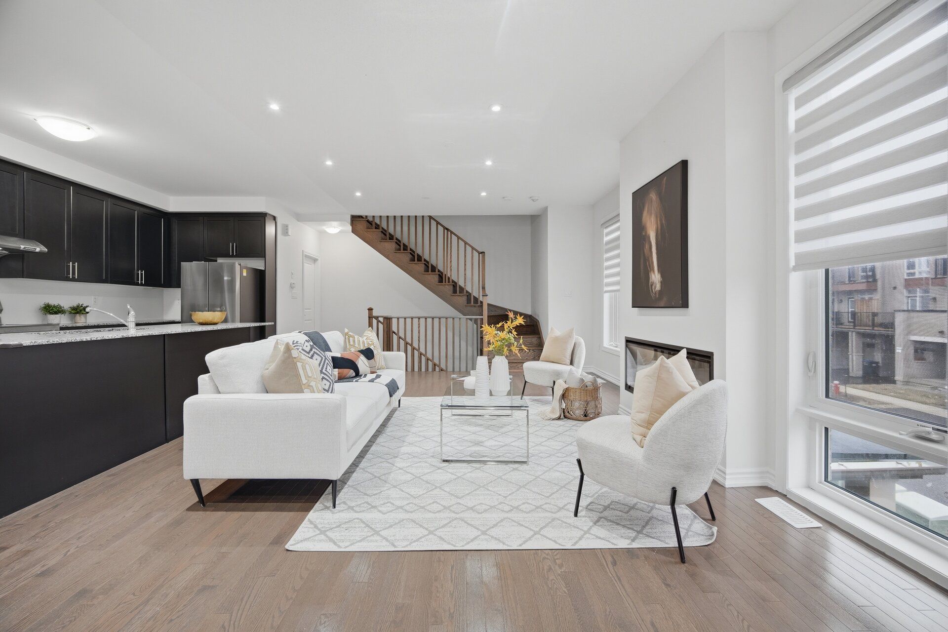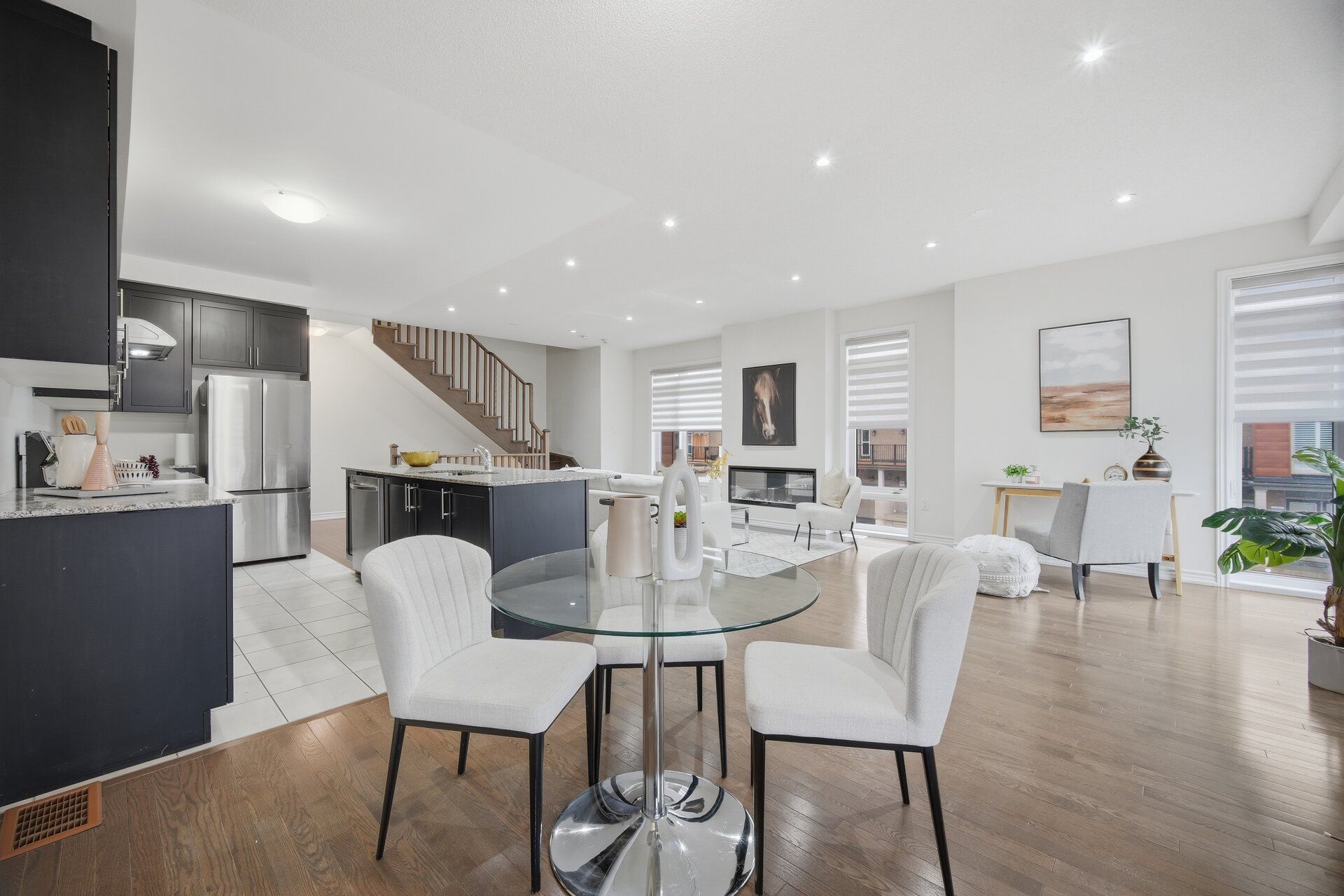 • Open concept upgraded kitchen and dining area with electric fireplace.
