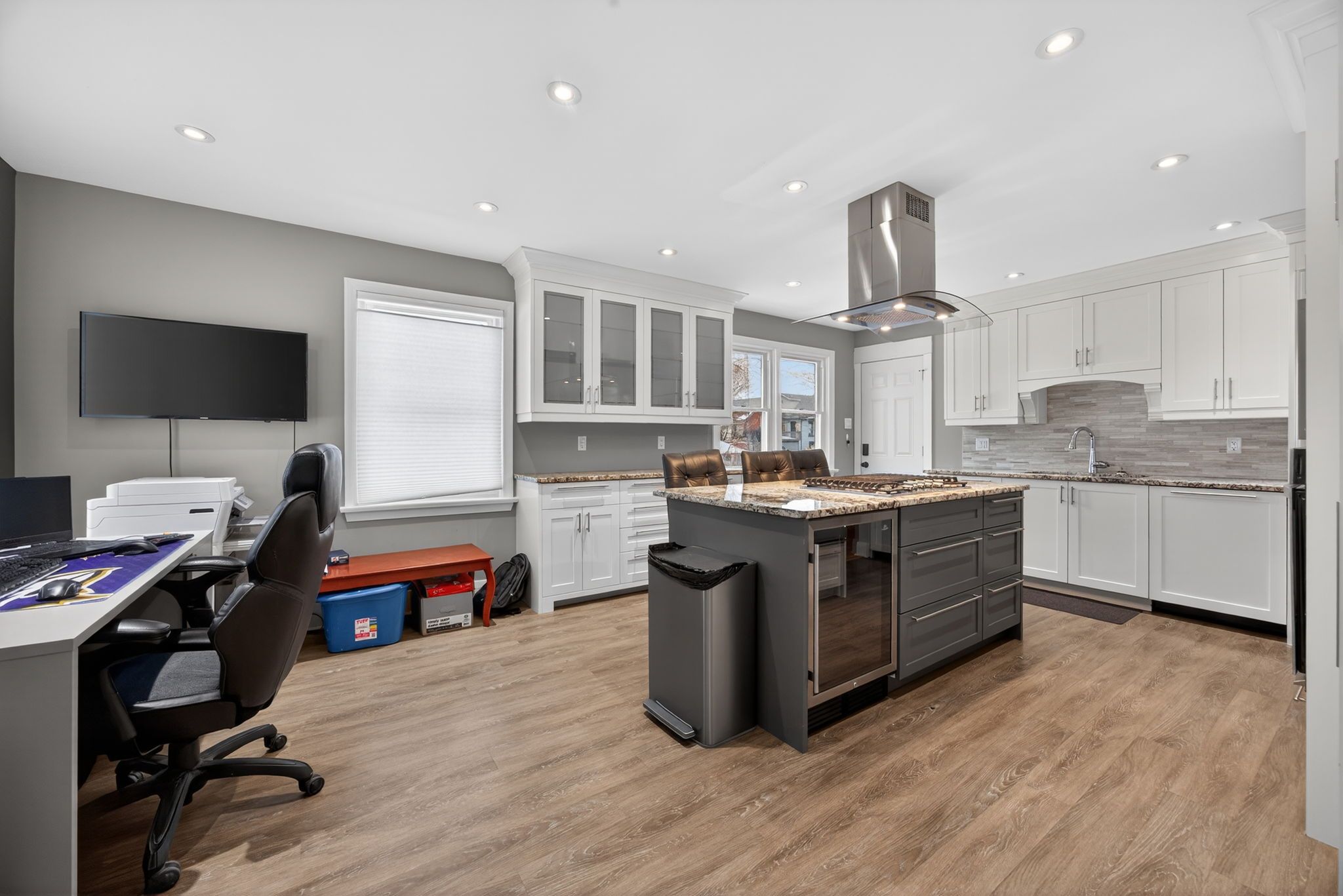 • Bright, spacious eat-in kitchen with granite surfaces and stainless steel appliances.