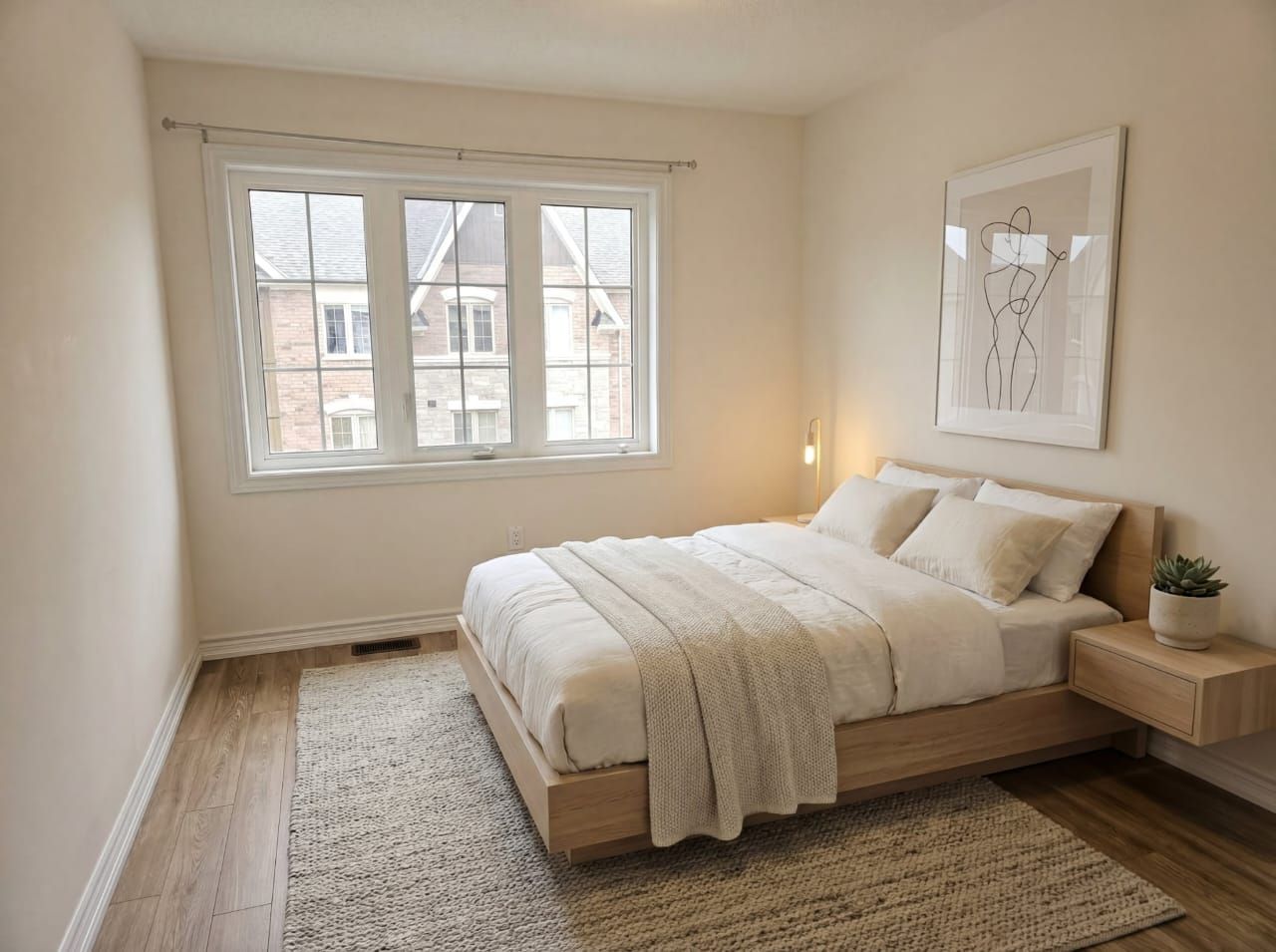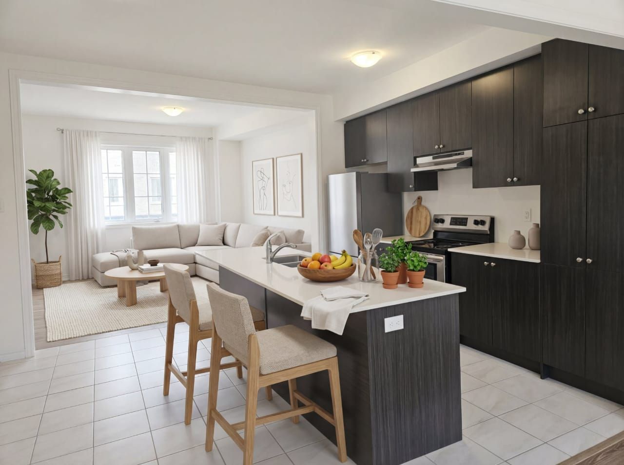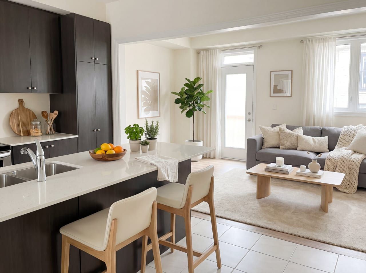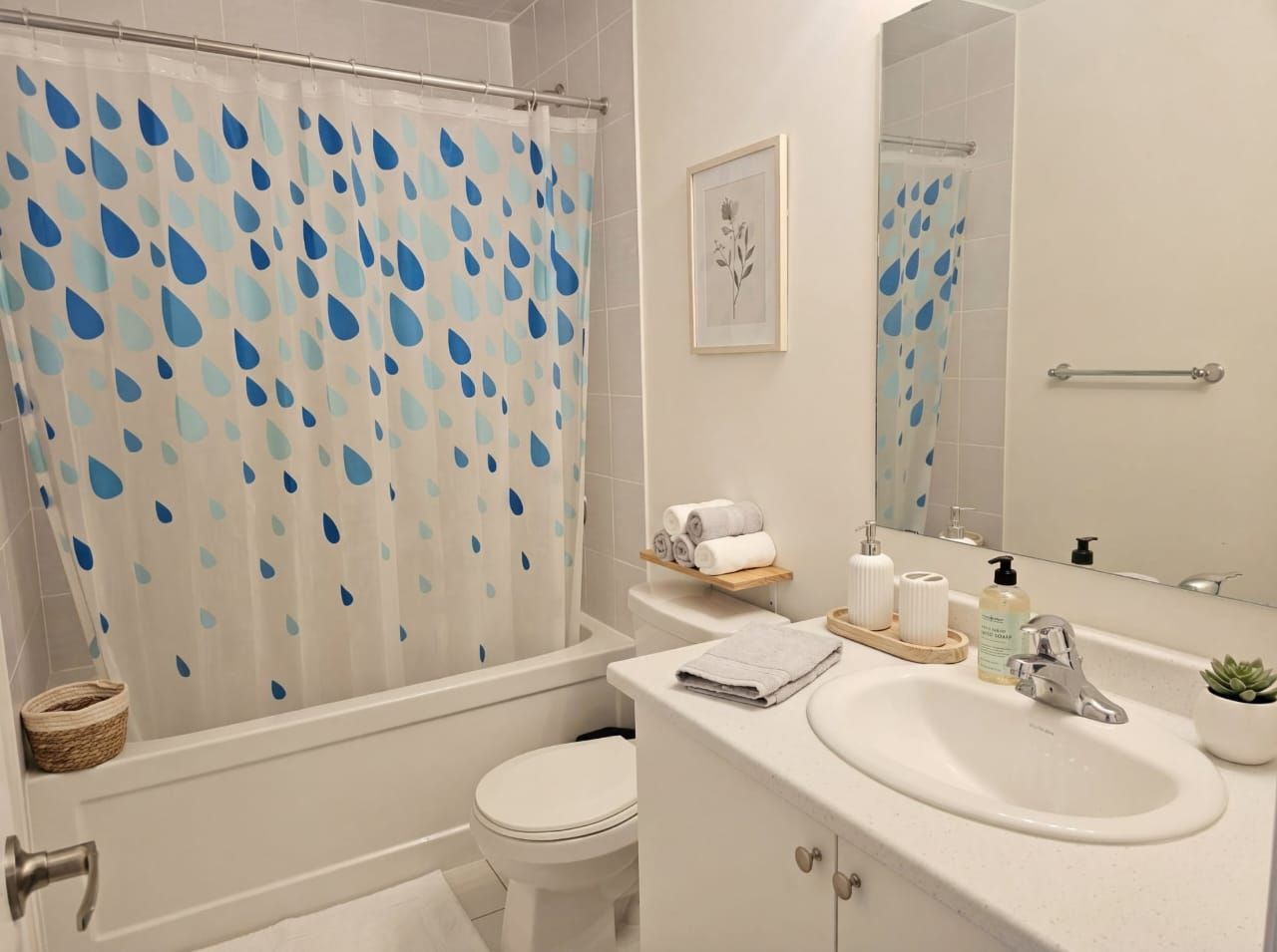 • Bright open-concept layout with 9ft ceilings and large windows.