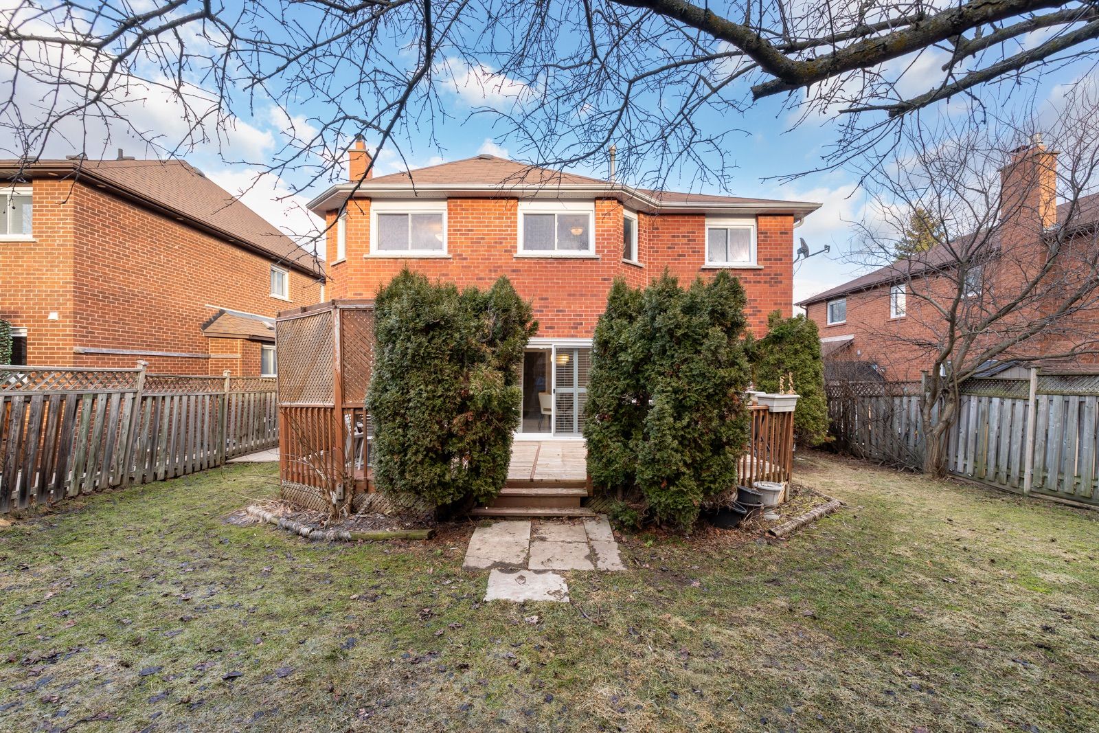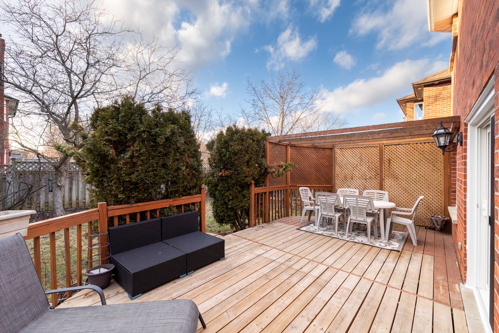 • Private backyard with mature trees, deck, and pergola for outdoor dining.
