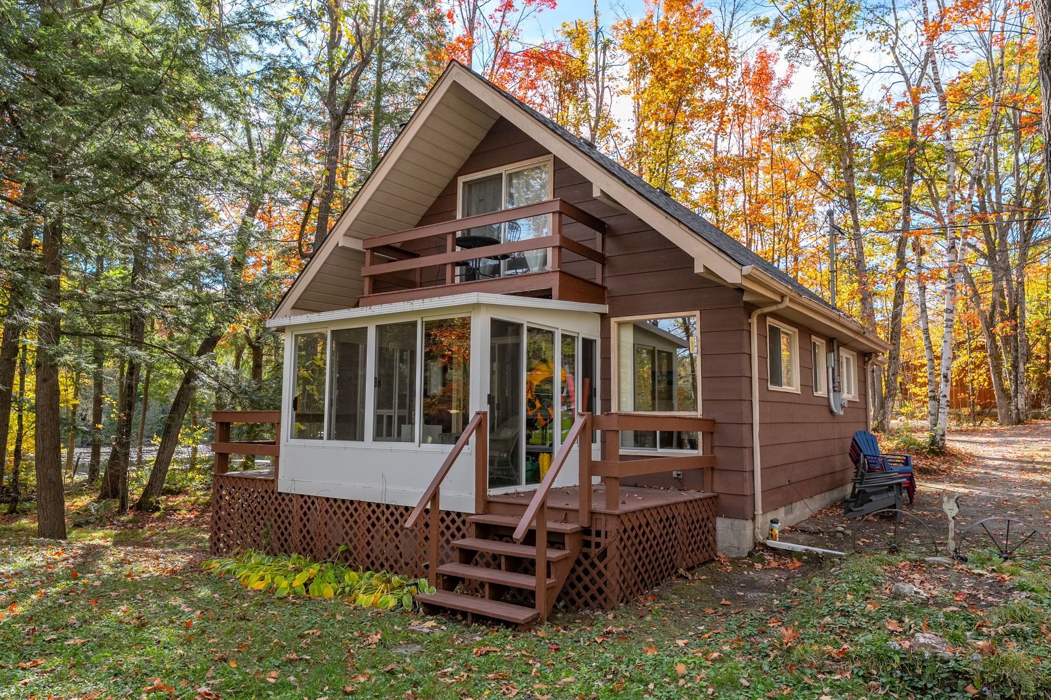 Welcome to your lakeside retreat on big bald lake, part of the desirable trent-severn waterway with access to five lakes without locking. This well-maintained, four season chalet-style cottage offers 150 ft of private shoreline on a beautifully treed lot with level terrain at the water's edge. Featuring 3 bedrooms, a full 4-piece bath, and an open-concept kitchen, dining, and living area with hardwood accents and a cozy propane fireplace. Enjoy peaceful views from the glass sunroom or step outside to the spacious deck and dock for outdoor living. The upper lakeside bedroom includes a walkout balcony for serene morning coffee moments. Recent updates include a new water pump and uv system (2024) and a newly re-shingled roof (2024). Across the lake, 283 acres of privately owned managed forest create a tranquil, undeveloped view. A nearby jumping rock adds fun for the adventurous, and you're just minutes from stunning turquoise waters of sandy lake beach - perfect for swimming and paddling. This turn-key property is being sold fully furnished with all contents included.