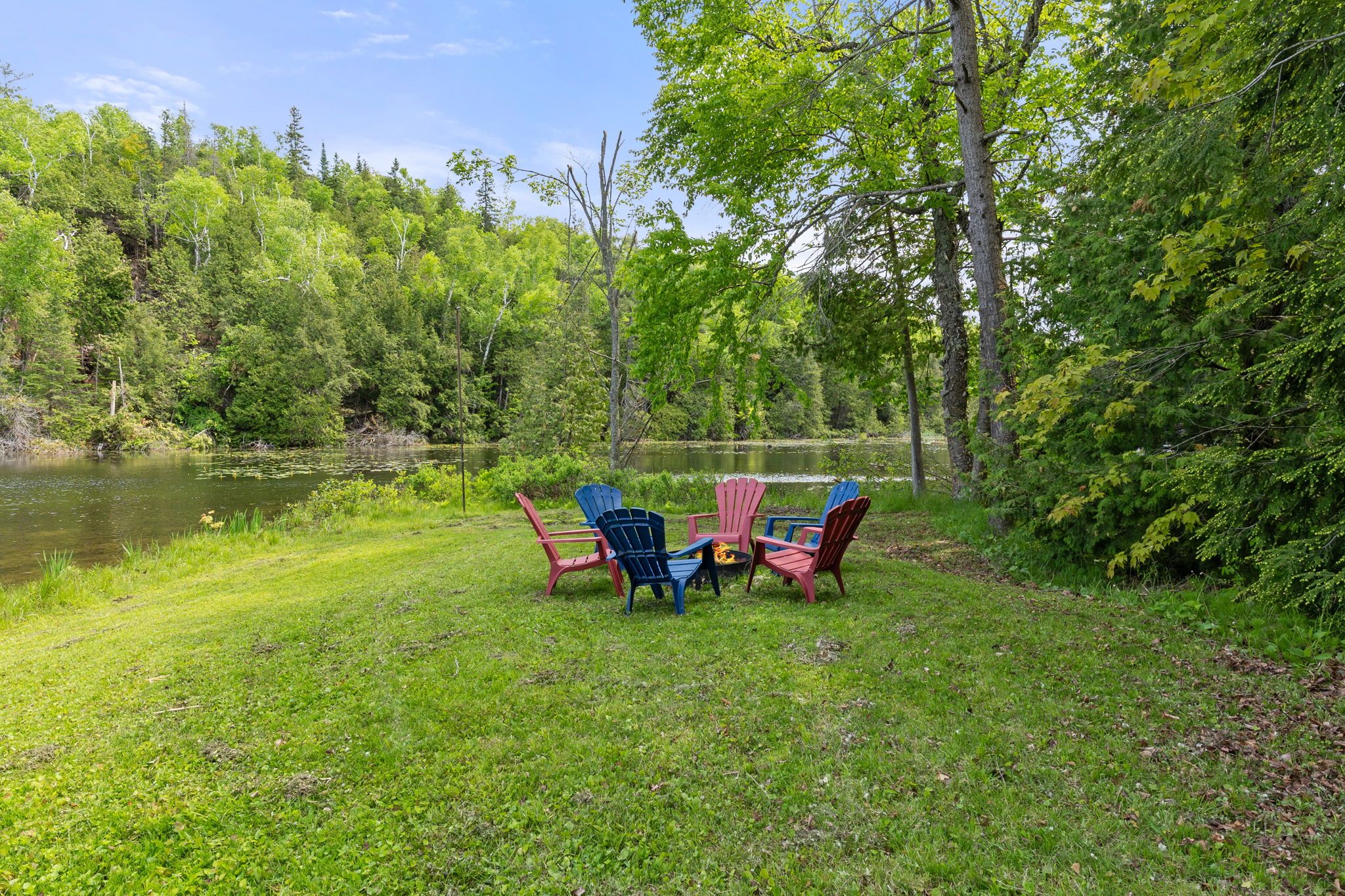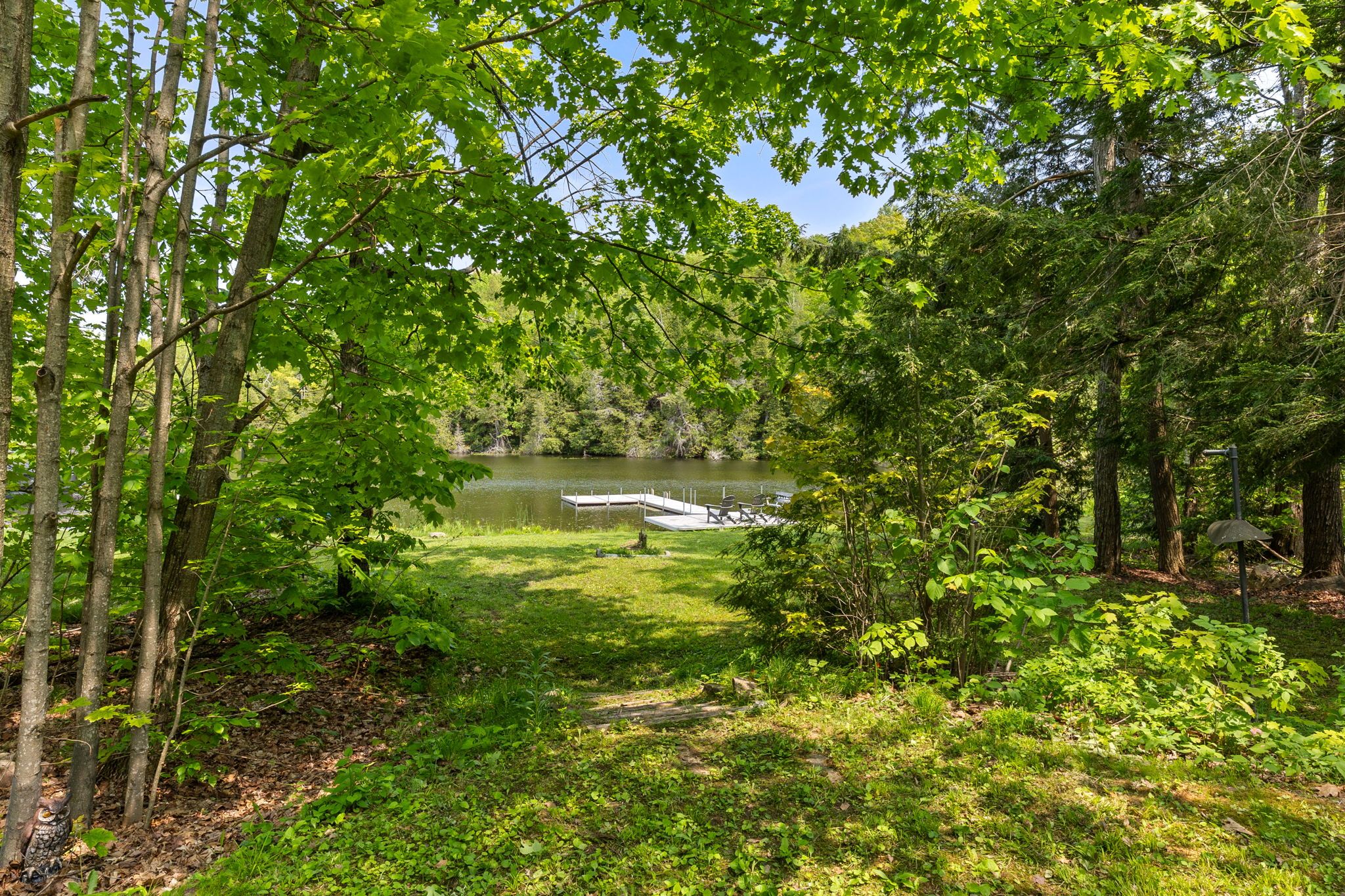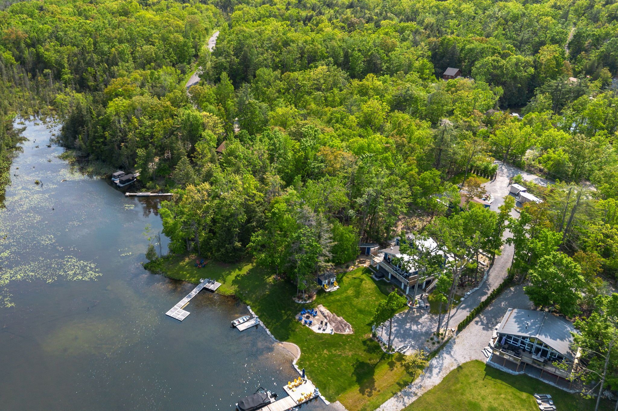 • Private lakeside escape with 150' of shoreline and forest views.