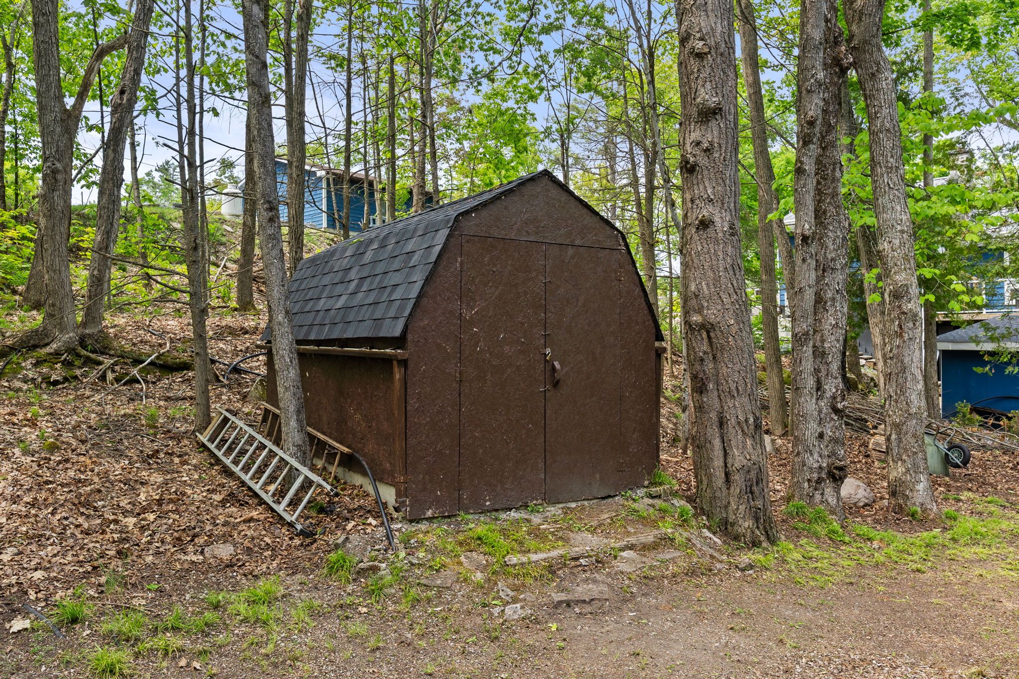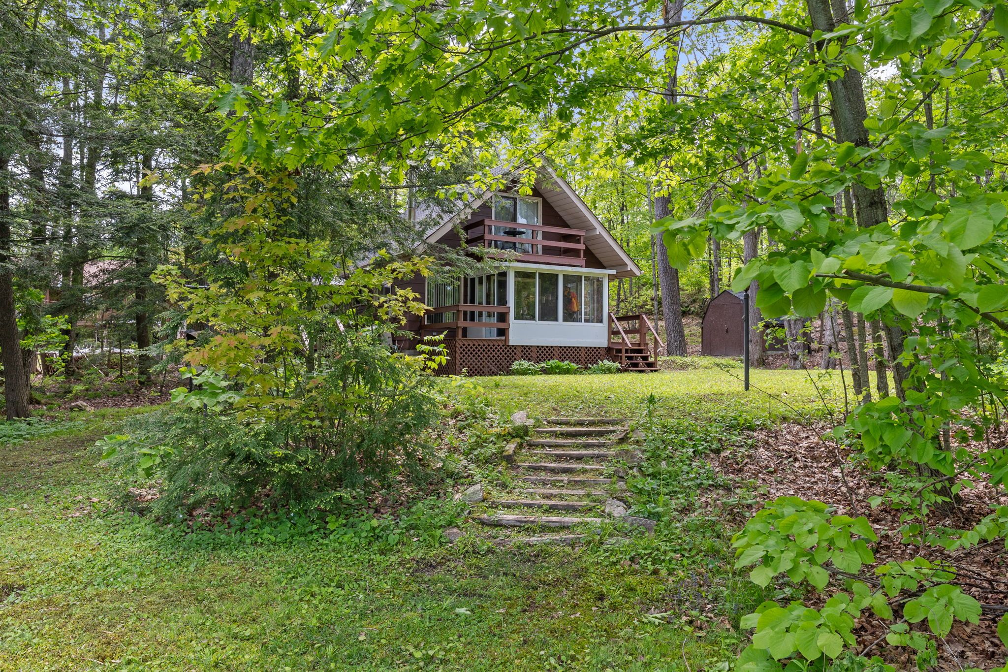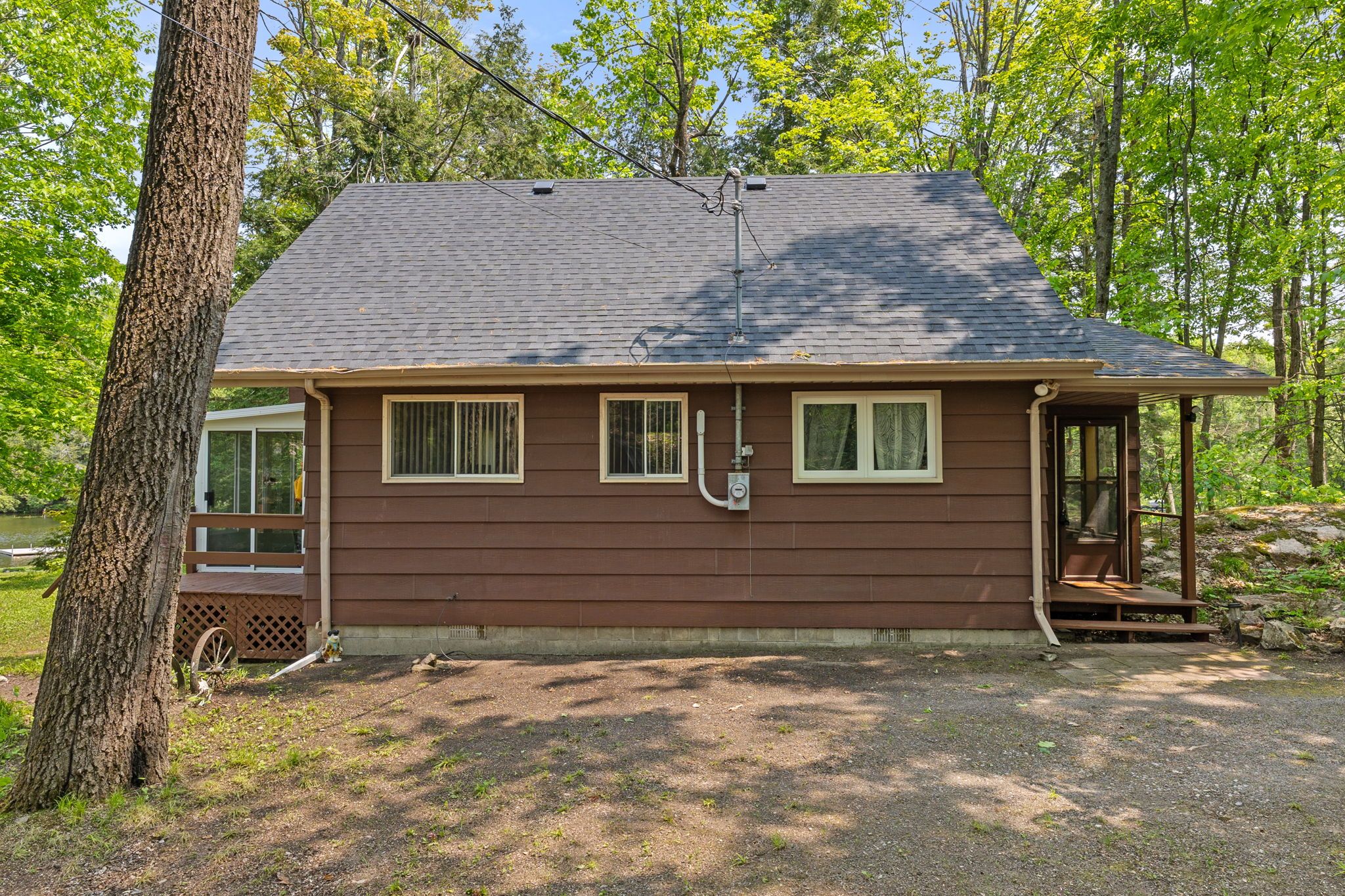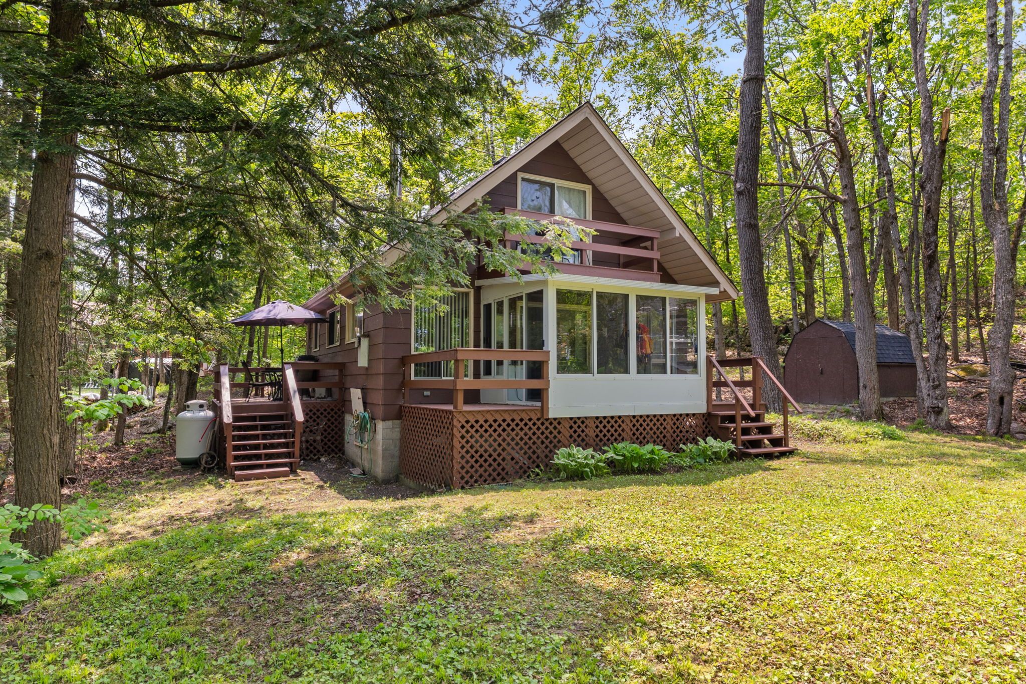 Welcome to a private lakeside escape on big bald lake, part of the sought-after trent-severn waterway, offering access to five lakes without the need for locking. Nestled on a beautifully treed lot with 150' of shoreline, this four-season chalet-style cottage delivers exceptional privacy and a gentle, level approach to the water's edge. Inside, you'll find a warm and inviting open-concept layout with 3 bedrooms and a full 4-piece bath. The kitchen, dining and living areas are accented with rich wood finishes and anchored by a cozy propane fireplace, perfect for year-round enjoyment. A bright glass sunroom captures peaceful lake views, while the spacious deck and dock invite effortless outdoor living. The lakeside primary bedroom features its own walkout balcony, an ideal spot to start your day with coffee overlooking the water. Thoughtful updates include a new water pump and uv system (2024) and a newly reshingled roof (2025), offering added peace of mind. Directly across the lake, 283 acres of privately owned managed forest provide a serene, untouched backdrop. For those seeking a bit of adventure, a nearby jumping rock awaits, while the crystal-clear turquoise waters of sandy lake beach are just minutes away for exceptional swimming and paddling.