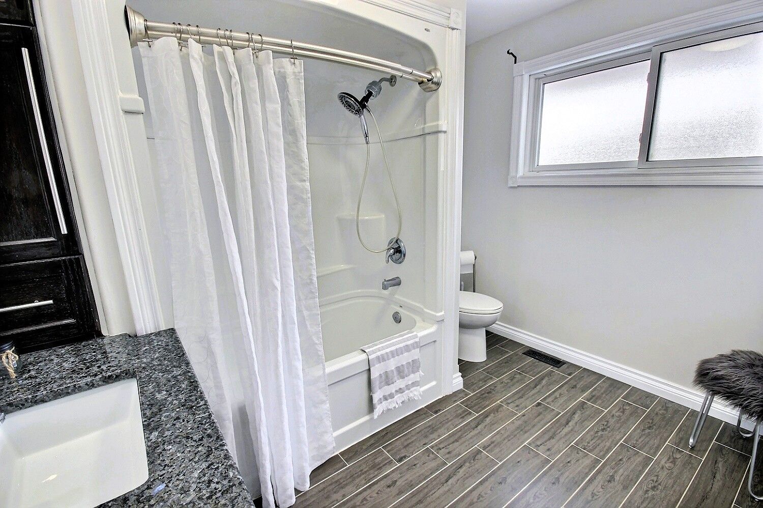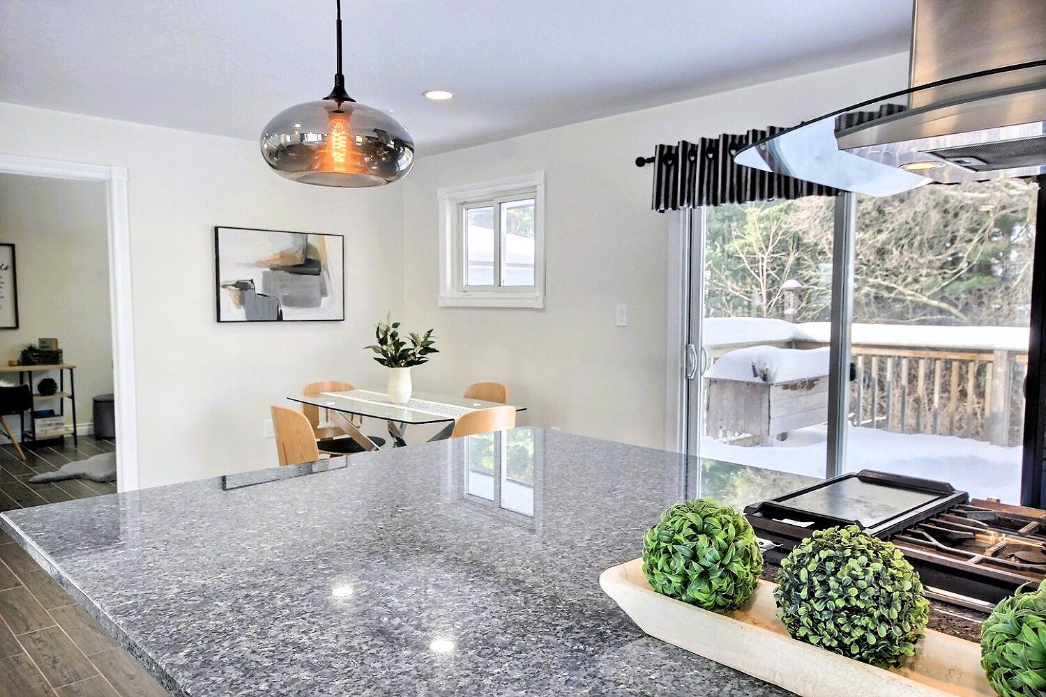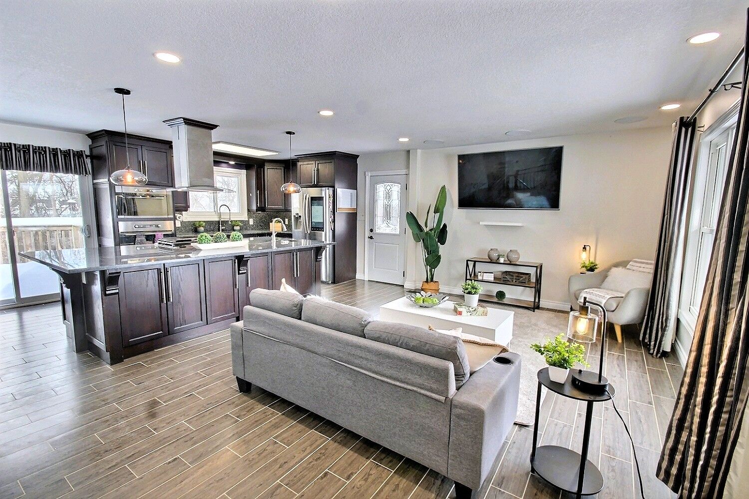 Welcome to this nicely upgraded, comfortable, open concept bungalow with a fully walkout basement. The main level showcases a bright open-concept area perfect for family, friends gatherings. The kitchen boasts richly toned silent-close cupboards, wall oven, 10x5 granite island/bar, ideal for casual dining and socializing which overlooks the impressive family room with a large picture window, easy clean wood grain flooring, built-in surround sound speakers. Slider doors that lead to a deck that overlooks the rear yard backing onto mature trees, perfect for outdoor gatherings and baroques. Enjoy! Also on the main level is generous main washroom with laundry facilities eliminating the need to venture downstairs. The lower level has been stripped clean, painted and ready for your customization, featuring an intact 3-piece washroom and plumbing for a kitchenette/bar area, allowing you to create additional rooms or maintain an open-concept feel. This home offers both comfort and versatility for modern living. Truly delightful.