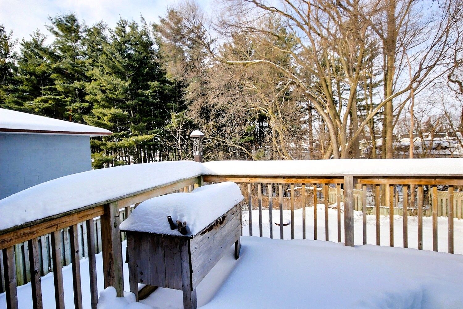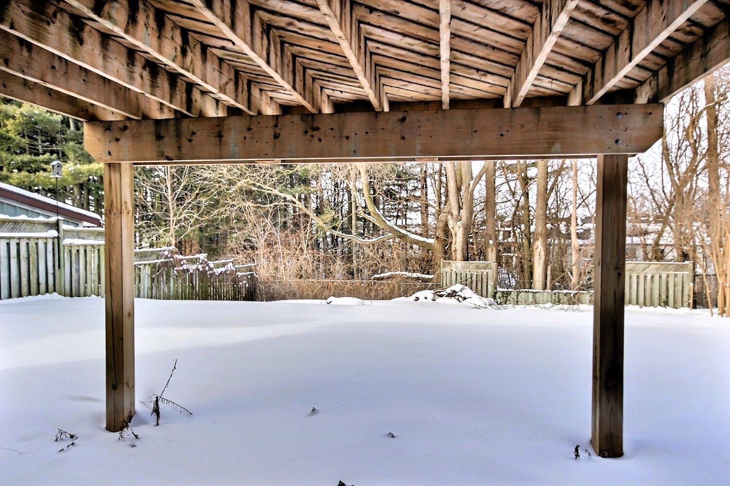 • Deck overlooks a yard with mature trees, ideal for outdoor fun.