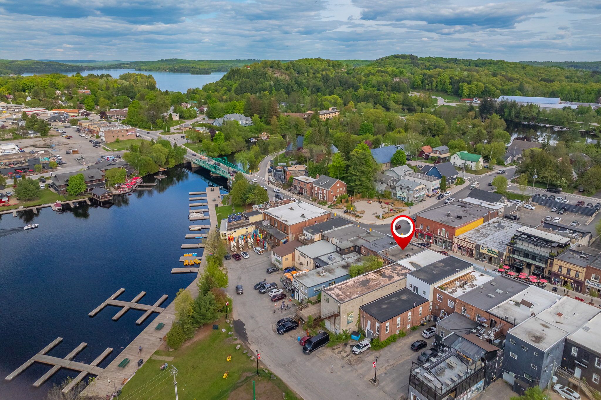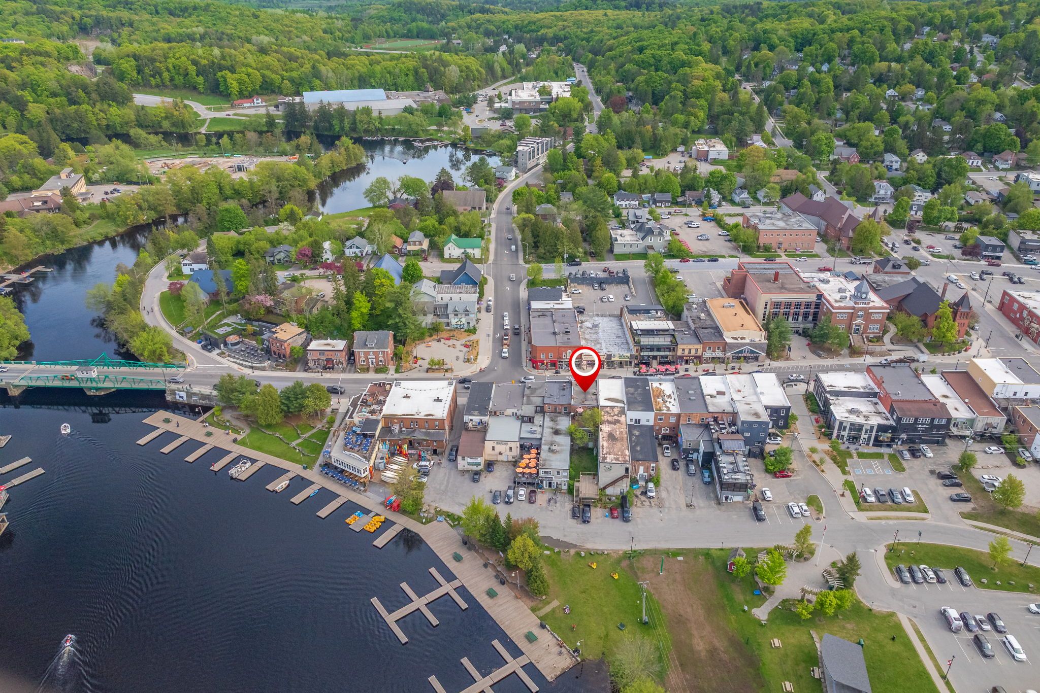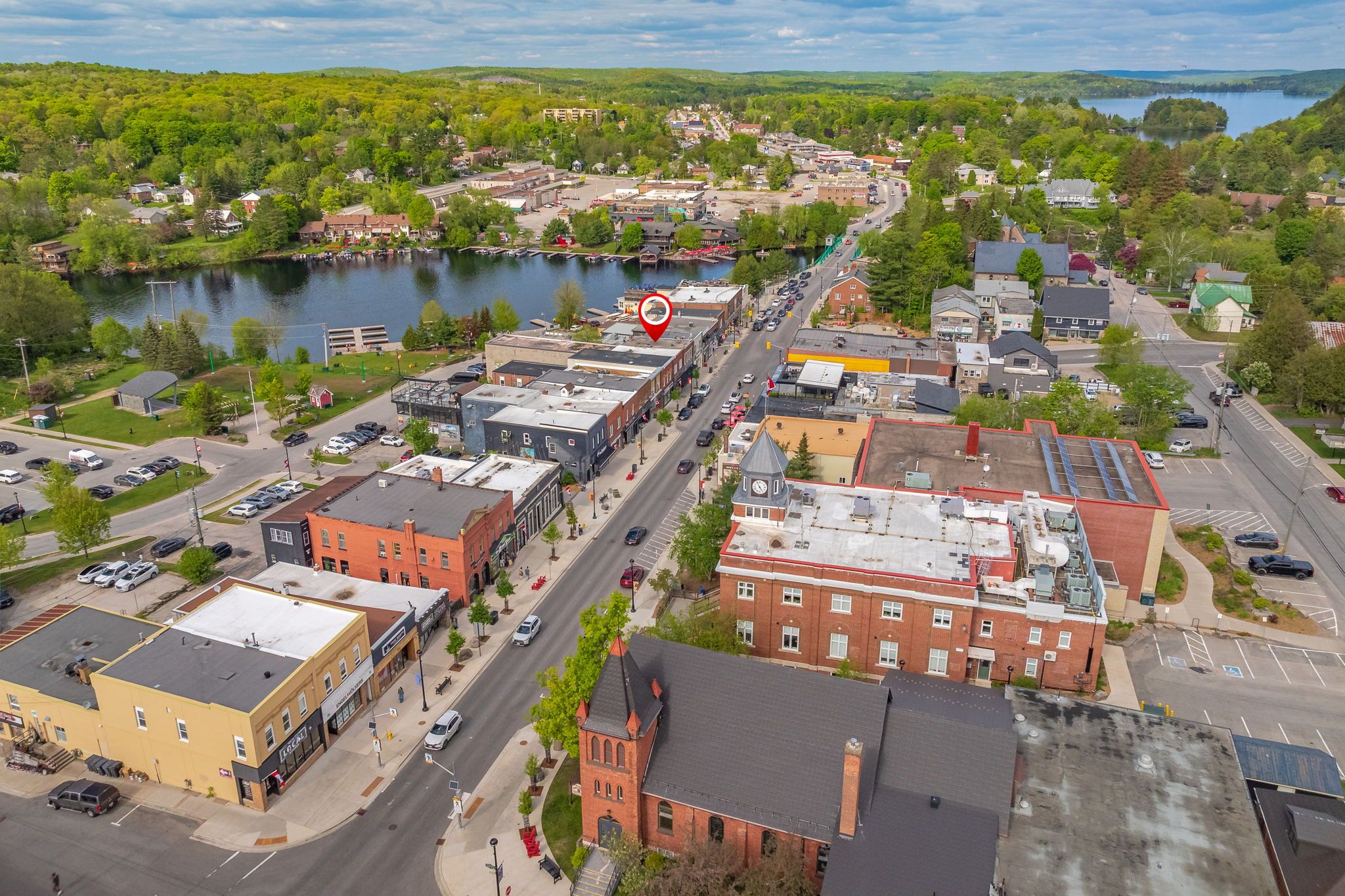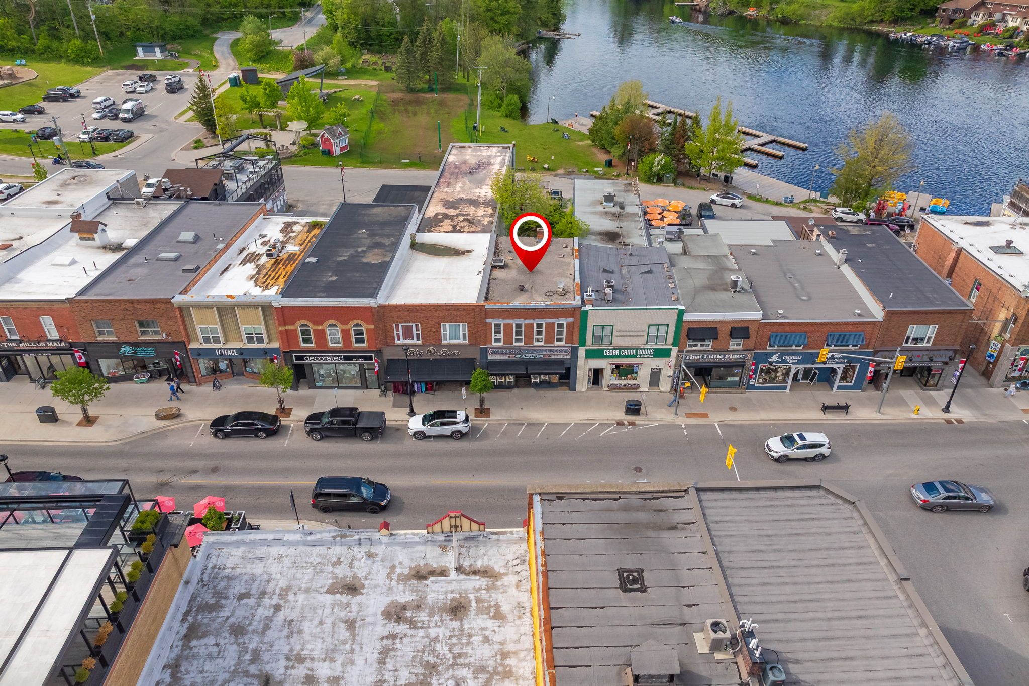 Prime downtown commercial building with a beautiful 2-bedroom upstairs apartment with separate entrance, and just a few steps from the muskoka river! Own a piece of prime real estate in the heart of downtown huntsville adjacent to the stunning muskoka river and town docks. This beautifully maintained, two-story commercial/residential building offers the perfect combination of business potential and stylish living space. Whether you're an investor, entrepreneur, or someone seeking a live/work lifestyle, this property is a rare find. The main floor commercial space offers a high-visibility storefront with large display windows, 1400 square feet of flexible retail/office space, a modern, open layout, and access to the full, unfinished, walk-out basement which opens onto a large undeveloped rear yard offering further expansion potential. The upper floor boasts a stunning 2-bedroom, 1-bath apartment accessed by a private entrance, with loads of natural light, a modern kitchen with stainless steel appliances, large living room, and a fabulous rooftop patio off the kitchen with views over the muskoka river; perfect for morning coffee or sunset evenings. This incredible package offers high foot traffic, a visually striking storefront close to a controlled intersection so people can window shop from their vehicles, a strong local business community, walking distance to parks, restaurants, shops, entertainment and more. Come explore the seemingly endless potential for both residential and commercial income, or the convenience of owner-occupied business location. Don't miss this rare opportunity to own a character-filled downtown building in the heart of huntsville with built-in income potential and incredible lifestyle appeal. **building and land for sale only. Total square footage includes basement (3965 sq. Ft)
