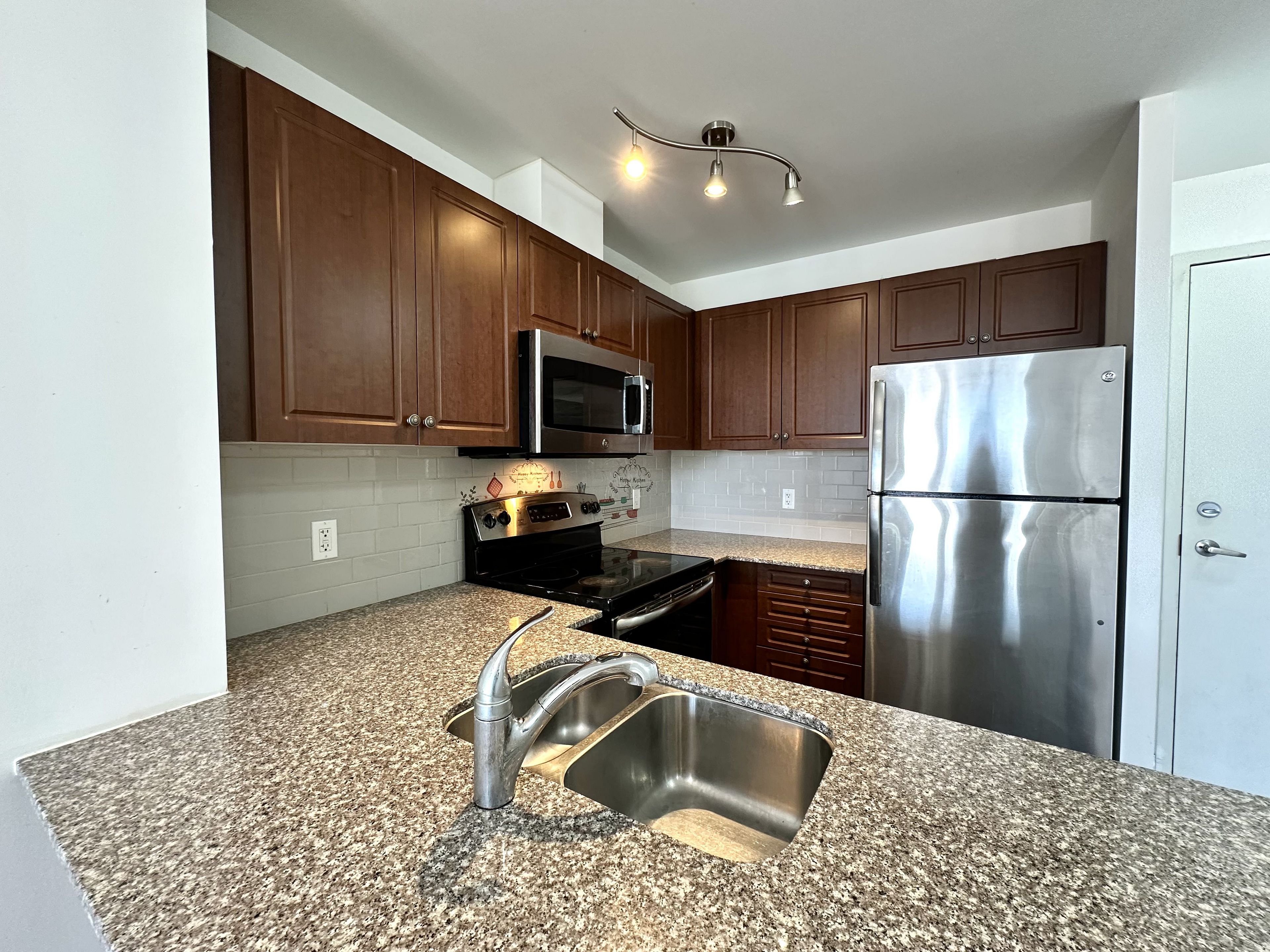 • Spacious kitchen features granite counters and stainless steel appliances.