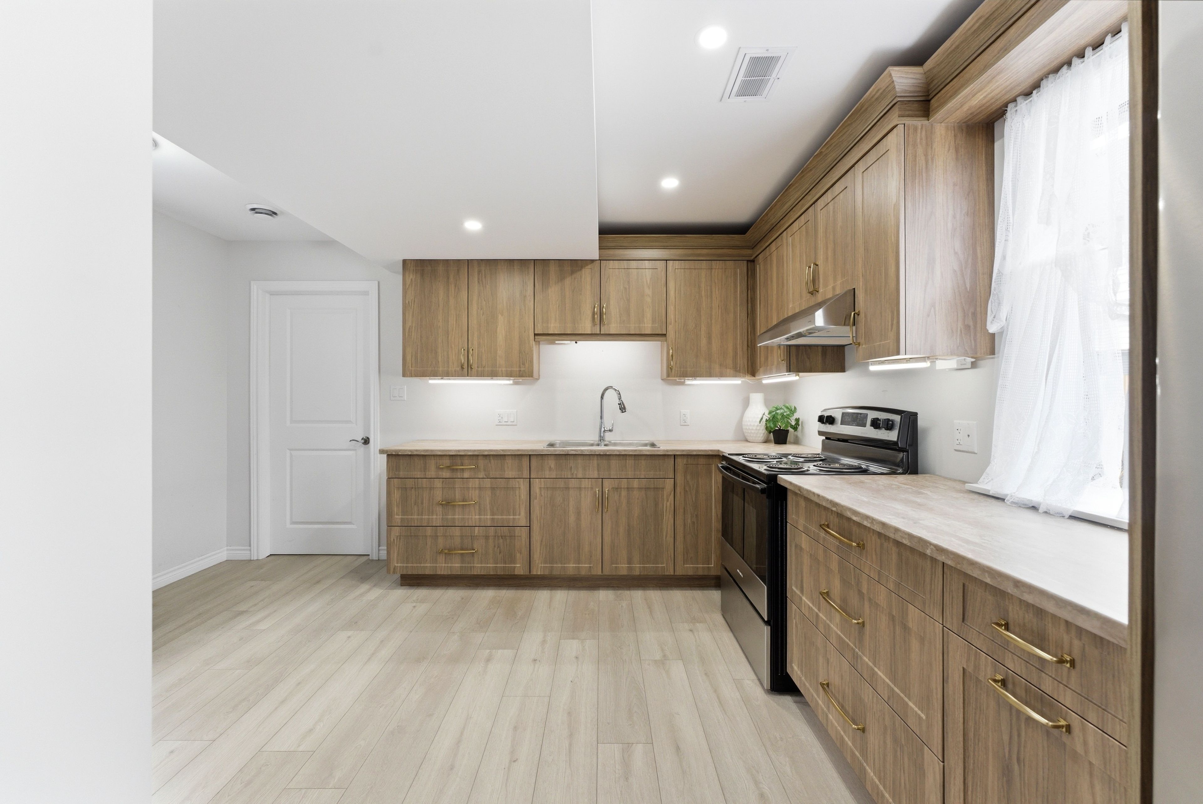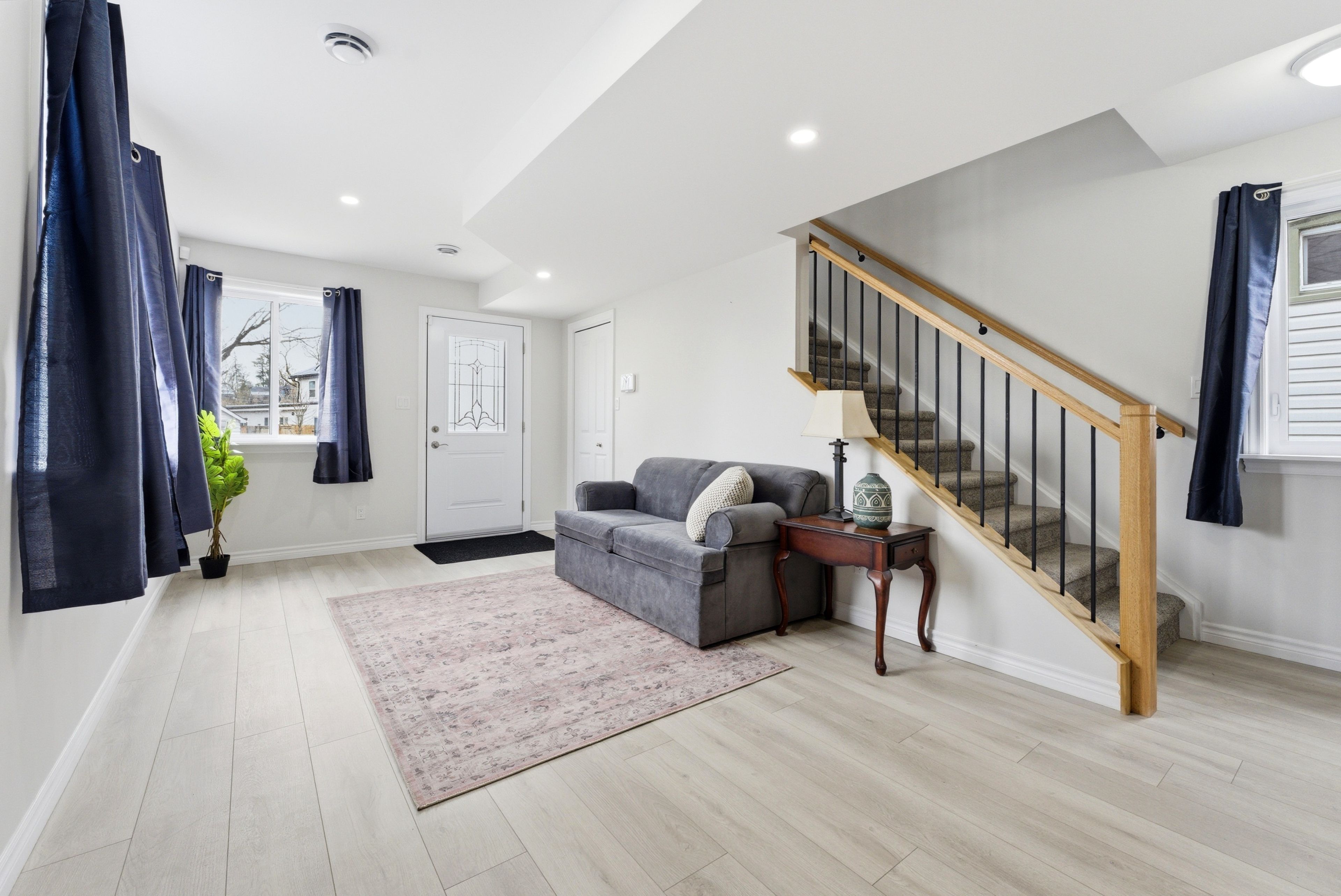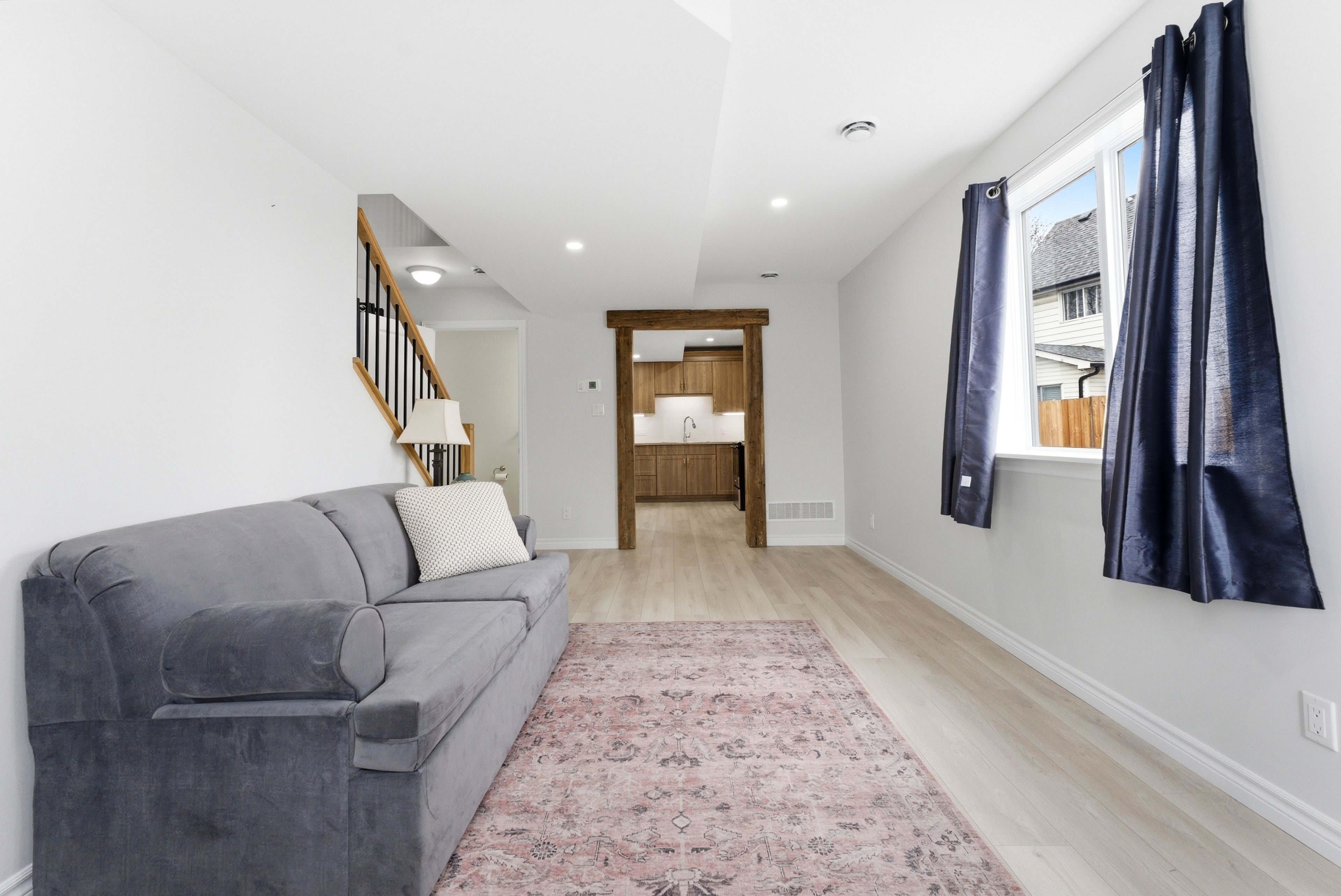 • Spacious living room flows into a stylish kitchen with ample cabinetry.