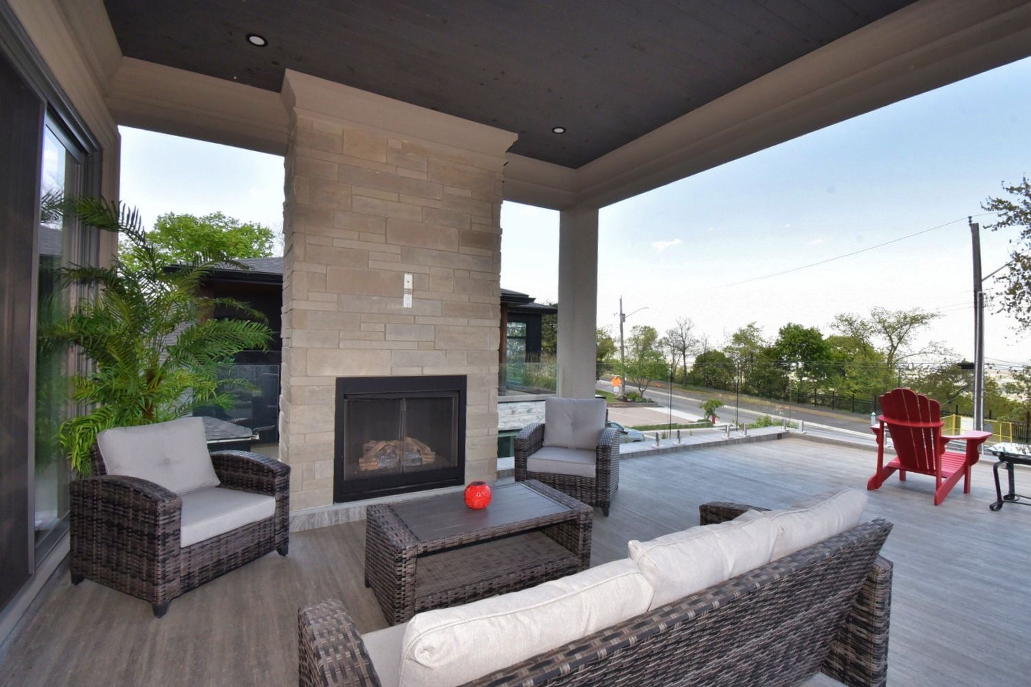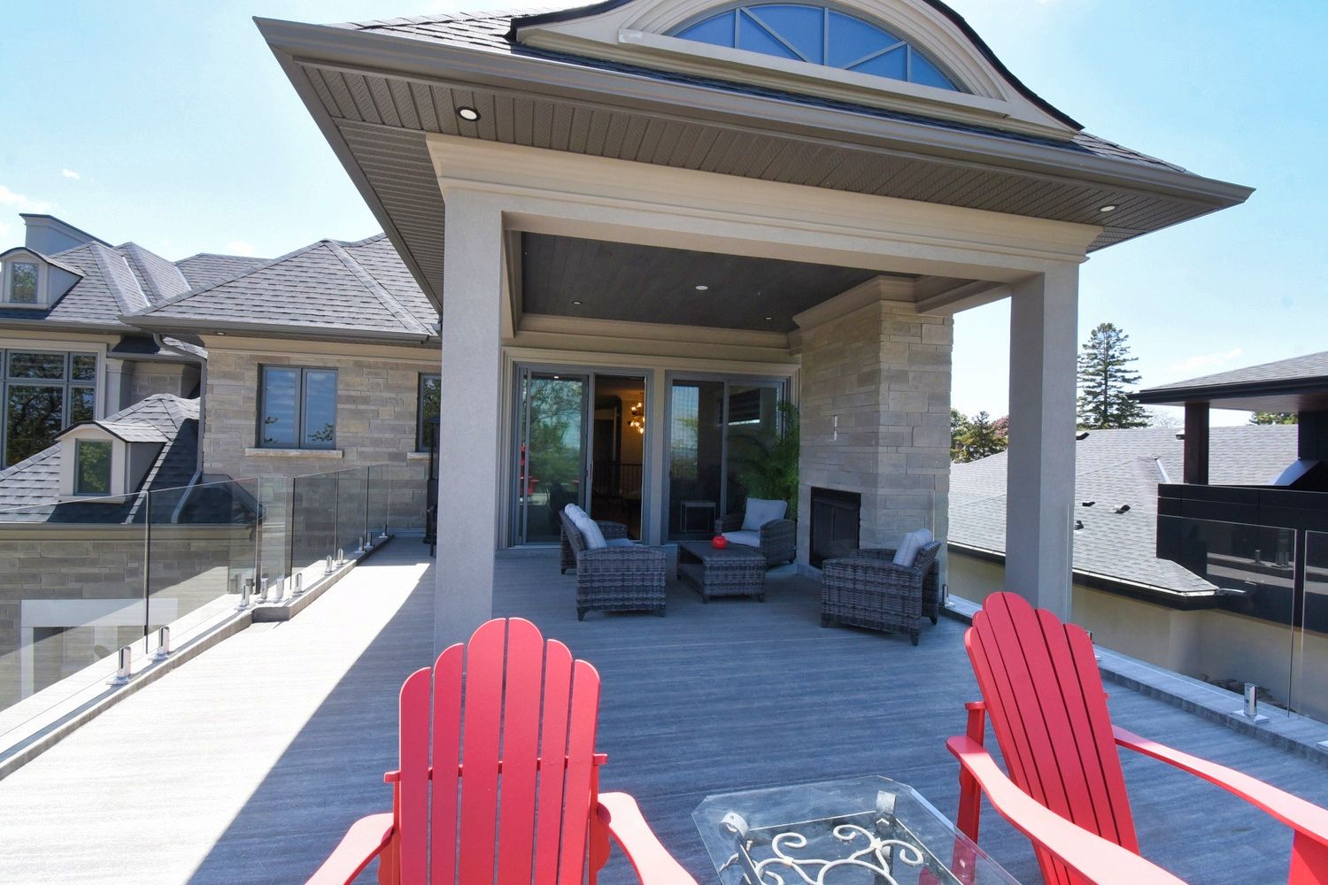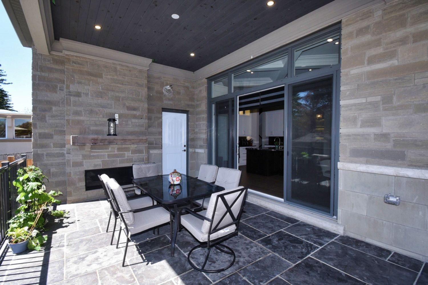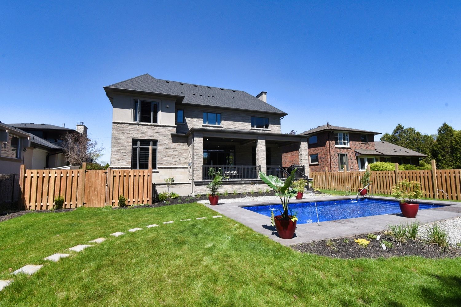 • Backyard oasis with saltwater pool, outdoor fireplace, and two-piece bath.