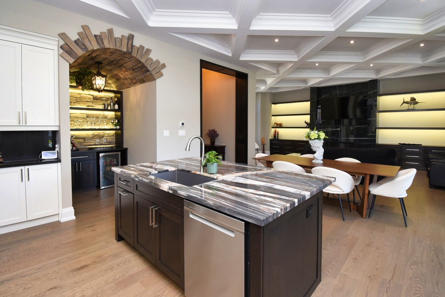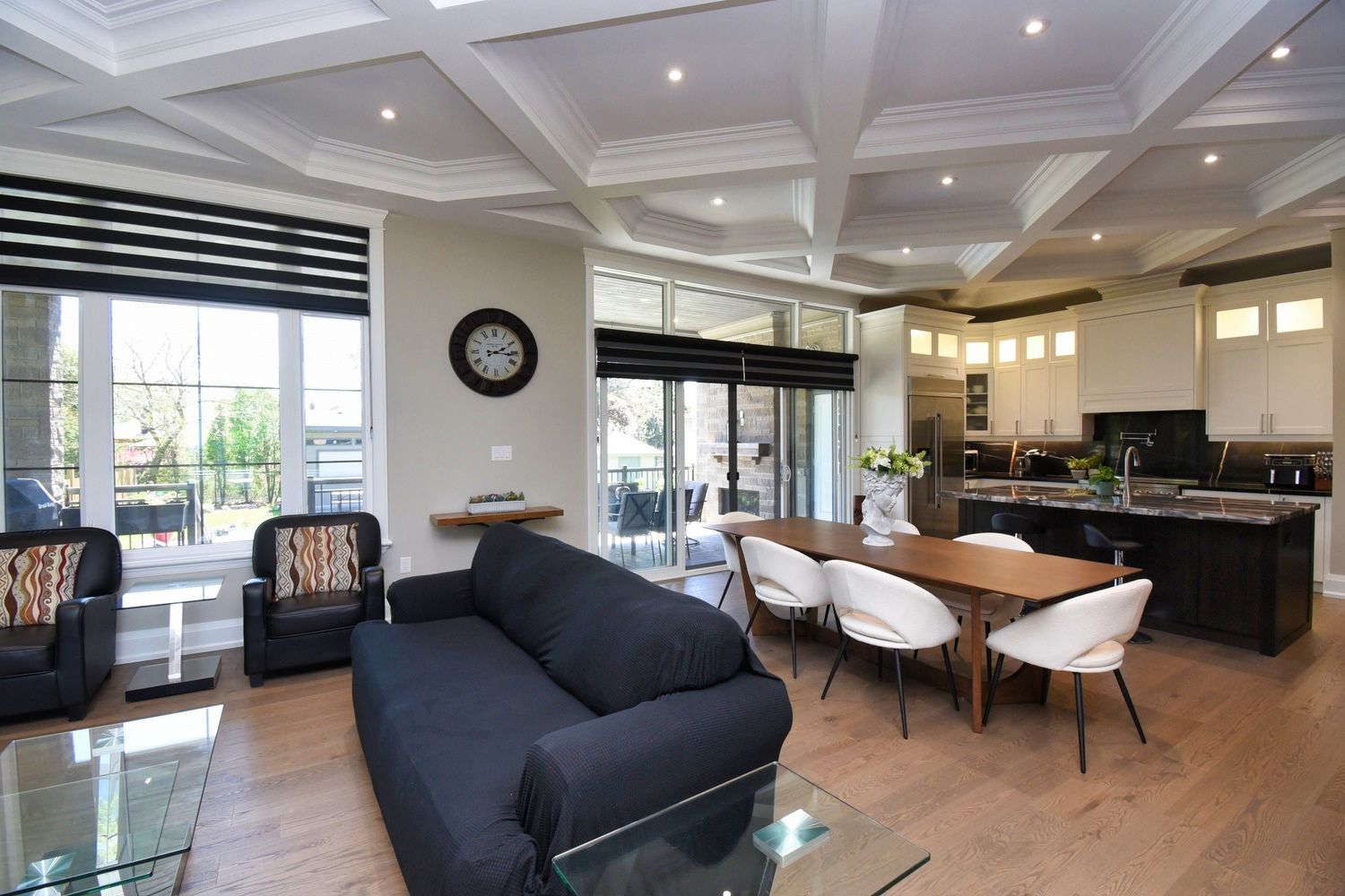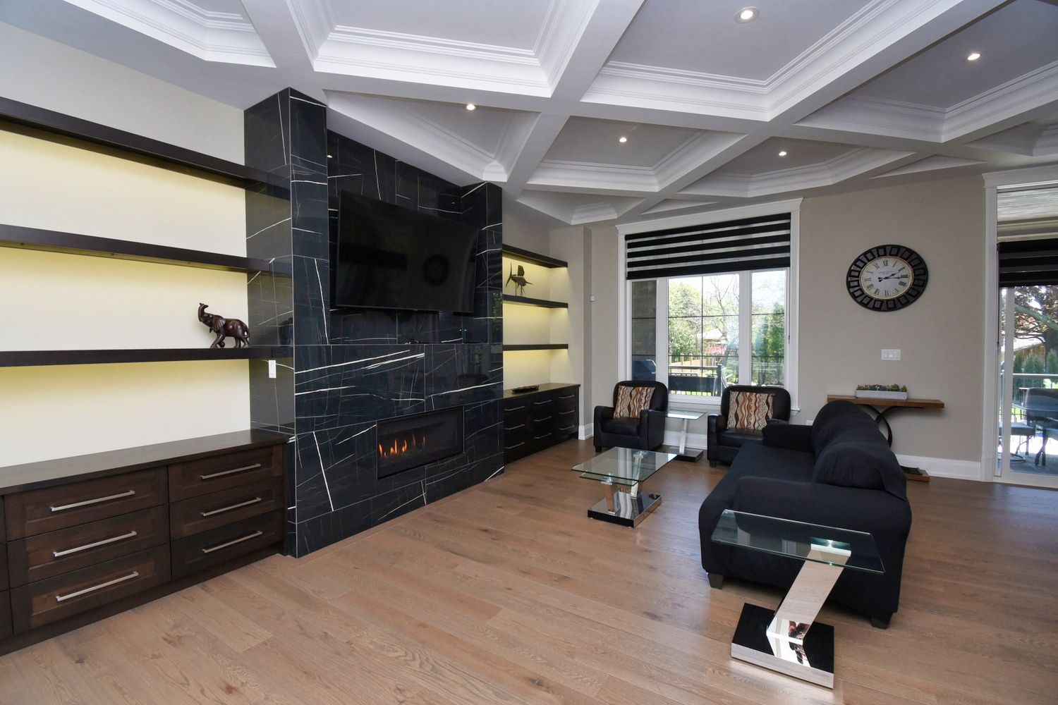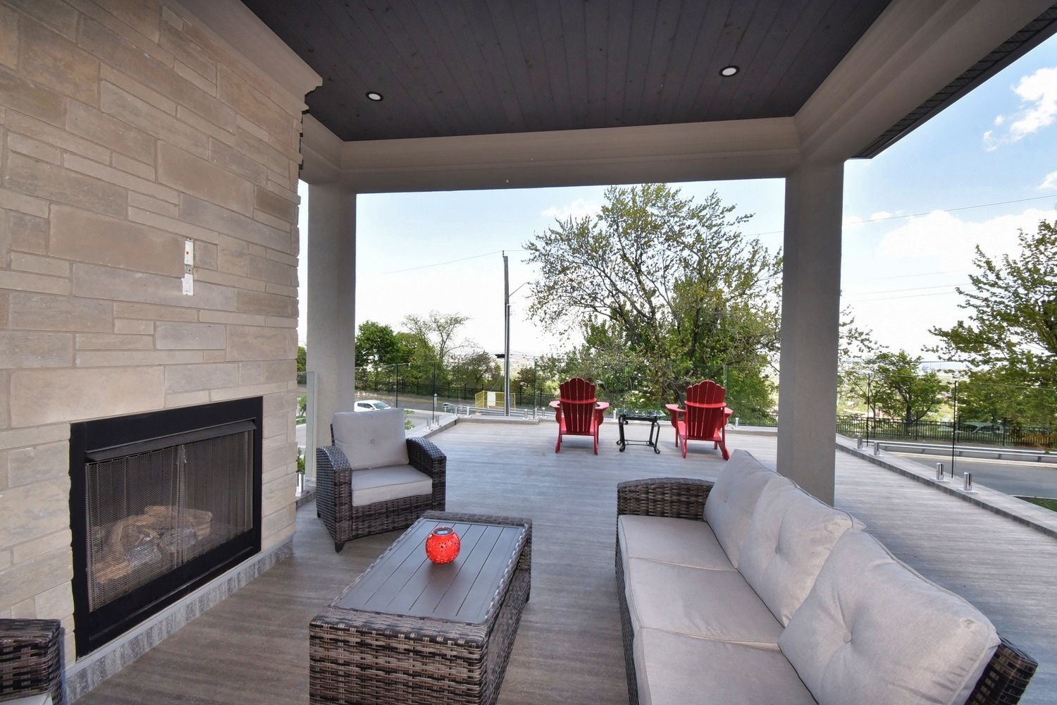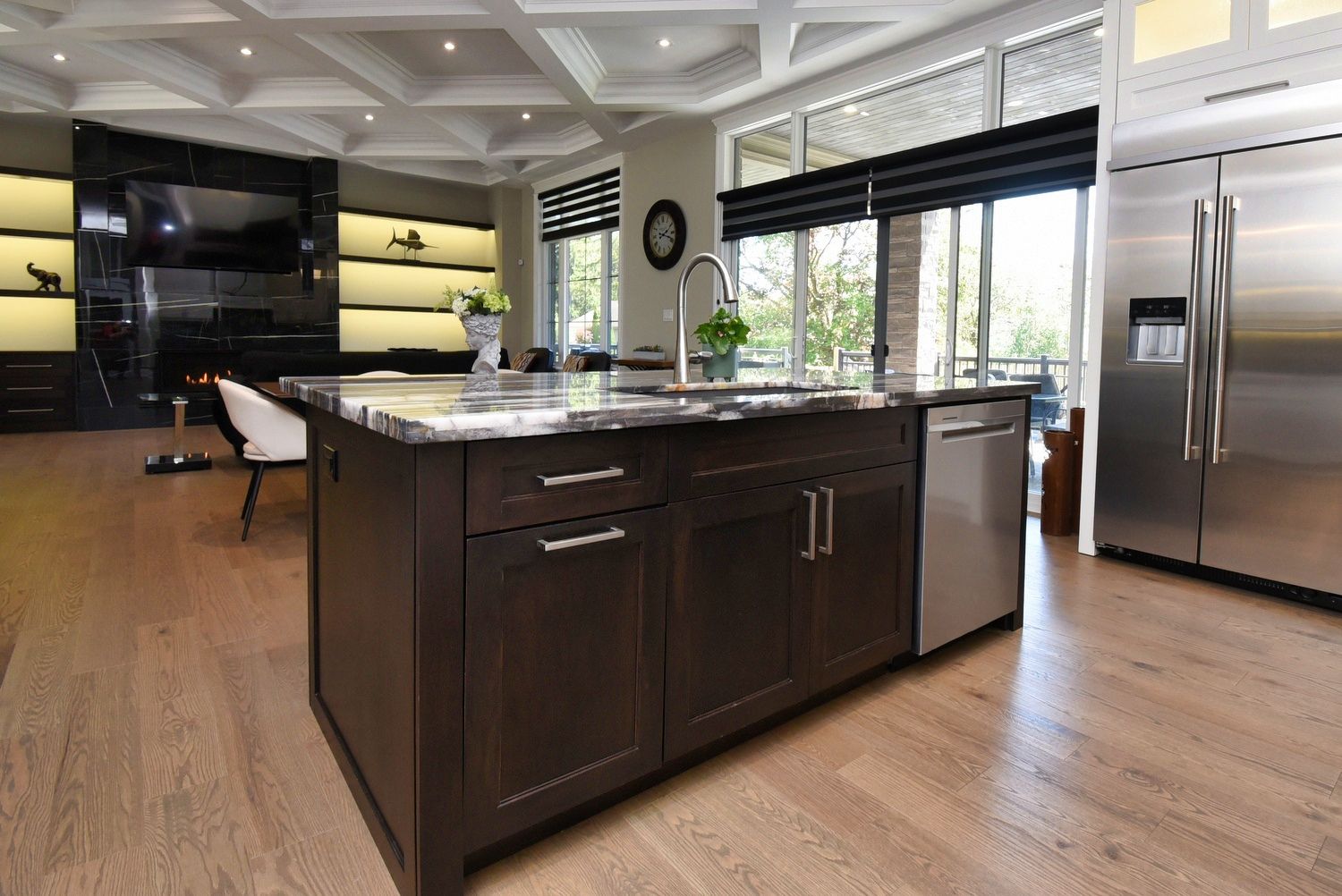 • Backyard oasis with saltwater pool, outdoor fireplace, and two-piece bath.