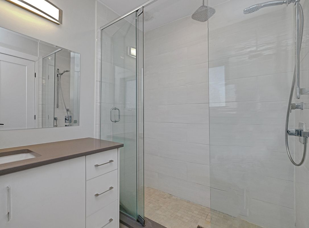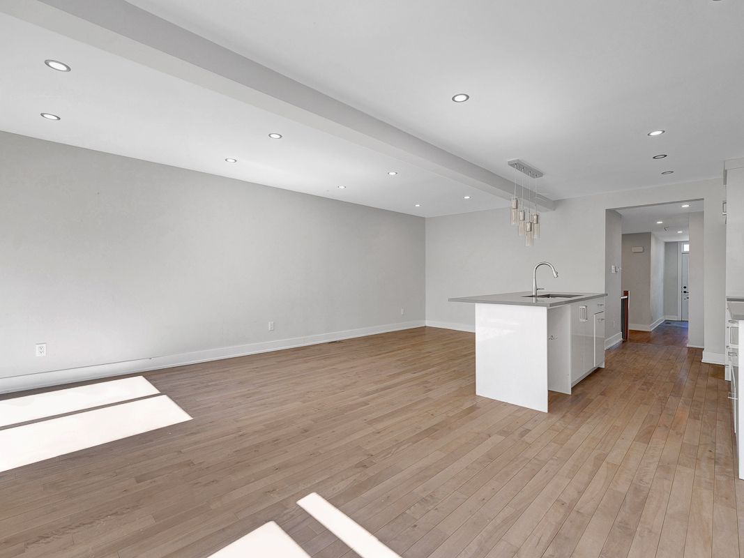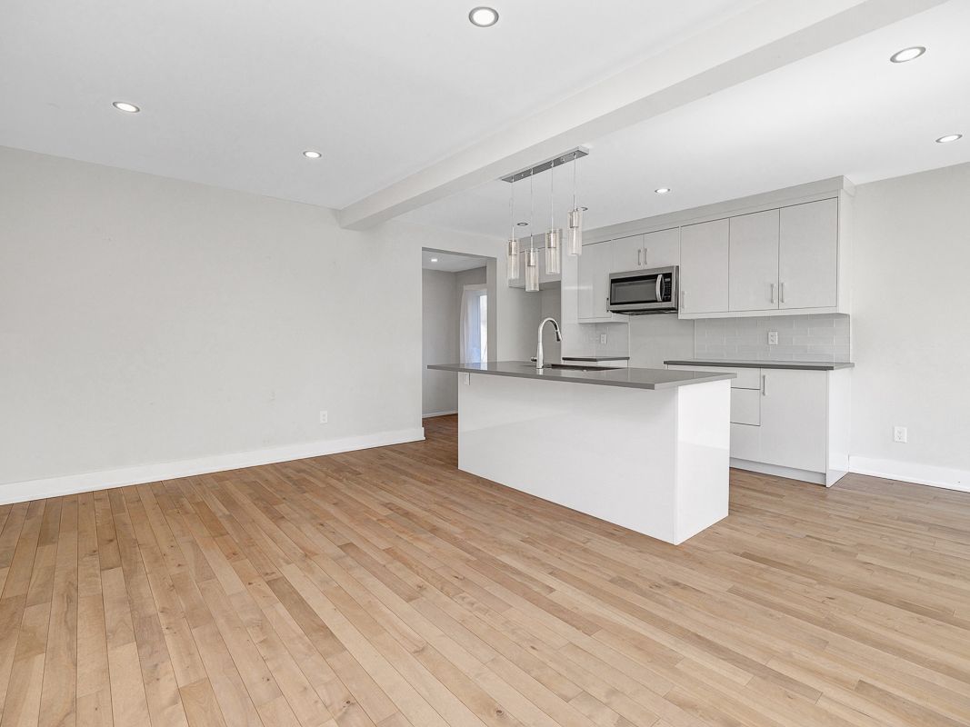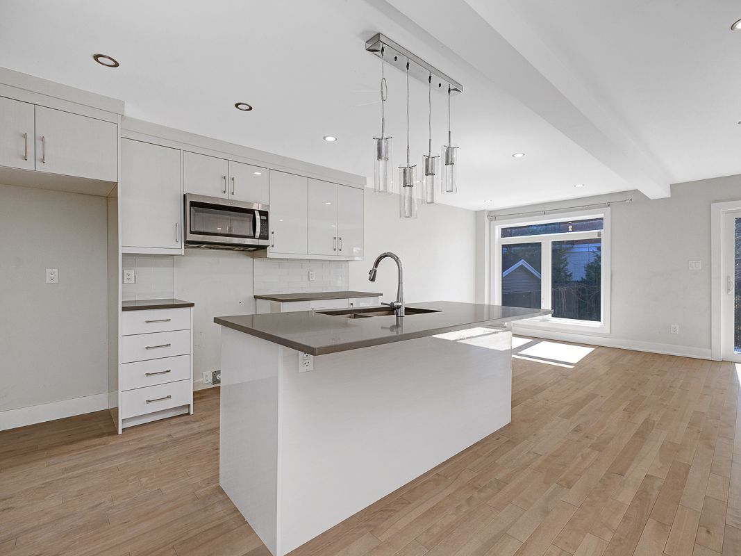 • Modern open-concept kitchen with stylish quartz countertops and breakfast bar.