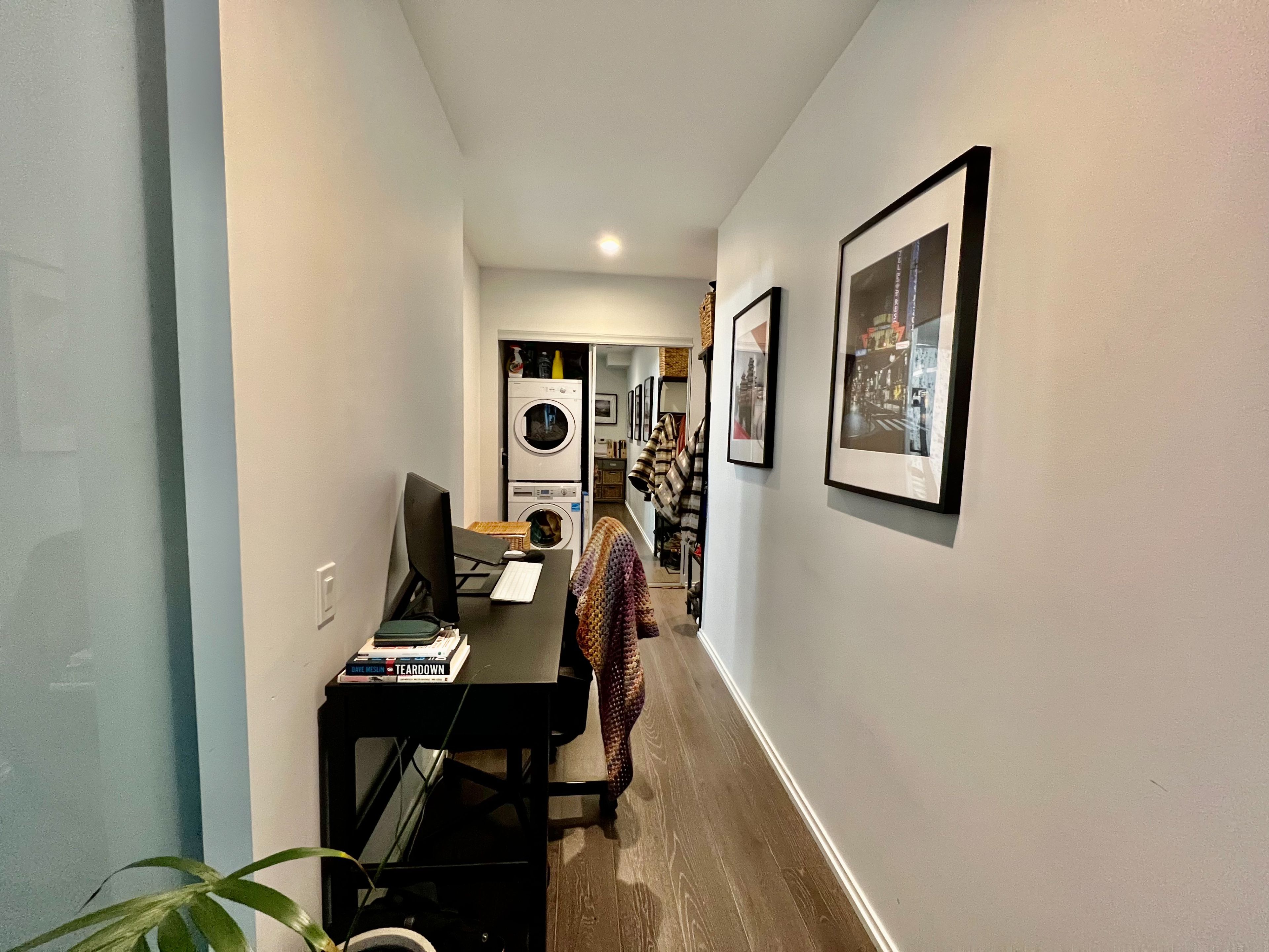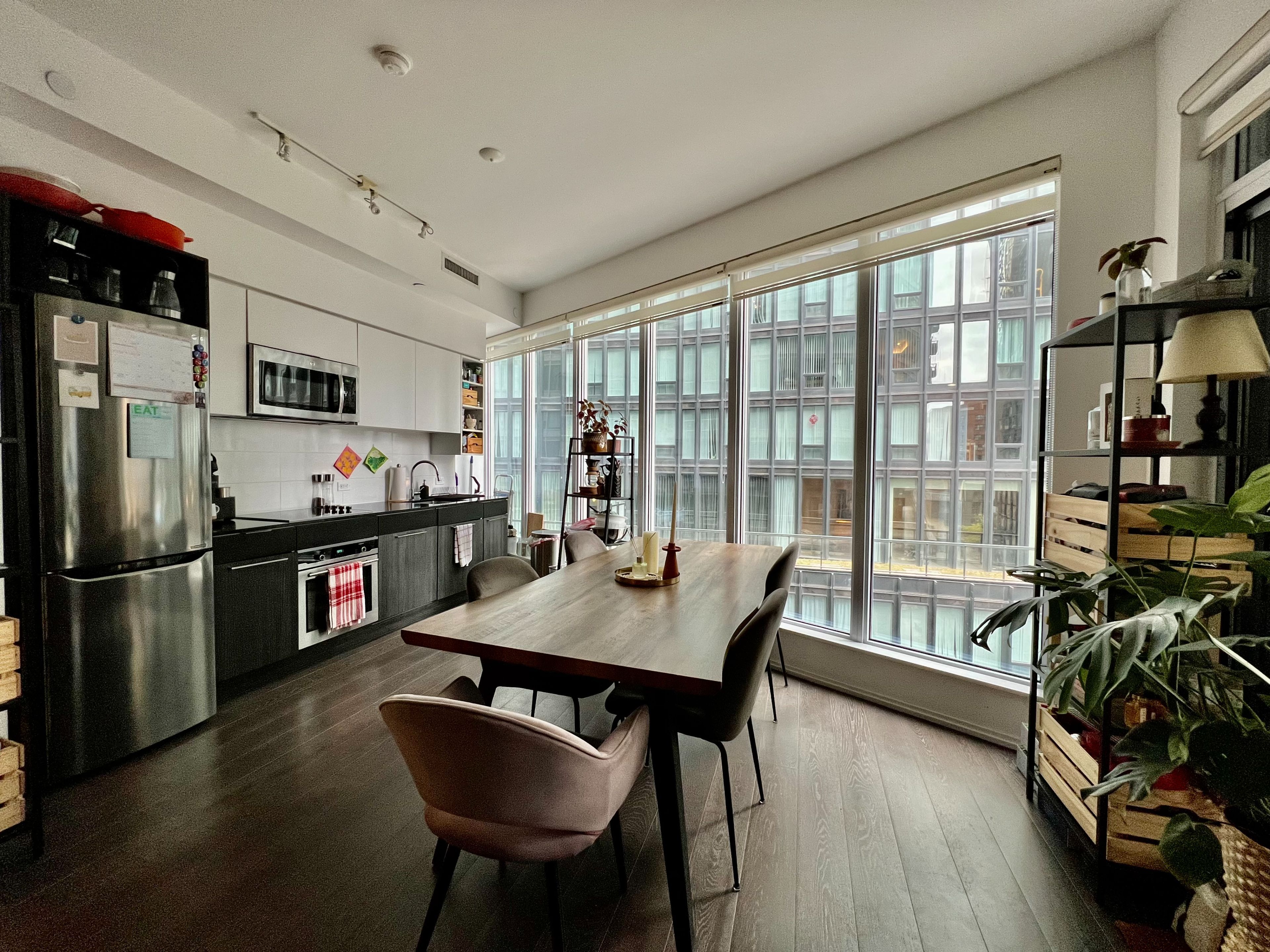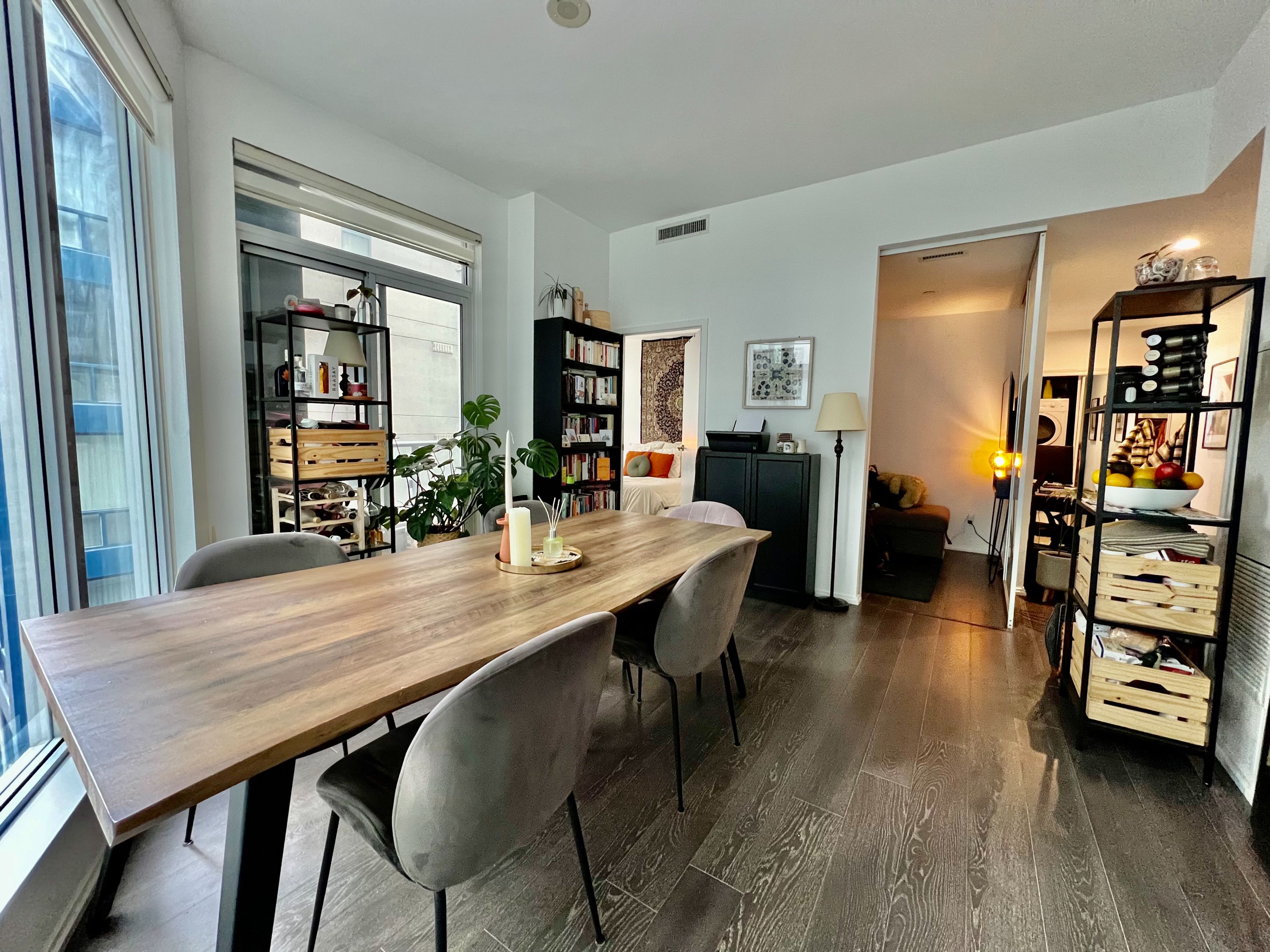 • Bright interior with floor-to-ceiling windows and laminate flooring.