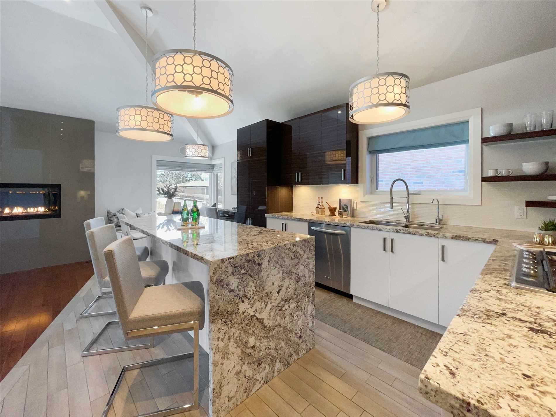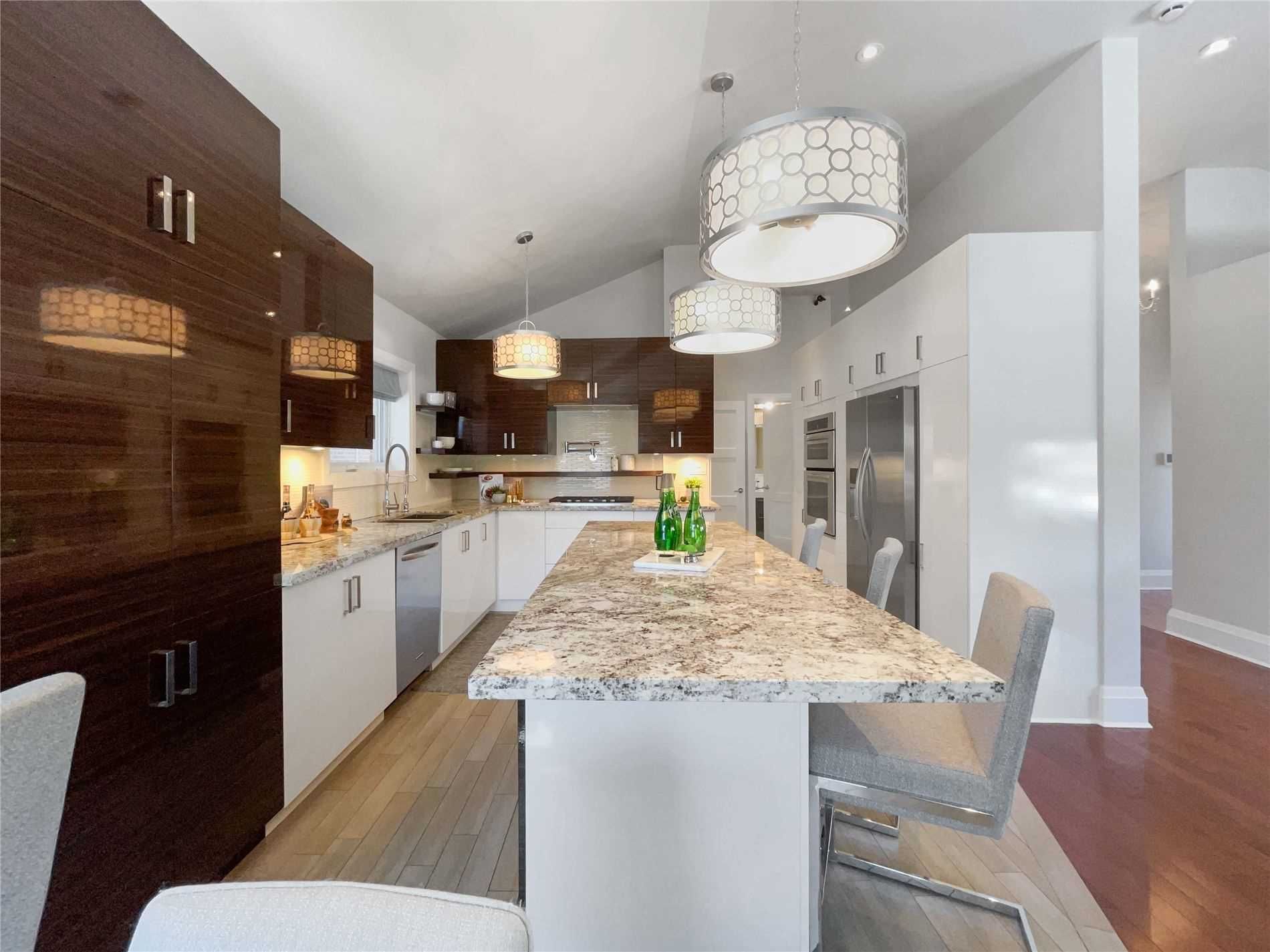 Stunning fully renovated ranch-style bungalow in the prestigious bayview village community. This exceptional home offers a seamless blend of modern design and everyday luxury, highlighted by soaring vaulted ceilings and a beautifully appointed open-concept living and dining area-perfect for both entertaining and comfortable family living. The fully finished lower level, complete with a separate entrance, presents incredible flexibility with in-law suite or private office potential. Thoughtfully designed with high-end features throughout, including a double-car garage, two fireplaces, two full kitchens, and a built-in sound system. The expansive primary retreat serves as a true sanctuary, featuring a spa-inspired 5-piece ensuite and a custom walk-in closet with built-in organizers. Offering excellent versatility, the layout also provides the potential to easily convert the home into a 3-bedroom residence to suit growing families or changing needs. Less than a 5-minute walk to bessarion station, with quick access to highway 401 and the dvp, surrounded by scenic ravines, and located within the highly sought-after school catchments of elkhorn public school and earl haig secondary school.