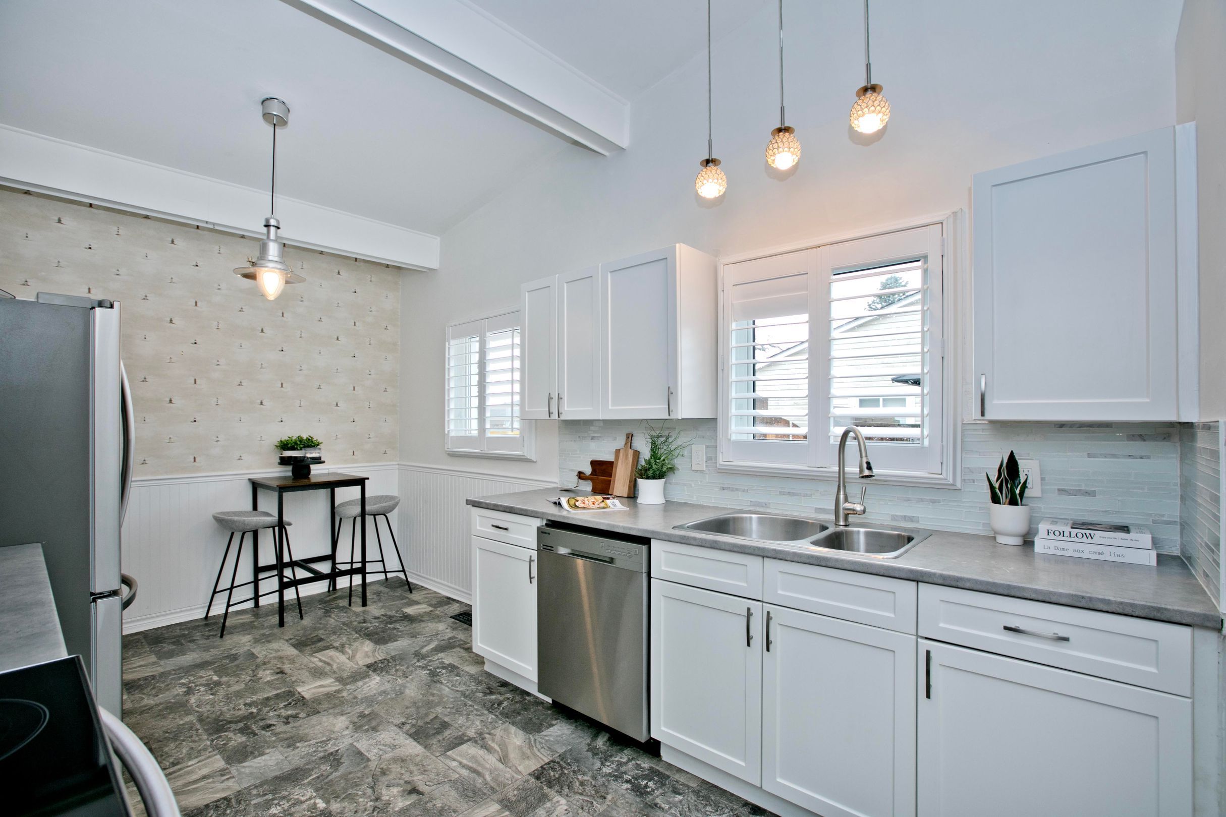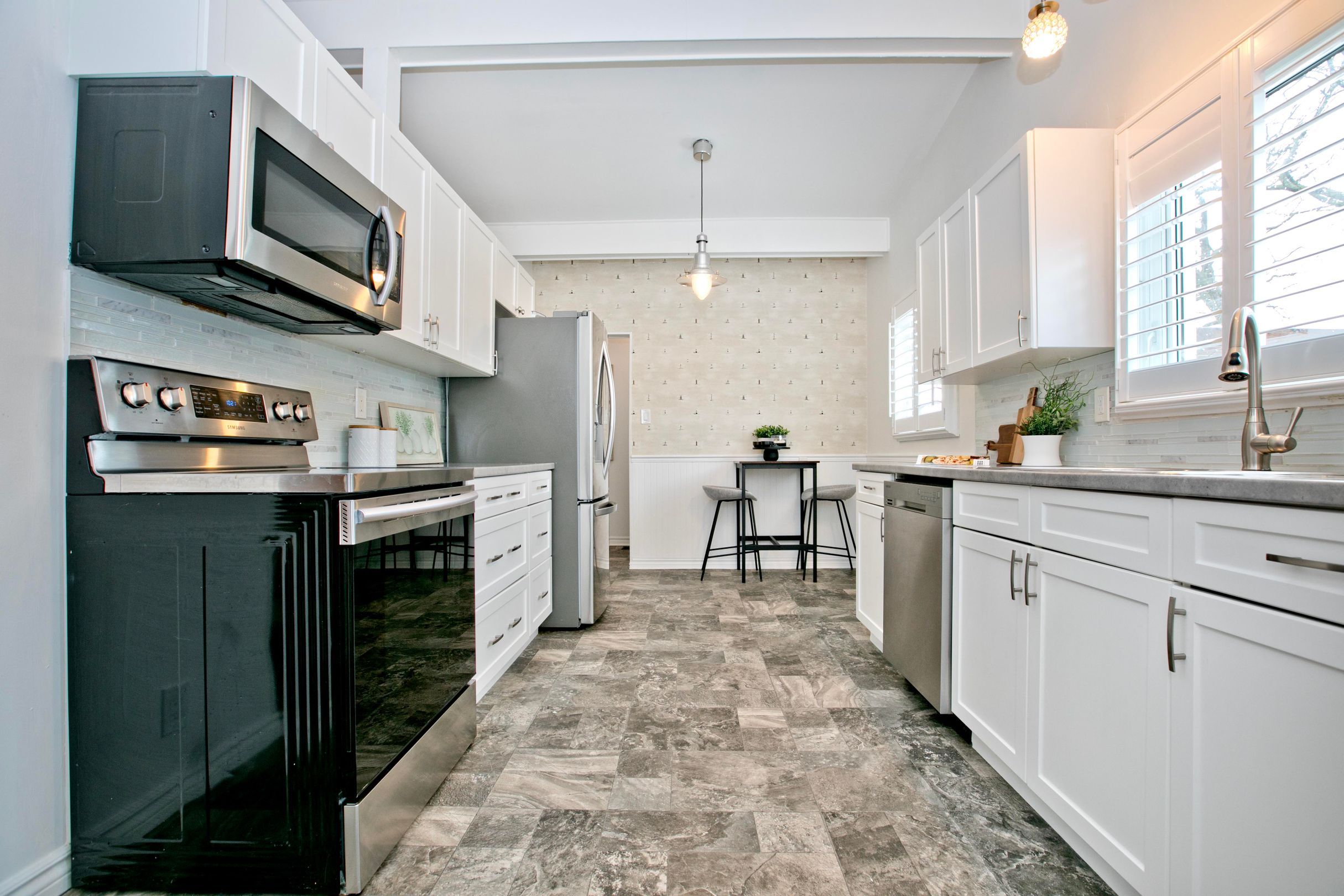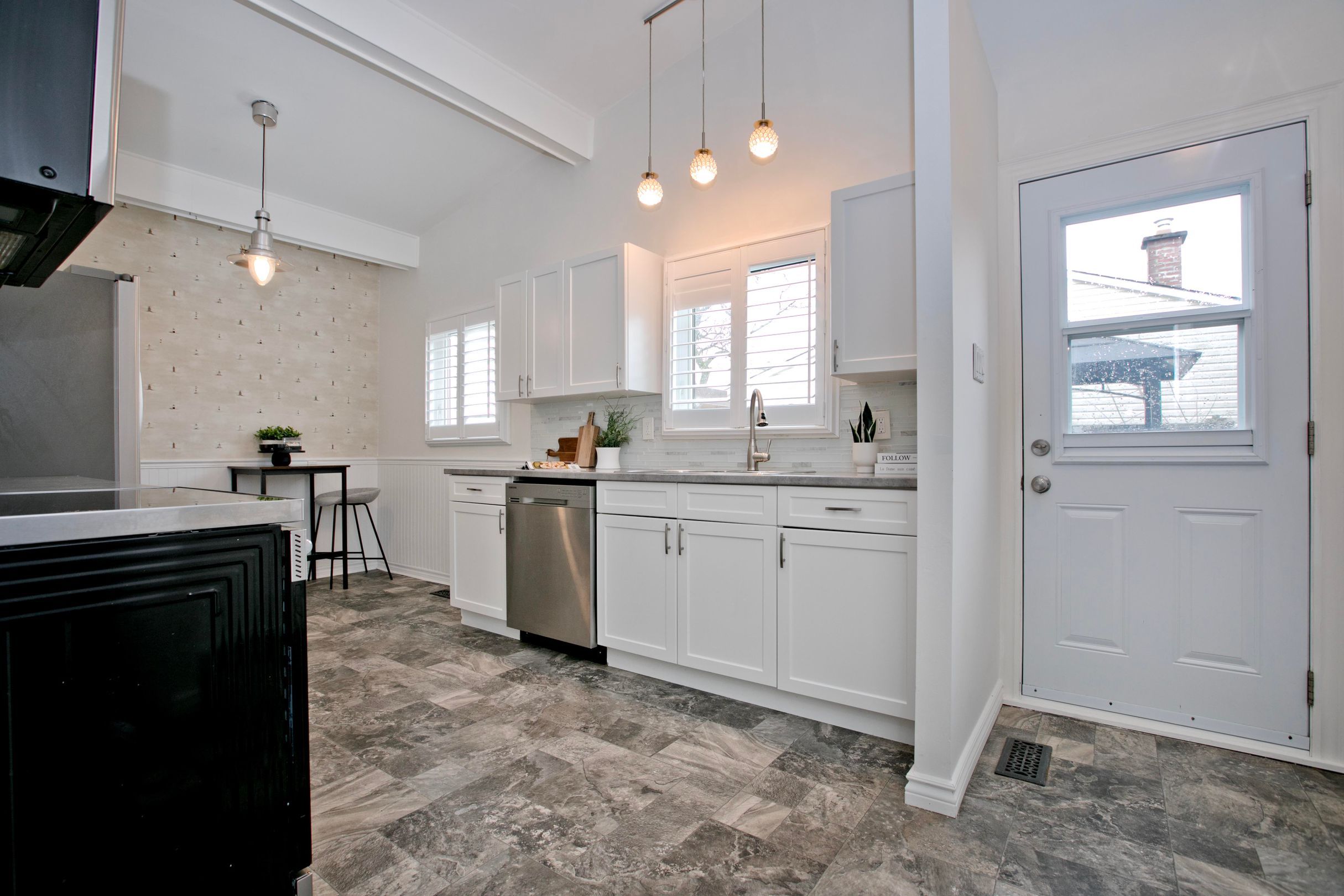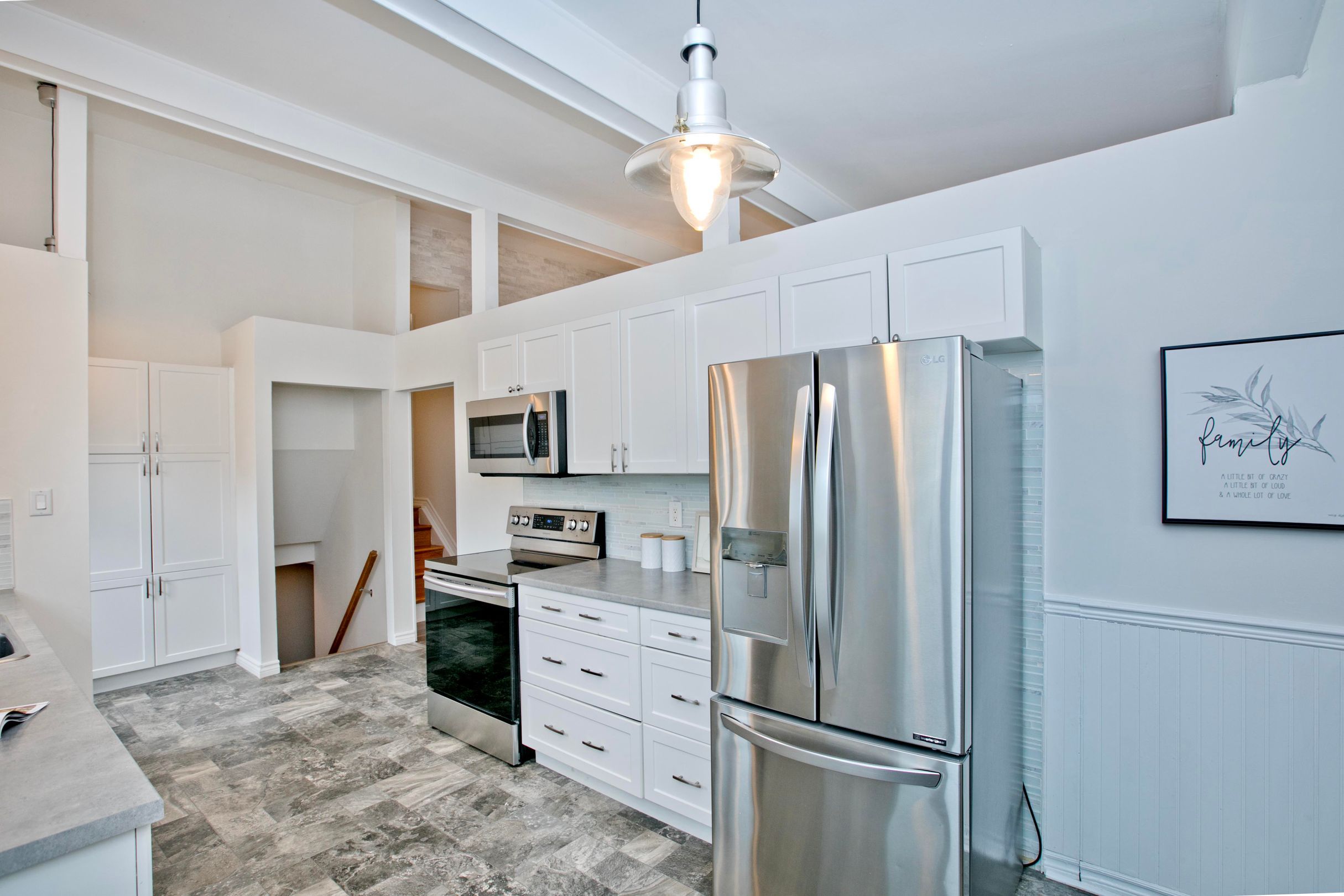 • Bright family-sized kitchen and spacious living room with cathedral ceiling.