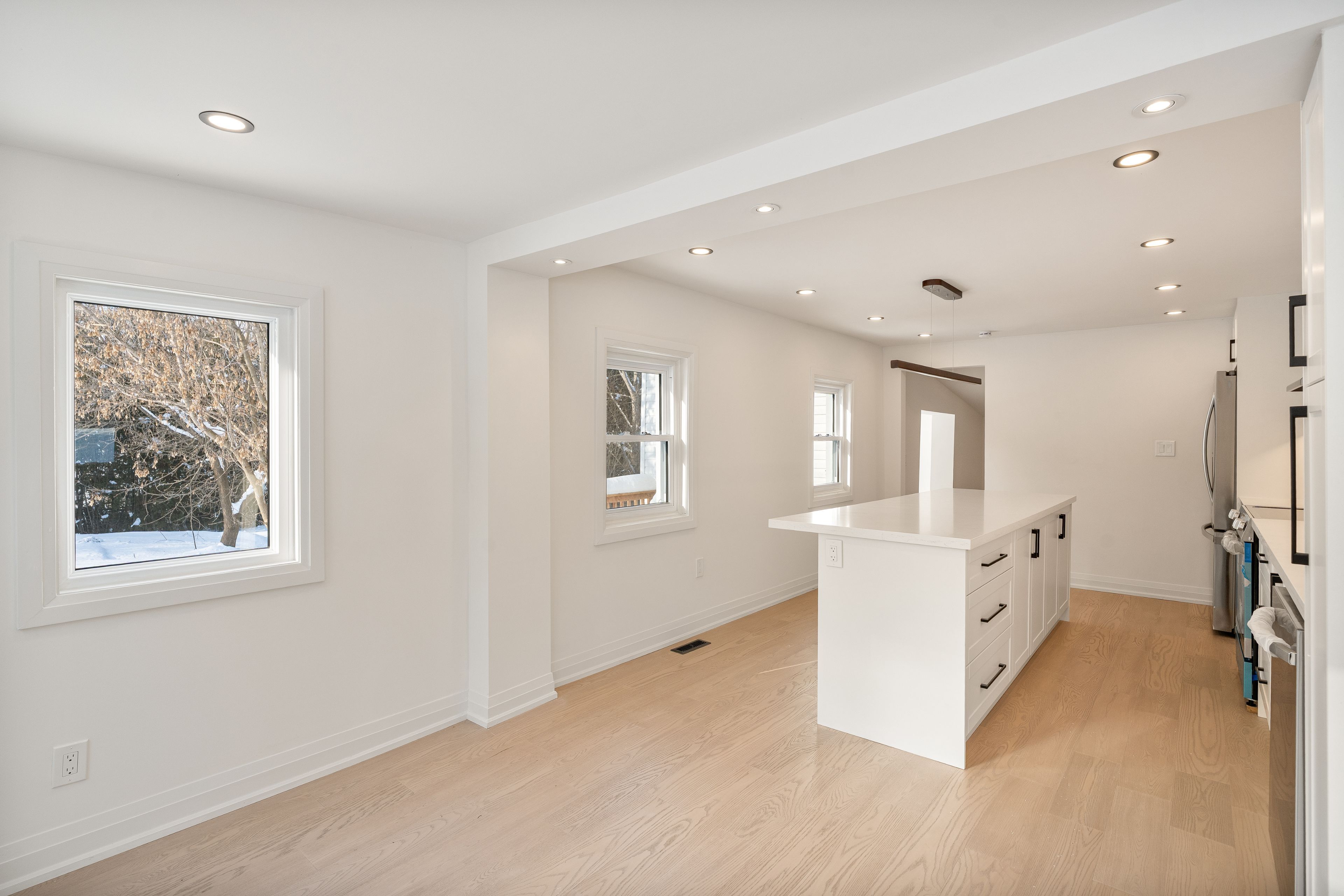 • Open concept kitchen with island for easy meal prep.