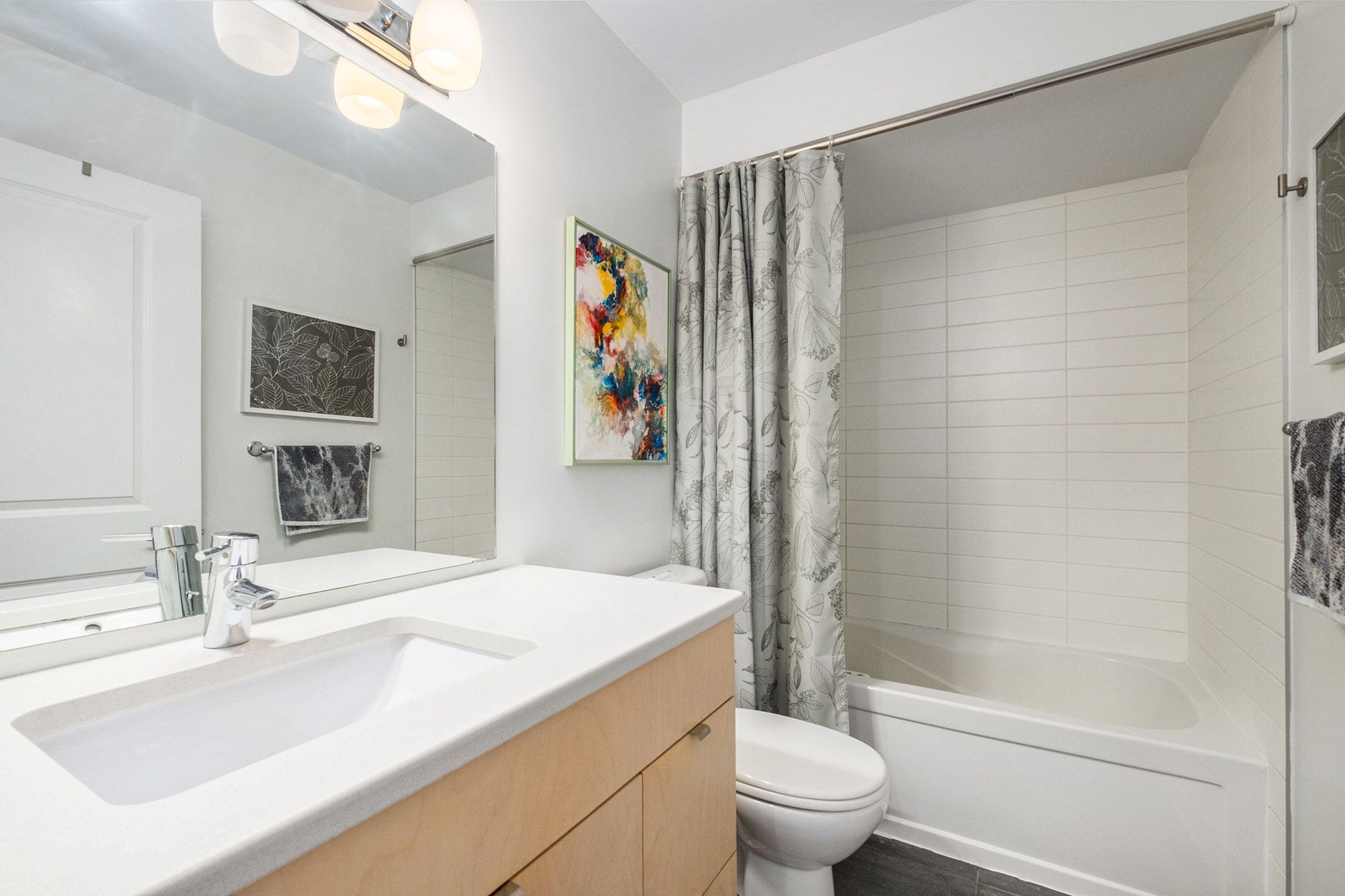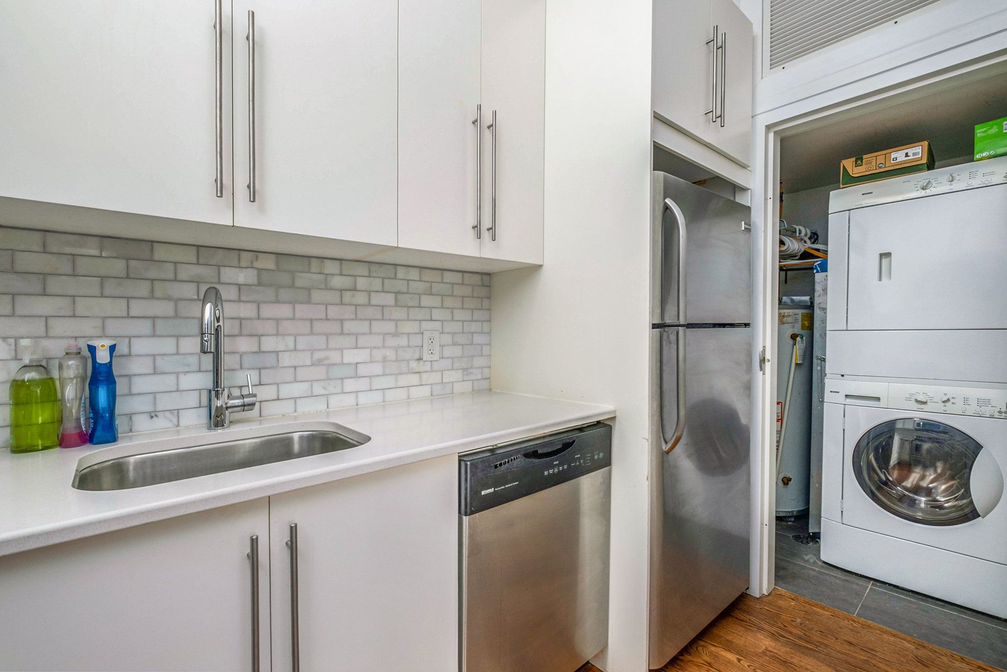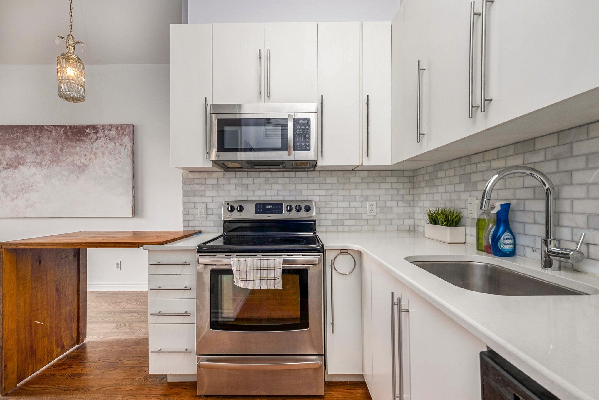 • Well-equipped kitchen features stainless appliances and stylish quartz counters.