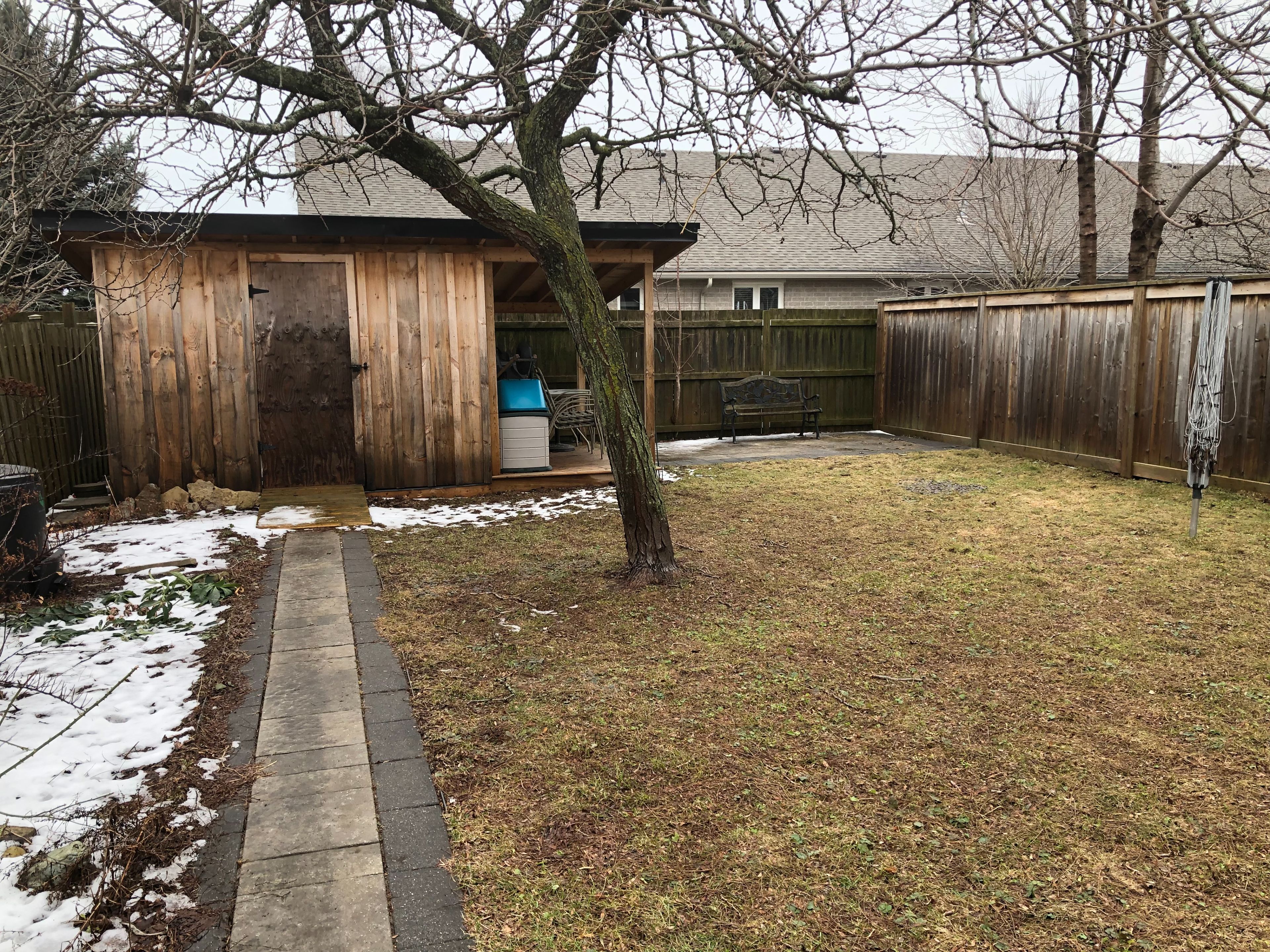 • Fully fenced backyard with a storage shed for extra space.