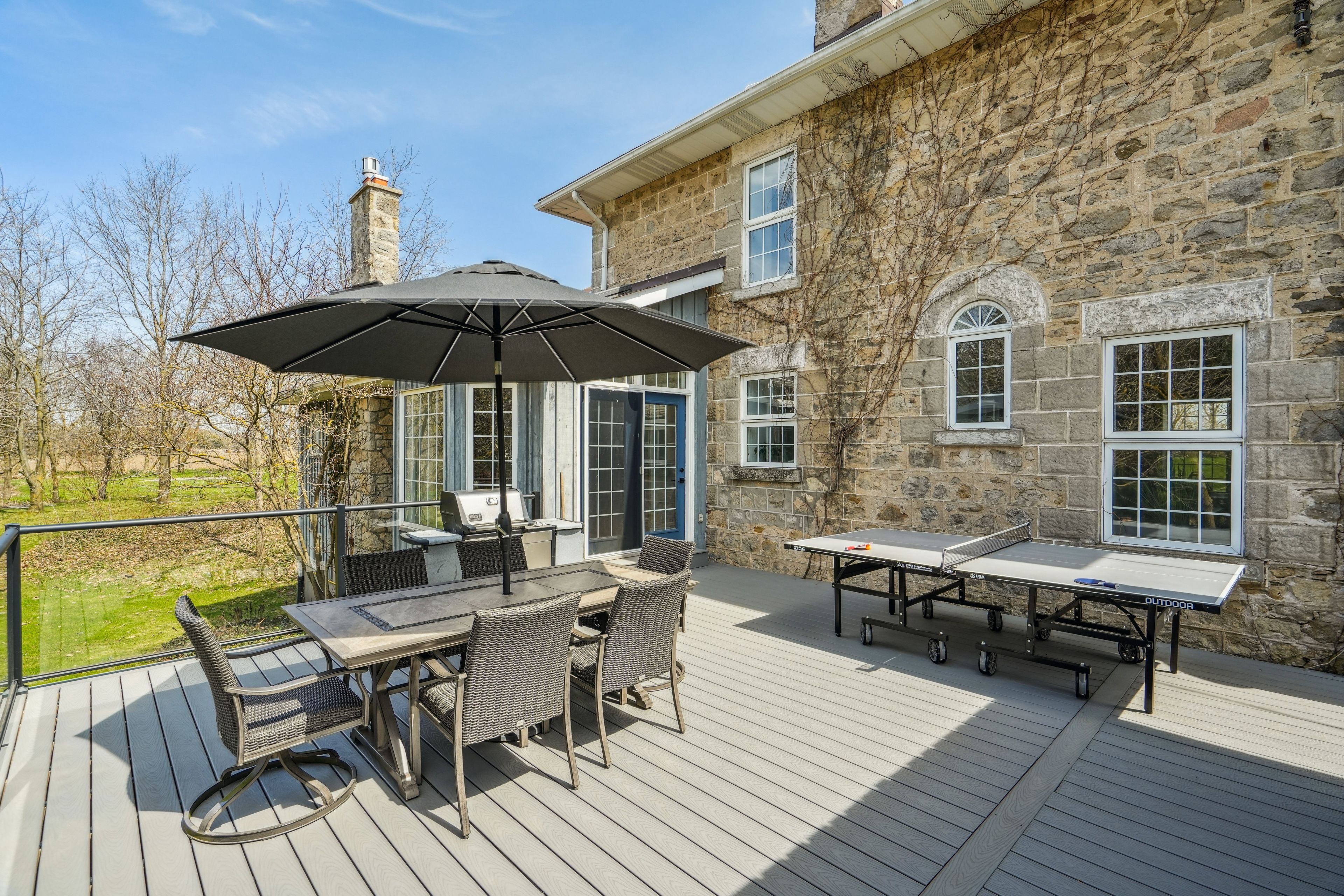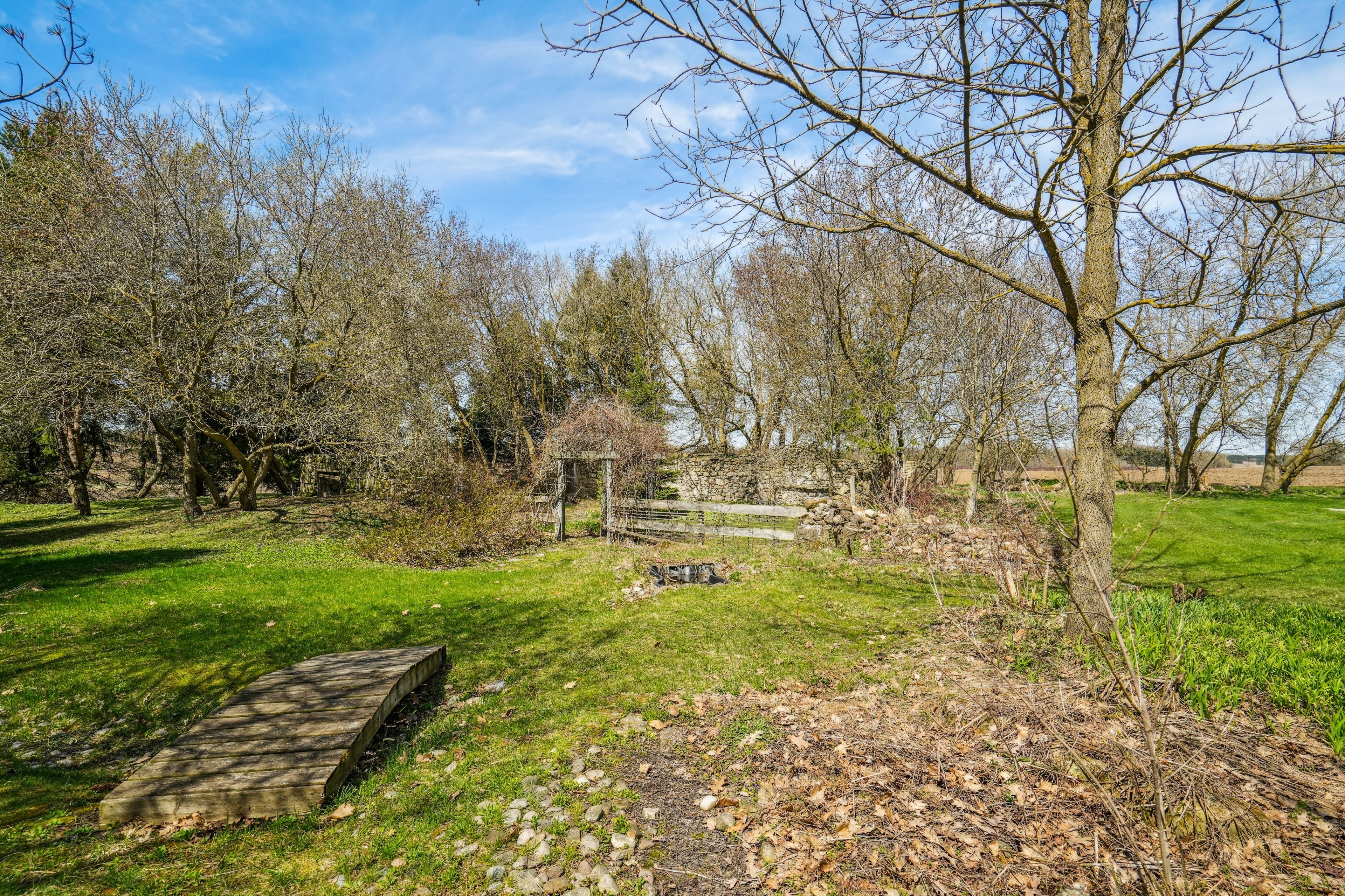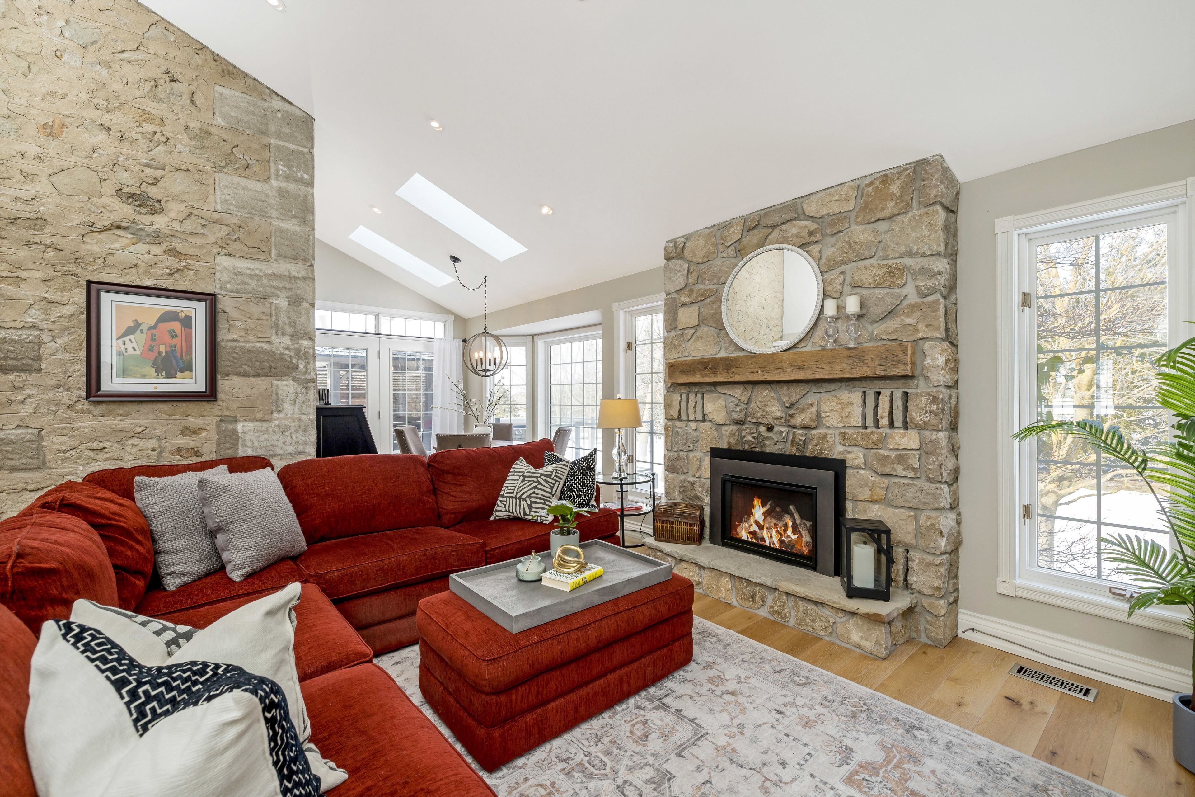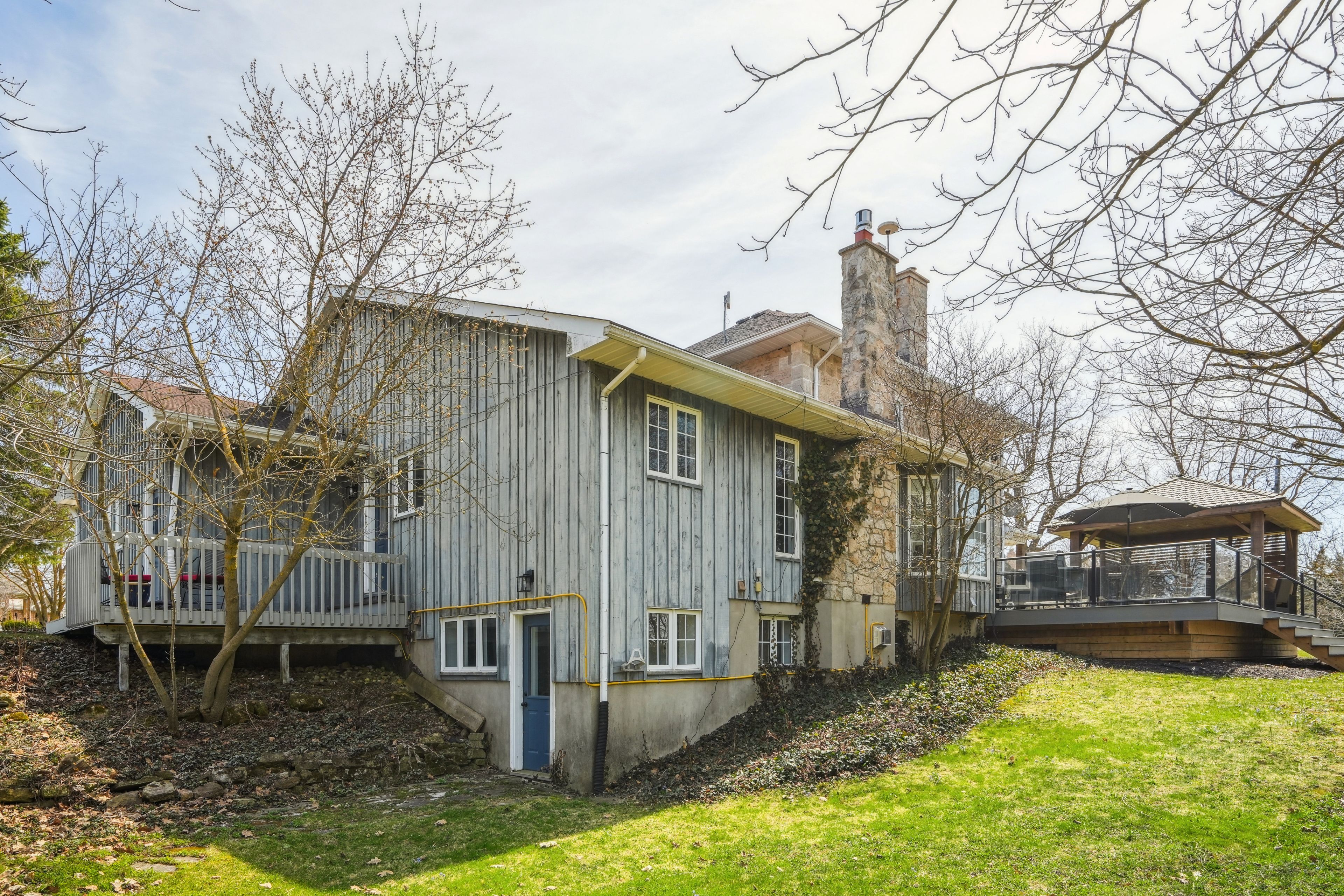 This enchanting stone home on a meticulously landscaped 1. 98-acre lot, originally built in 1906, beautifully blends timeless history with contemporary living. The original stone craftsmanship stands as a testament to its heritage, while thoughtful renovations provide the perfect balance of old-world charm and modern comfort. This home features three spacious bedrooms, including a luxurious primary suite with a large walk-in closet, custom built-ins, and a striking shiplap ceiling. The spa-inspired 5-piece ensuite includes a deep soaking tub and a glass-enclosed rain shower, offering a serene retreat. The additional bedrooms share a stylishly updated 3-piece bathroom. At the heart of the home is a beautifully renovated gourmet kitchen, complete with stainless steel appliances, a classic farmhouse sink, and a spacious center island, ideal for both cooking and entertaining. The dining room, which features a built-in coffee bar, flows seamlessly into the cozy living room, creating a warm and inviting ambiance. Natural light pours into the charming breakfast nook, which opens onto a low-maintenance trex deck with sleek glass railings. This outdoor space leads to a 15' x 14' cedar-shake gazebo, an ideal setting for enjoying a morning coffee or hosting evening gatherings. The family room, with its vaulted ceiling, recessed lighting, and inviting gas fireplace, provides the perfect spot to unwind. A den at the front of the home, showcasing exposed stone walls, offers a quiet retreat for reading or reflection. Completing the main floor is a convenient mudroom with garage access, main-floor laundry, and a stylish powder room. The finished lower level includes a bright recreation room with a gas fireplace, a kitchenette with a separate entrance, and a 4-piece bath. The original basement, with exposed stone walls and concrete floors, offers versatile space for storage or imagination.