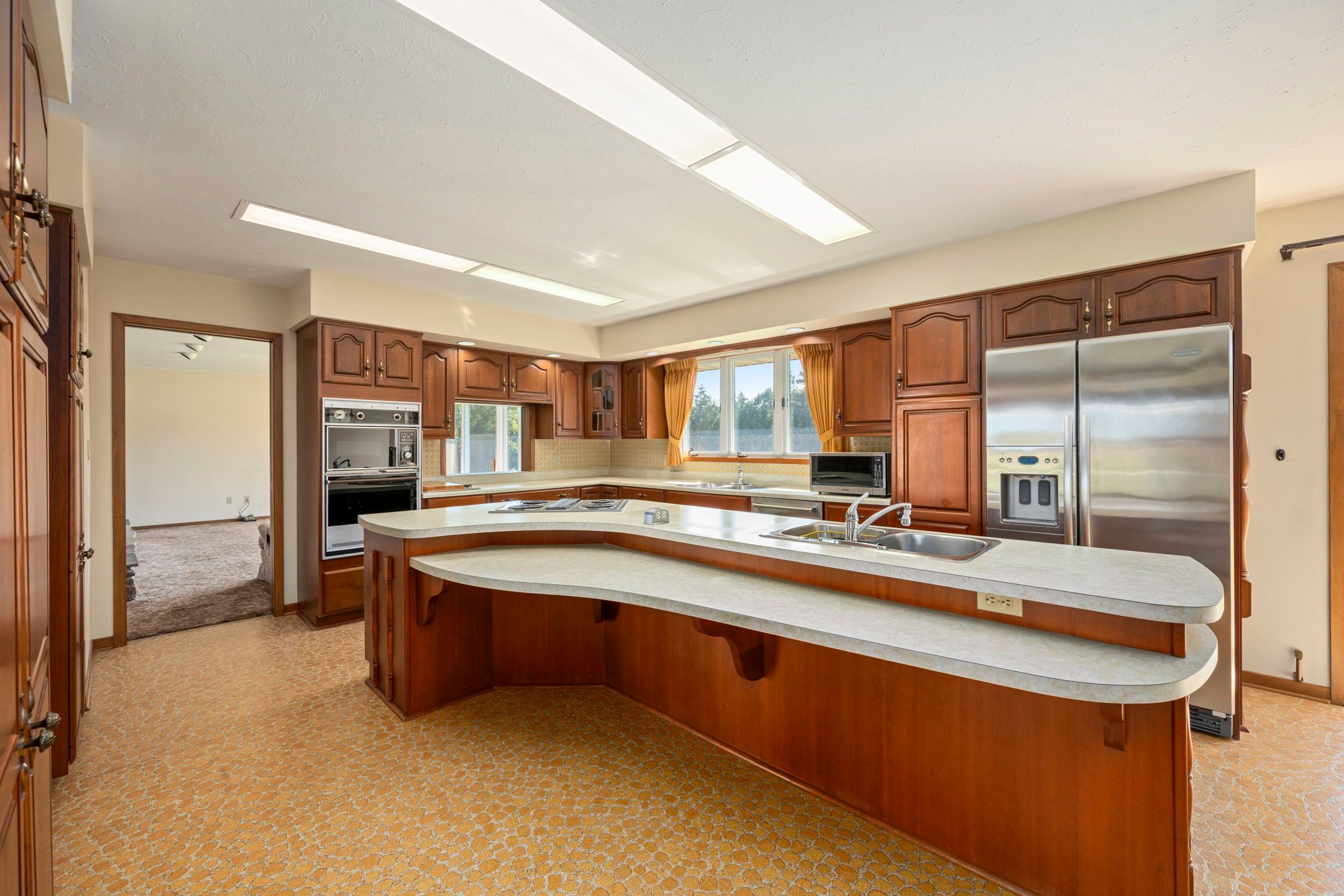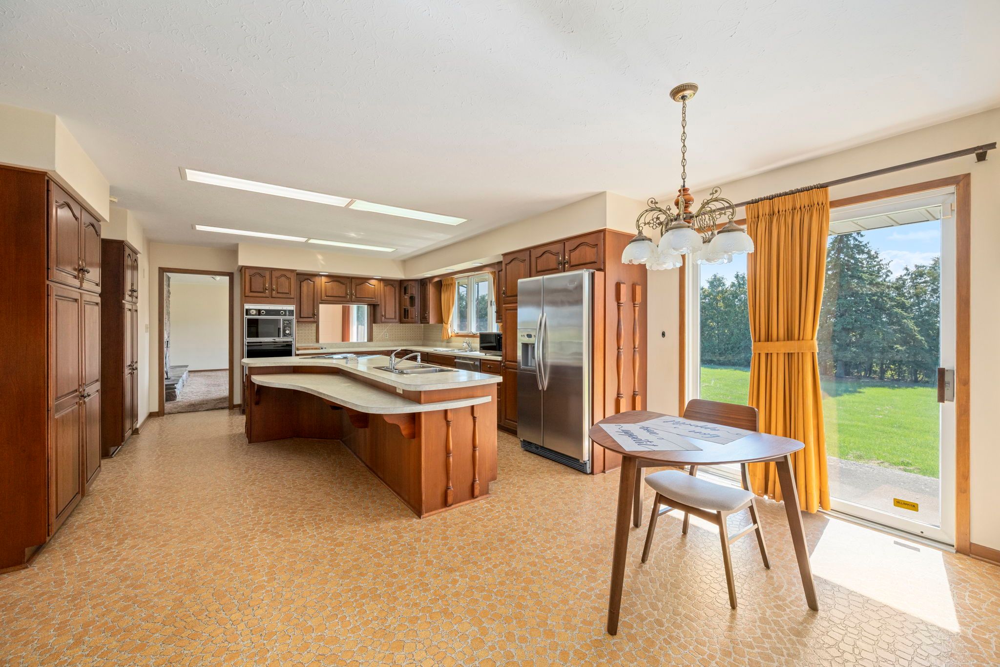 • Large eat-in kitchen with ample cabinetry and a center island.