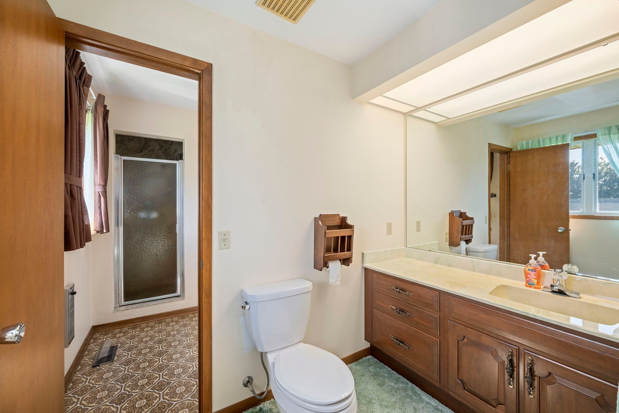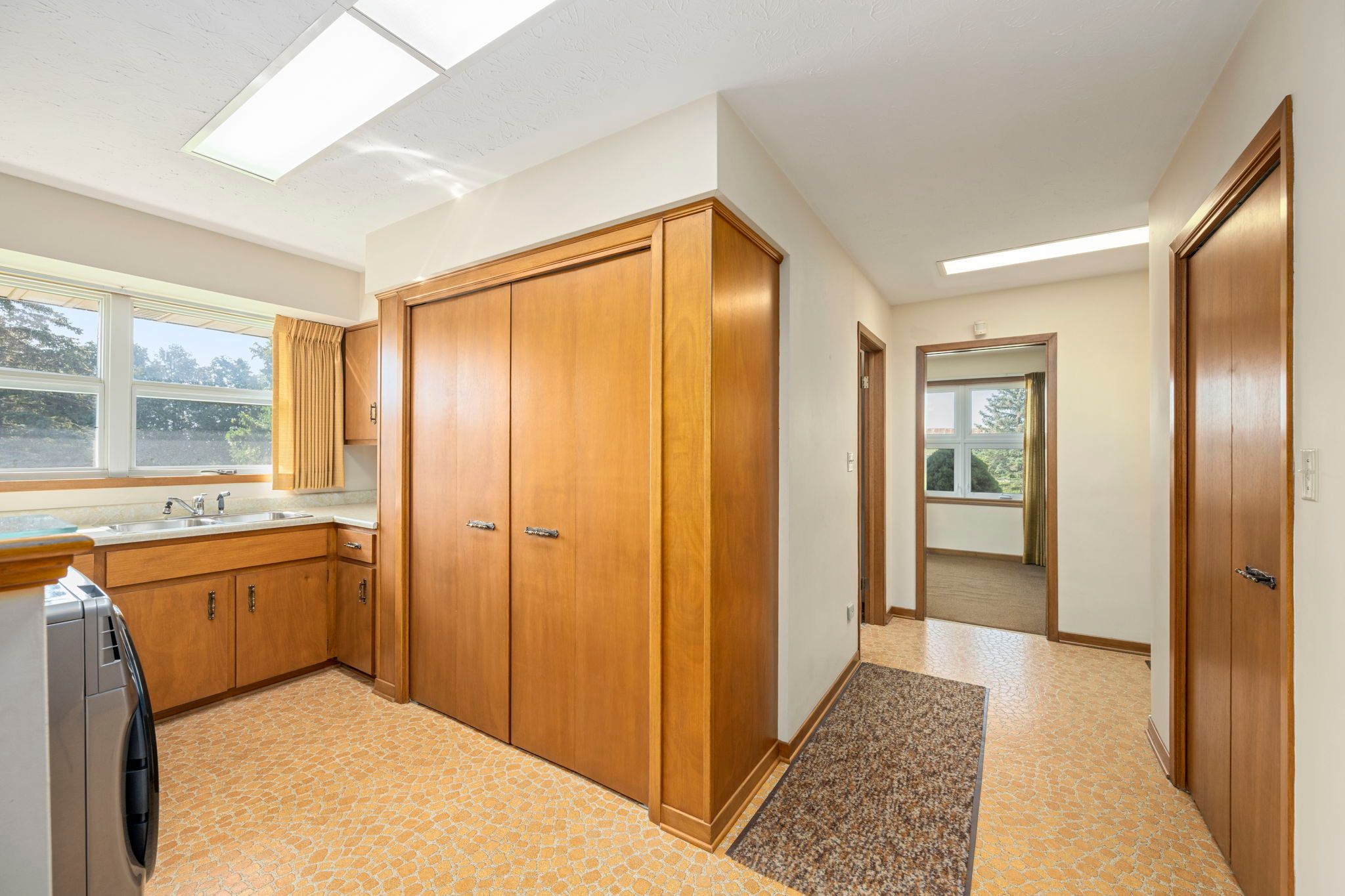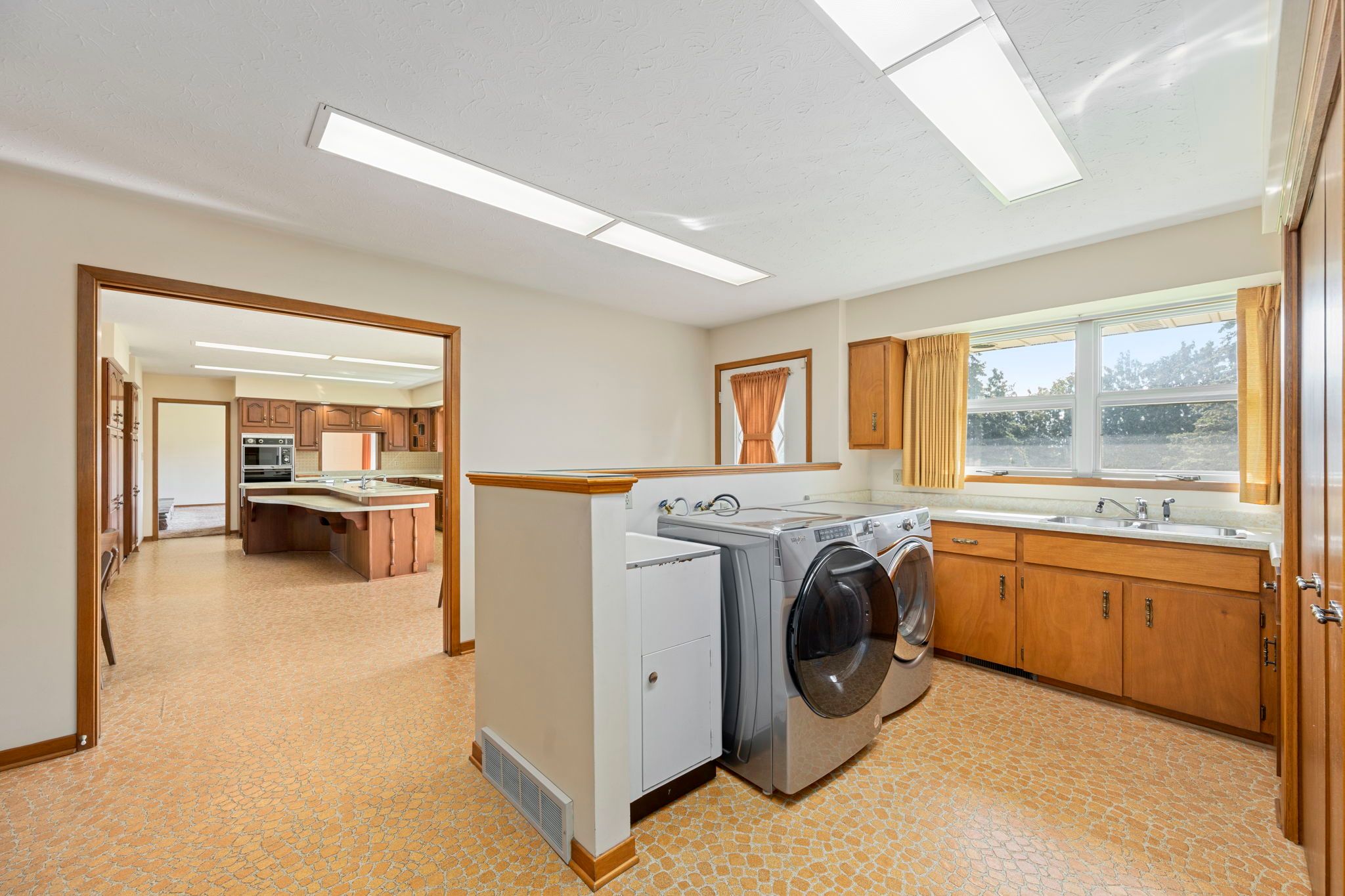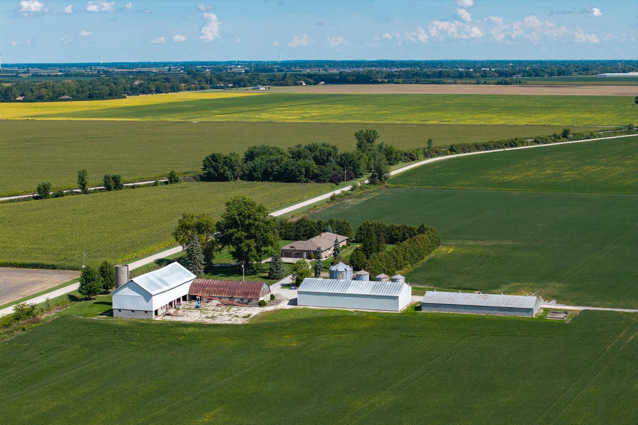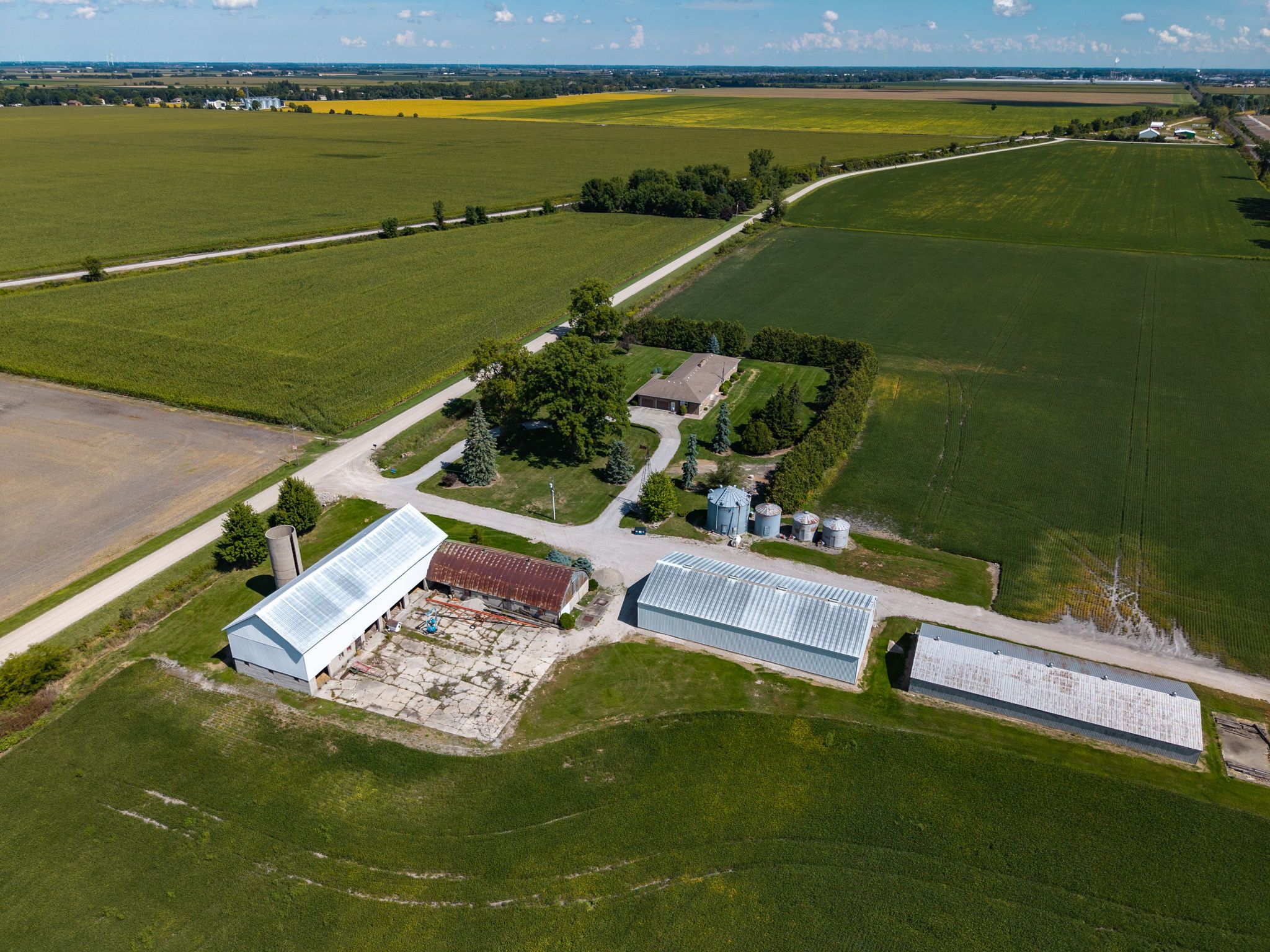 29-acre farm with spacious bungalow & outbuildings. Situated on 29 acres of a1-zoned land, this well-built 3,171 sq. Ft. Bungalow offers generous living space and a functional rural setting close to the town of chatham. The home features 3 bedrooms and 2. 5 bathrooms, along with an attached double garage. The main floor offers a large eat-in kitchen with ample wood cabinetry, a centre island, and plenty of space for family dining. Separate family and living rooms provide flexible living areas, each highlighted by a wood-burning fireplace. The layout is well suited for both everyday living and entertaining. A full basement extends the living space and offers excellent future potential, with rough-in plumbing already in place for a full bathroom, as well as rough-in for an additional fireplace. The home is serviced by a geothermal heating and cooling system with electric backup, offering efficient and reliable comfort. High-speed internet is available. The property includes a large timber-frame barn, a metal-clad driveshed, and two small vacant hog barns. Additional farm features include four grain storage bins, including a 6,000-bushel dryer bin. An excellent opportunity for agricultural use, hobby farming, or those seeking a spacious rural residence with extensive infrastructure.