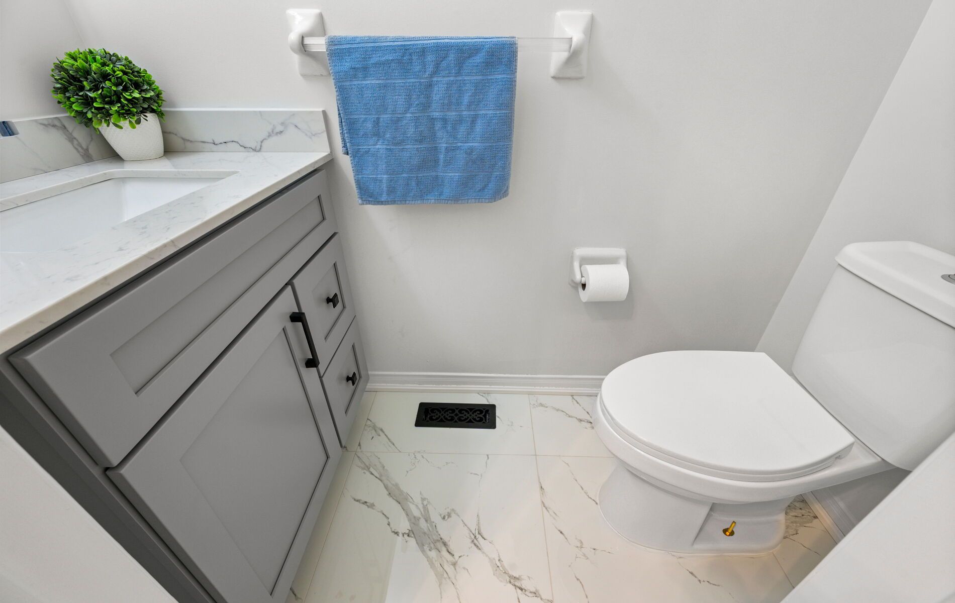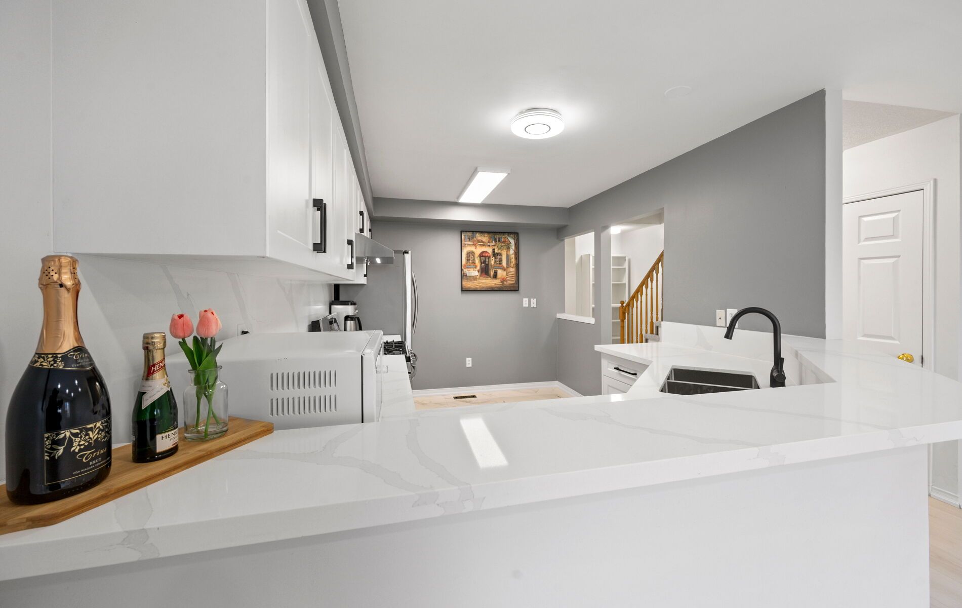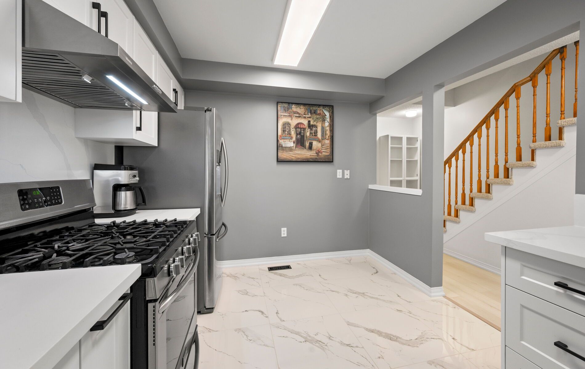 • Modern kitchen featuring quartz countertops and stainless steel appliances.