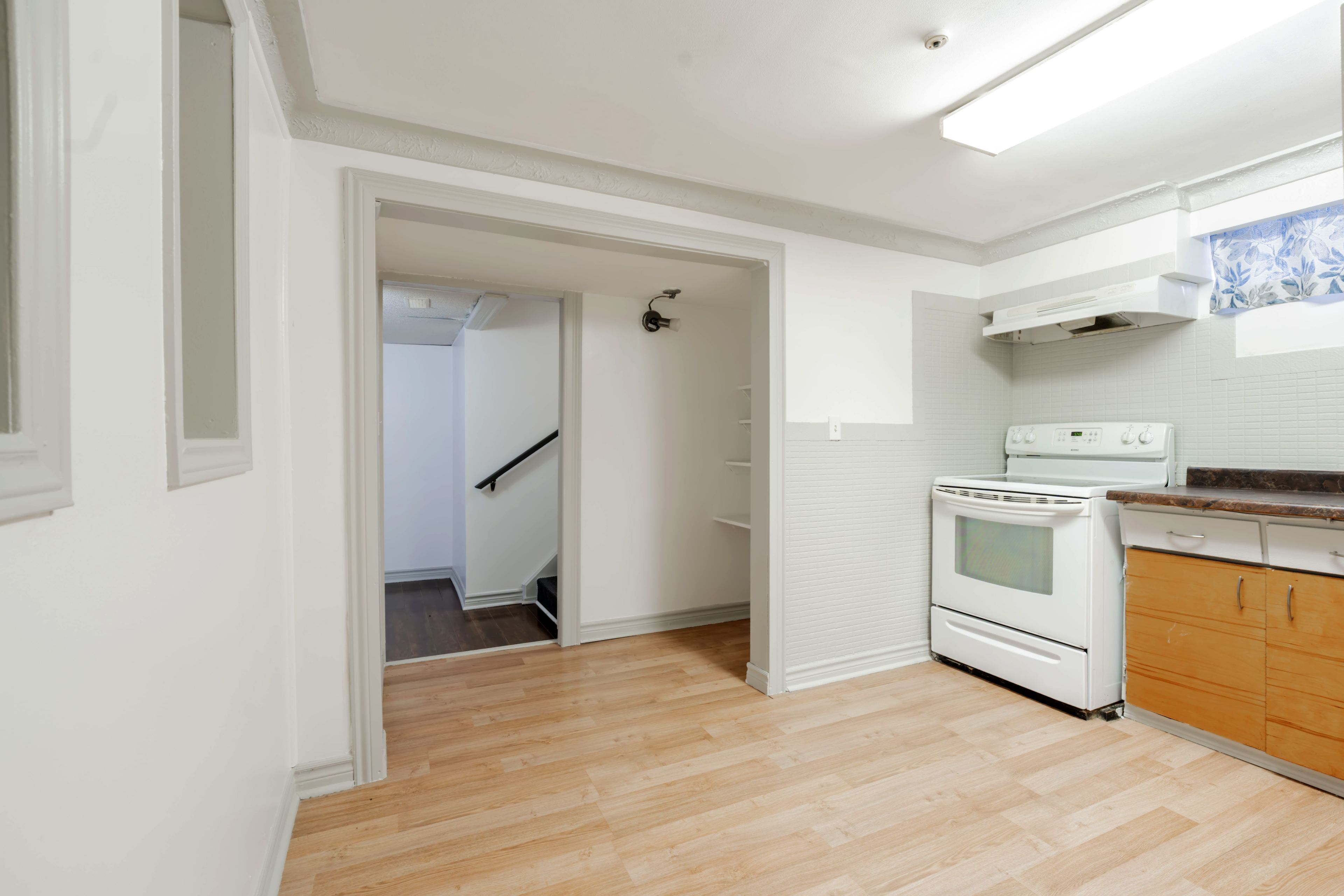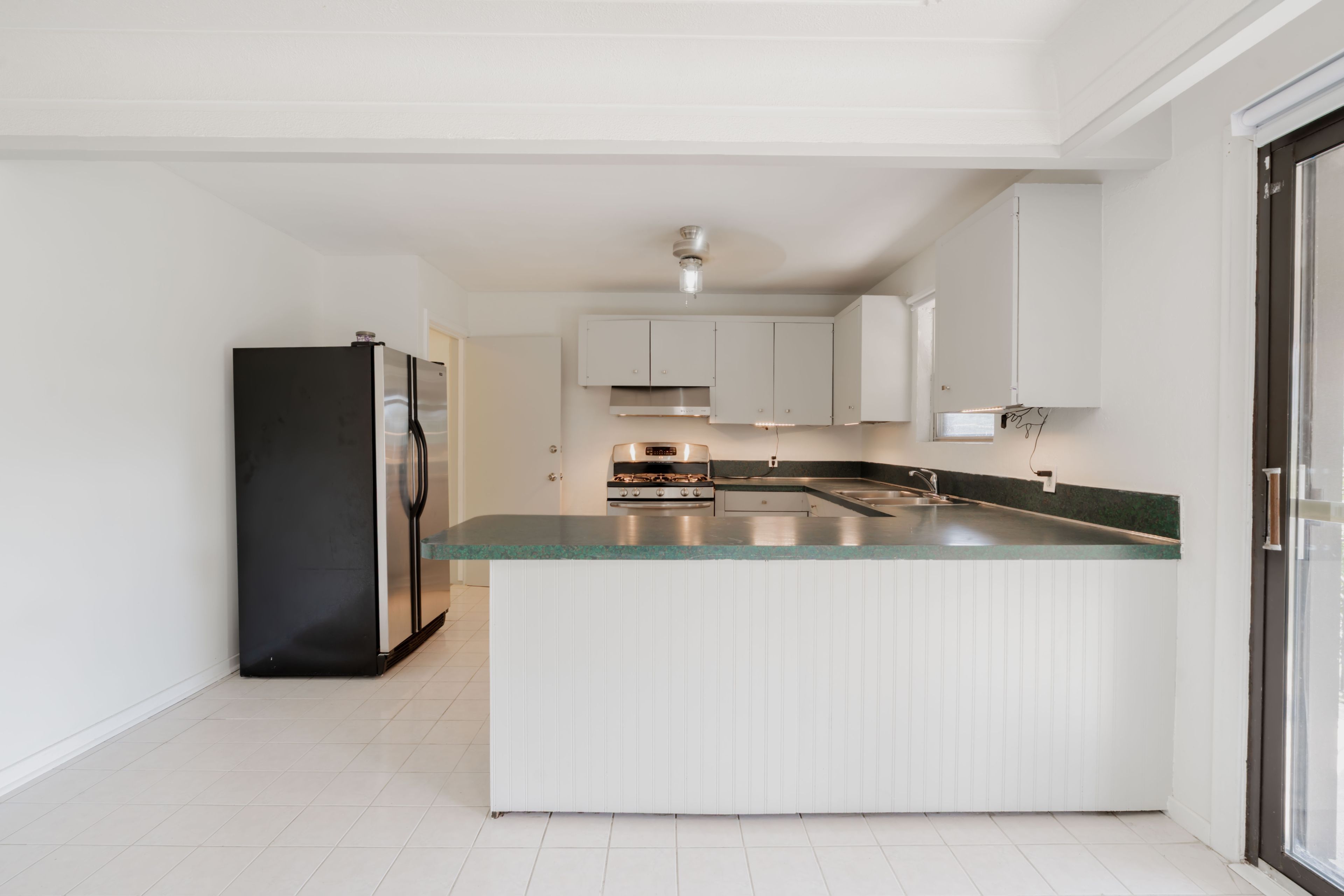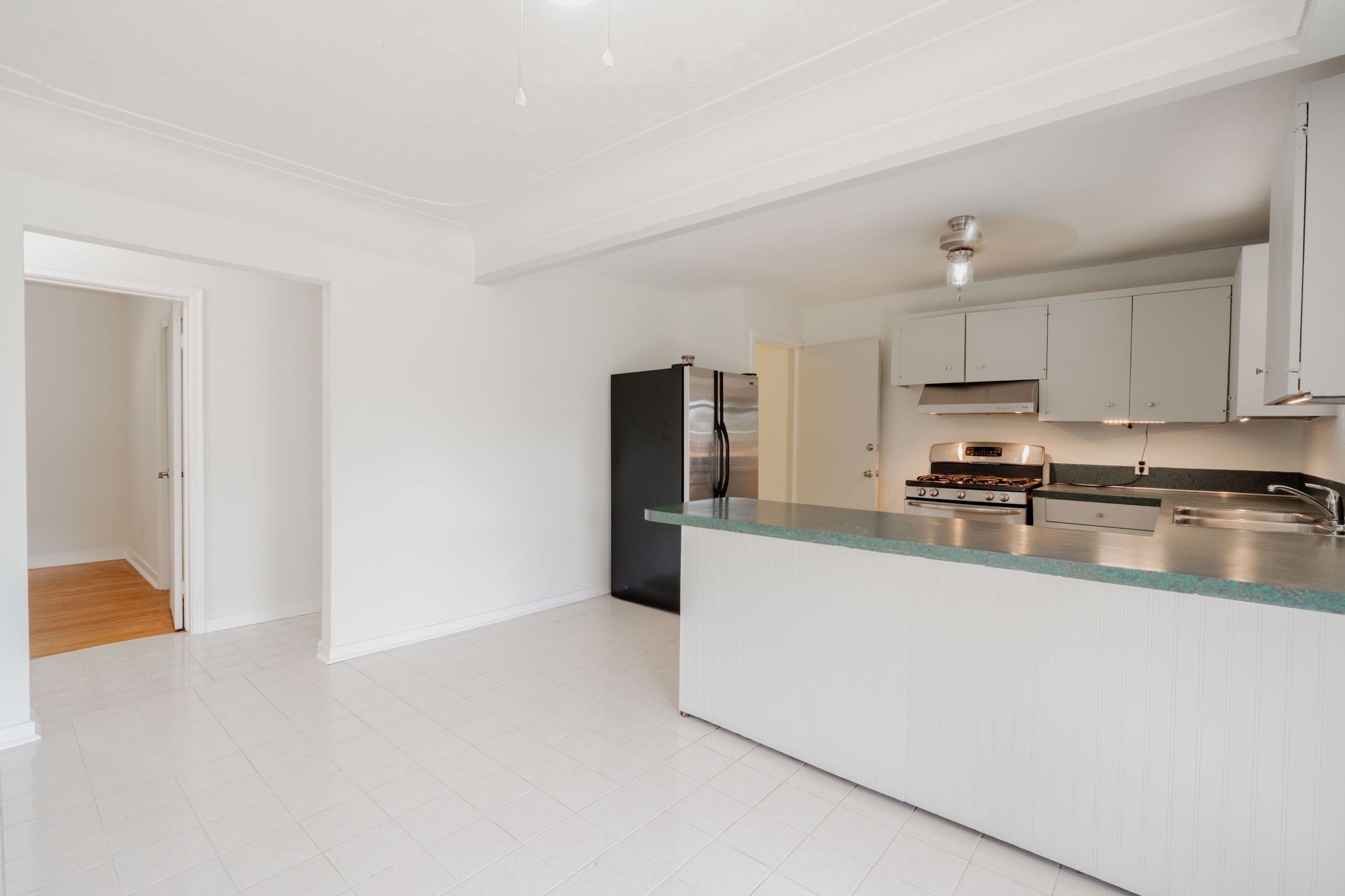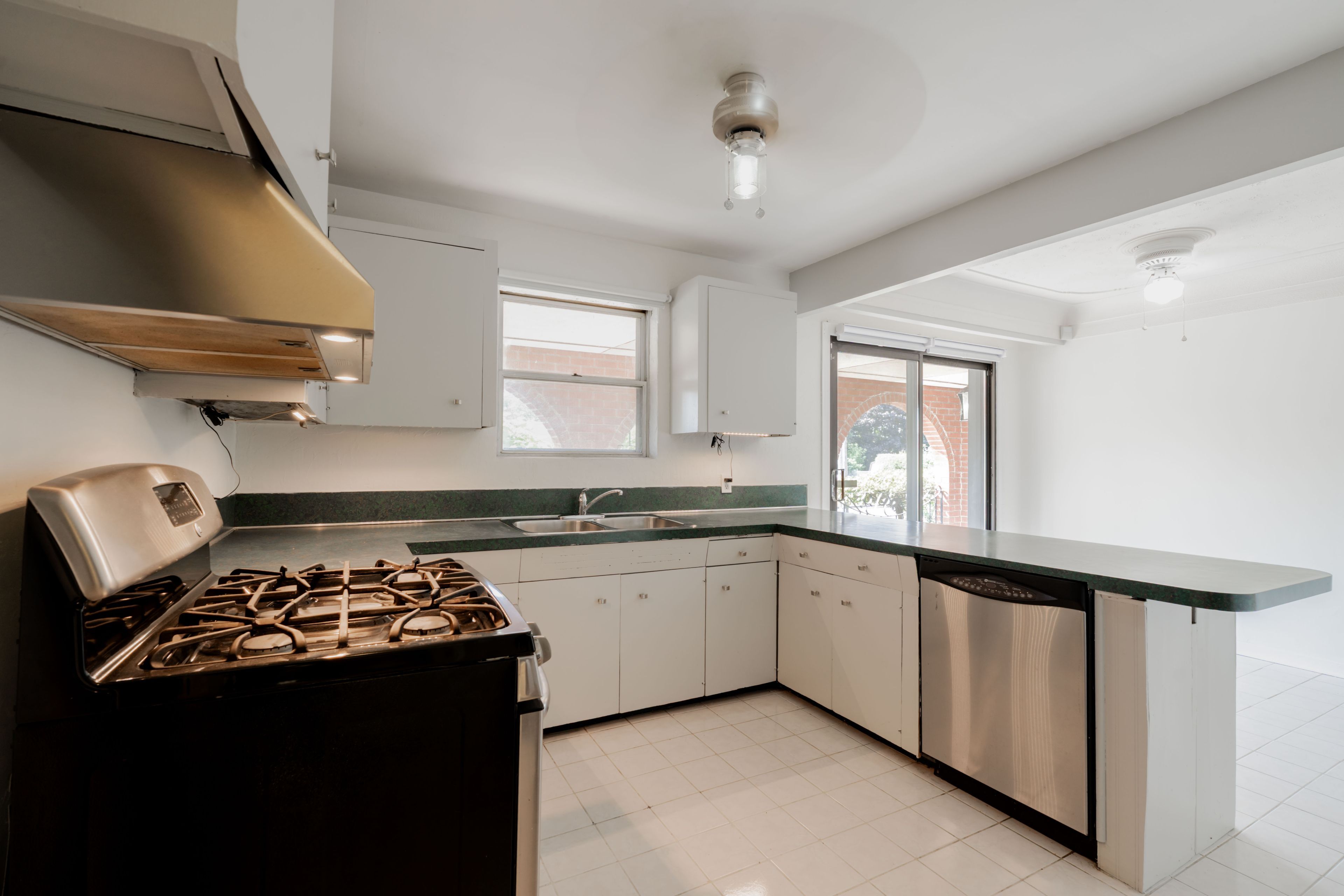• Bright kitchen with sliding doors and original hardwood floors throughout.