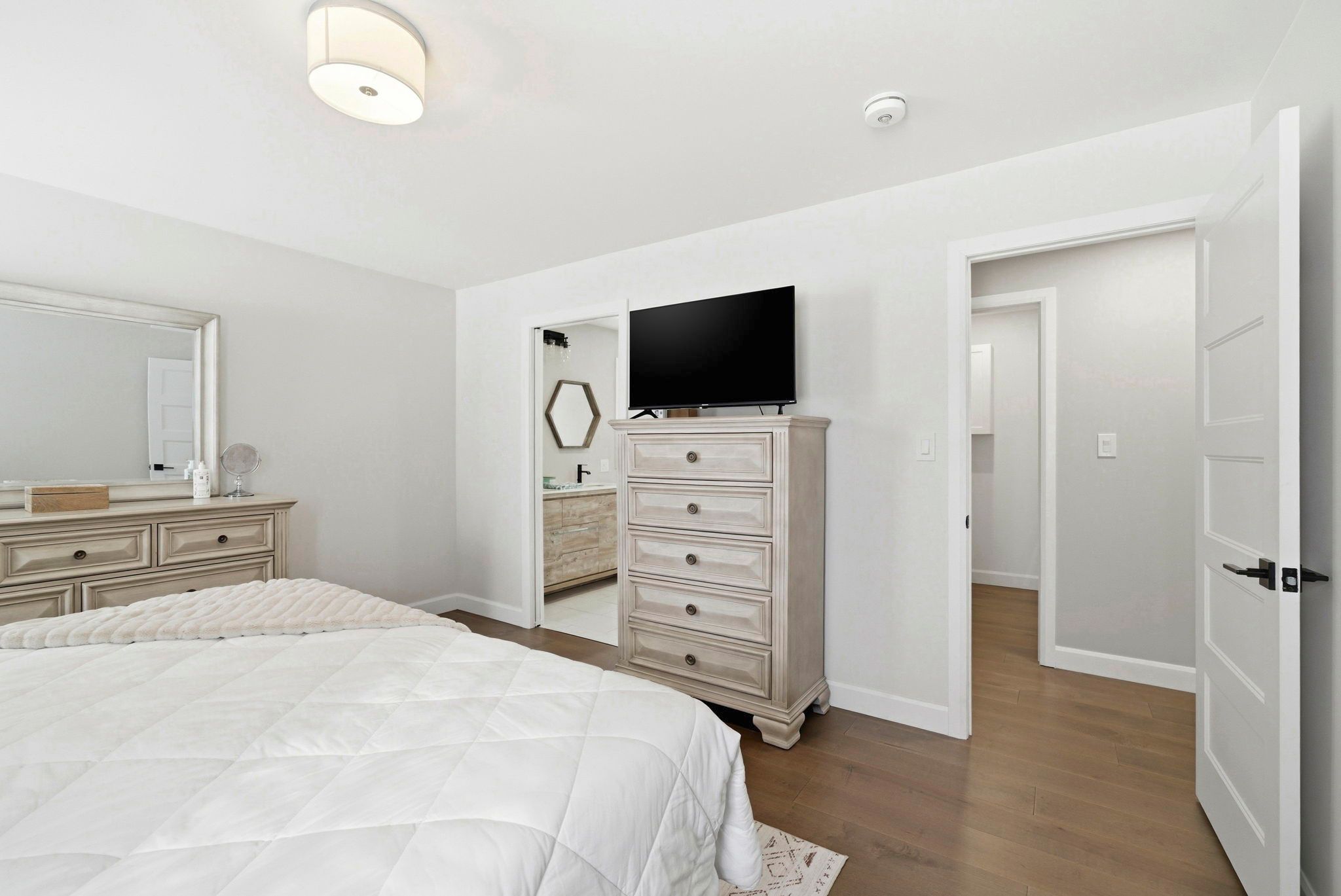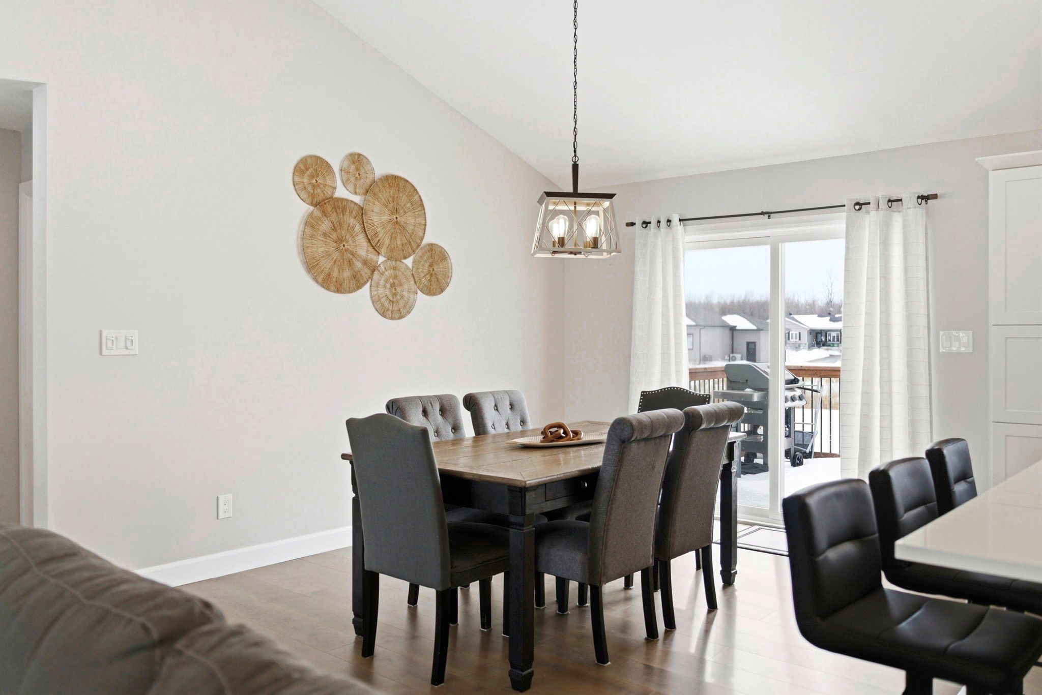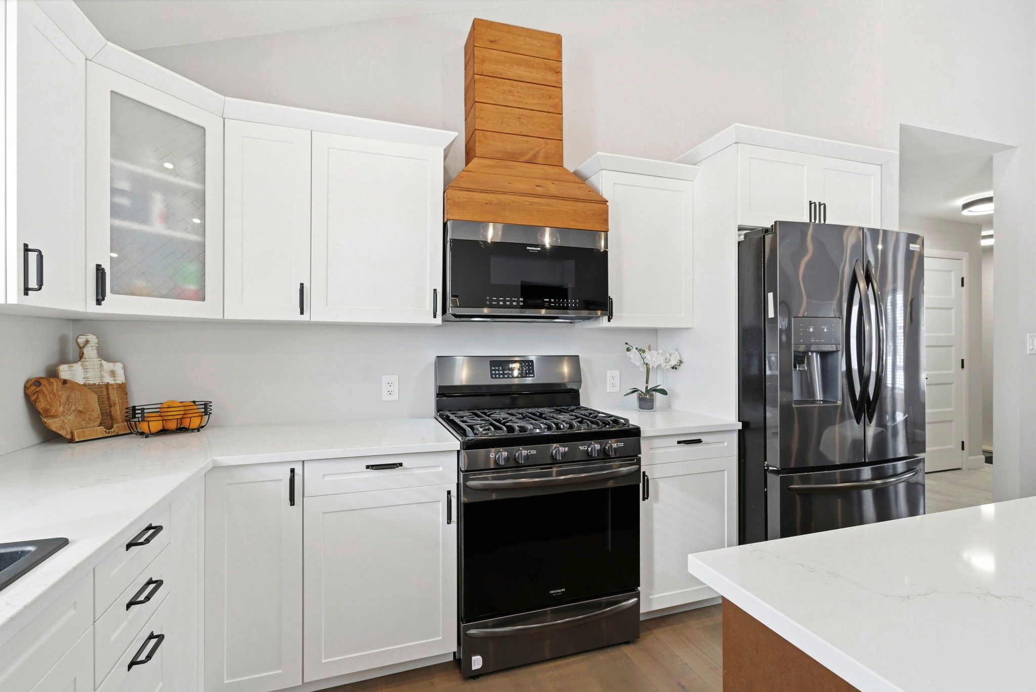 • Well-appointed kitchen with large quartz island and convenient outdoor deck access.