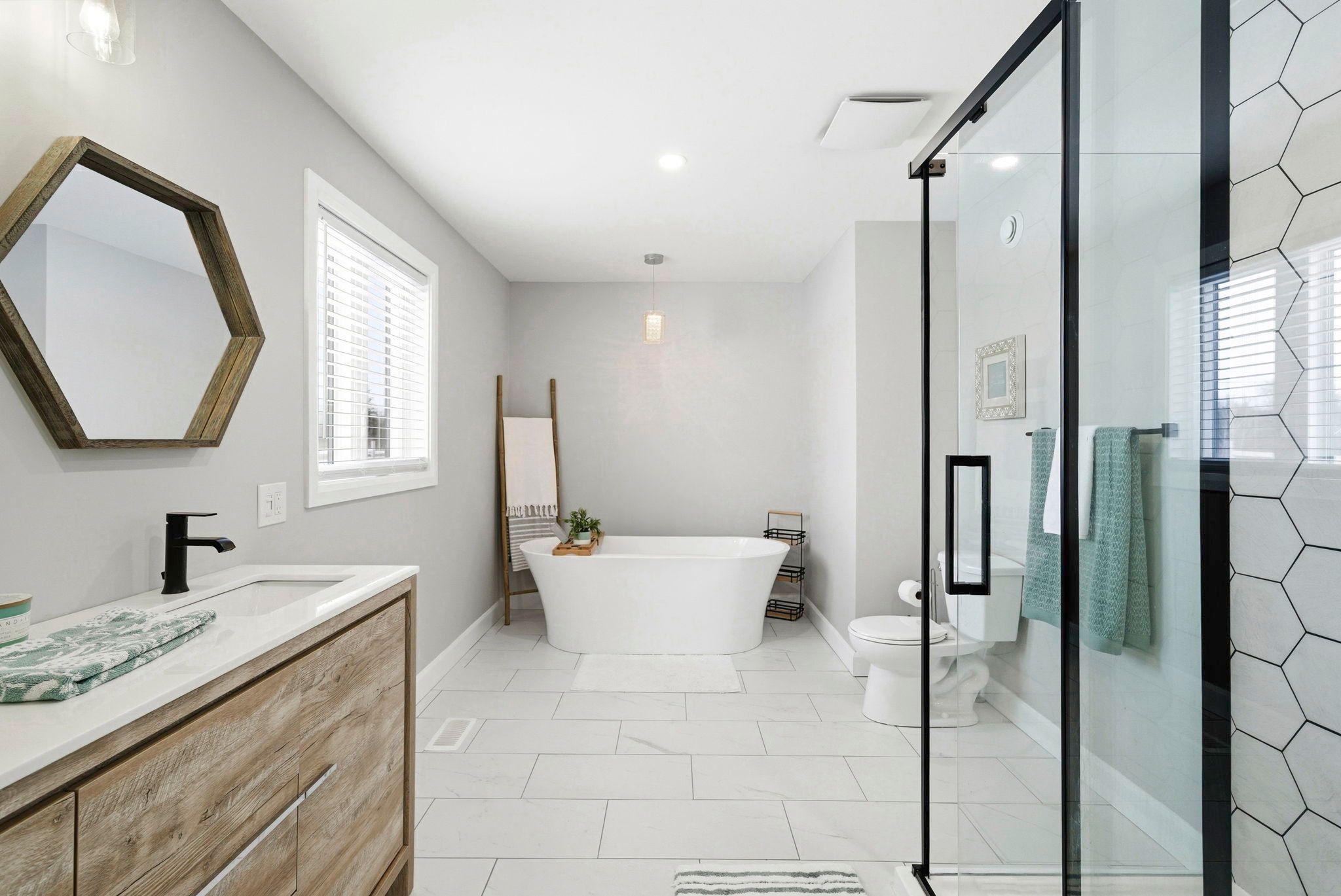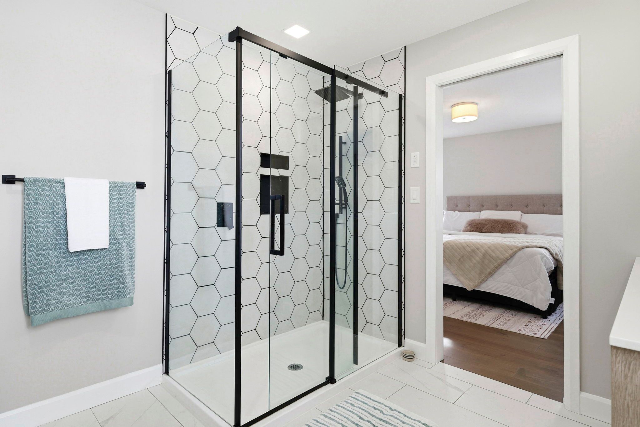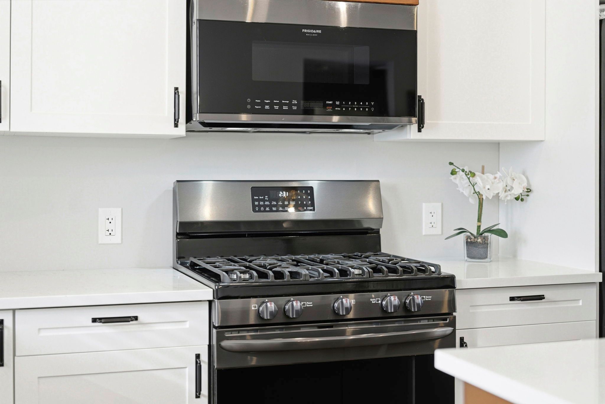 • Well-appointed kitchen with large quartz island and convenient outdoor deck access.