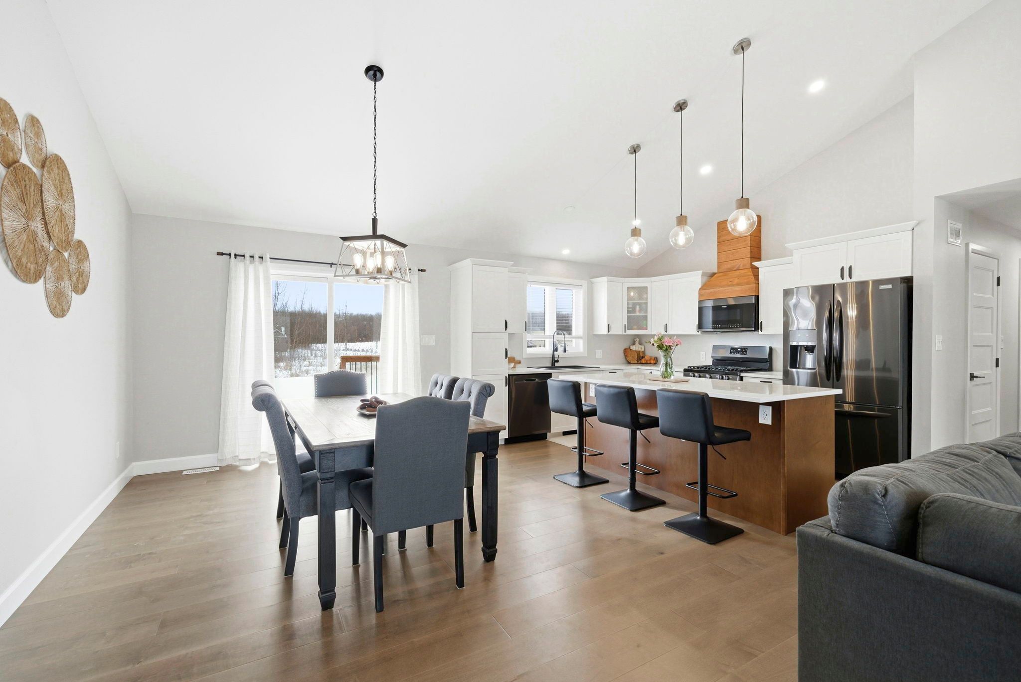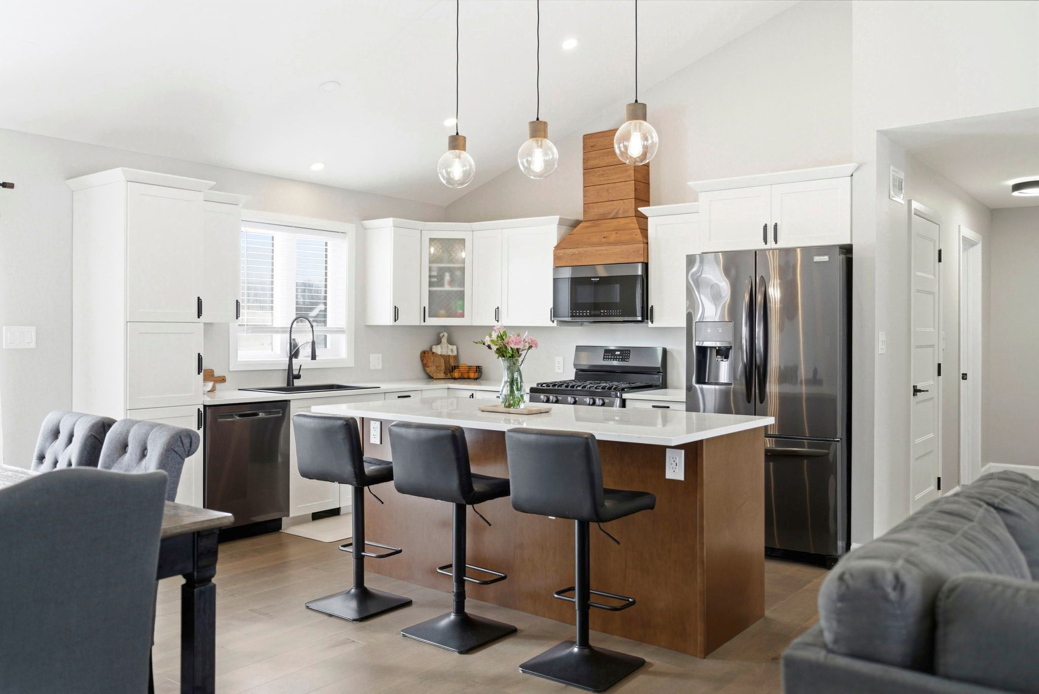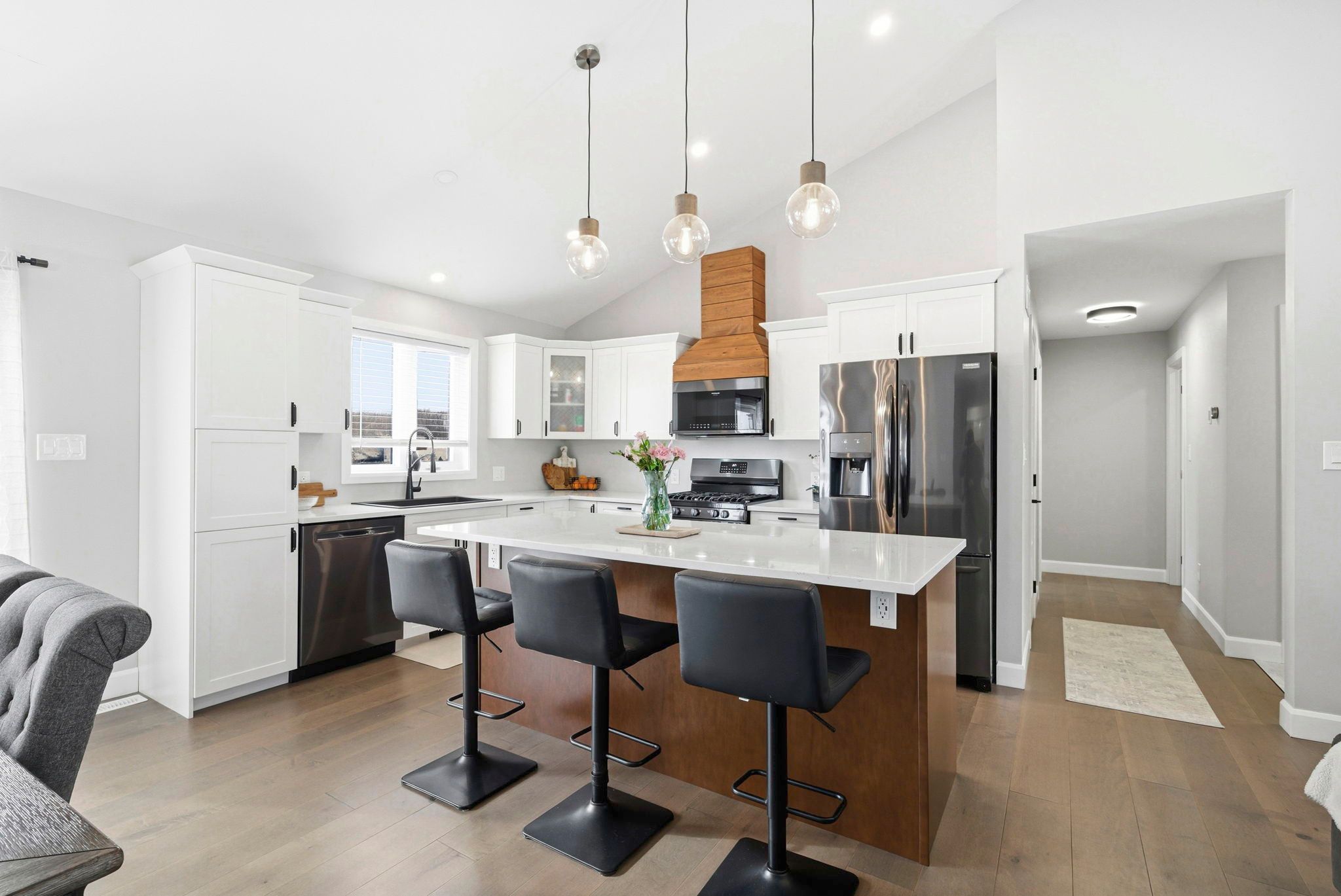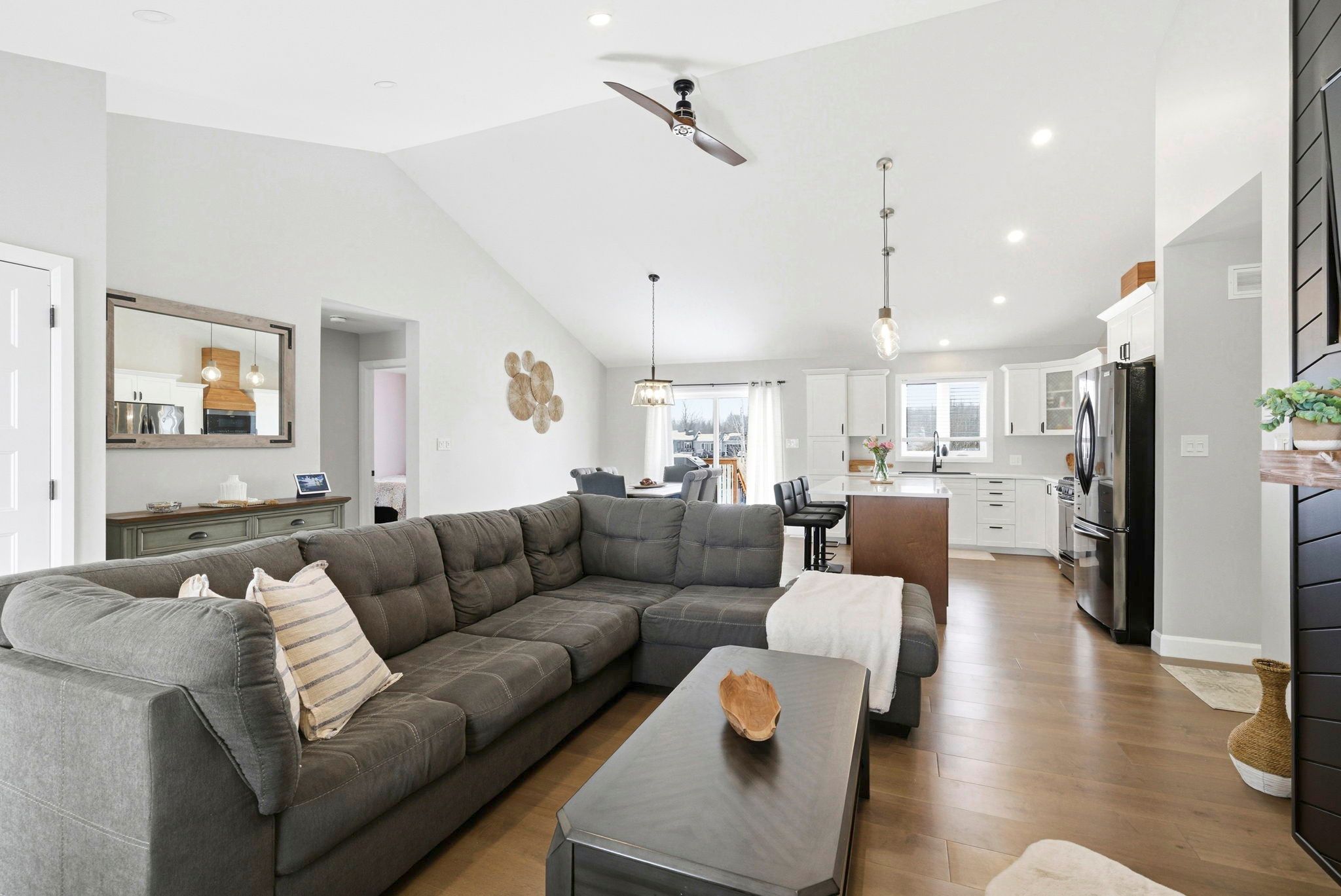 • Bright open-concept living area with engineered hardwood flooring and vaulted ceilings.
