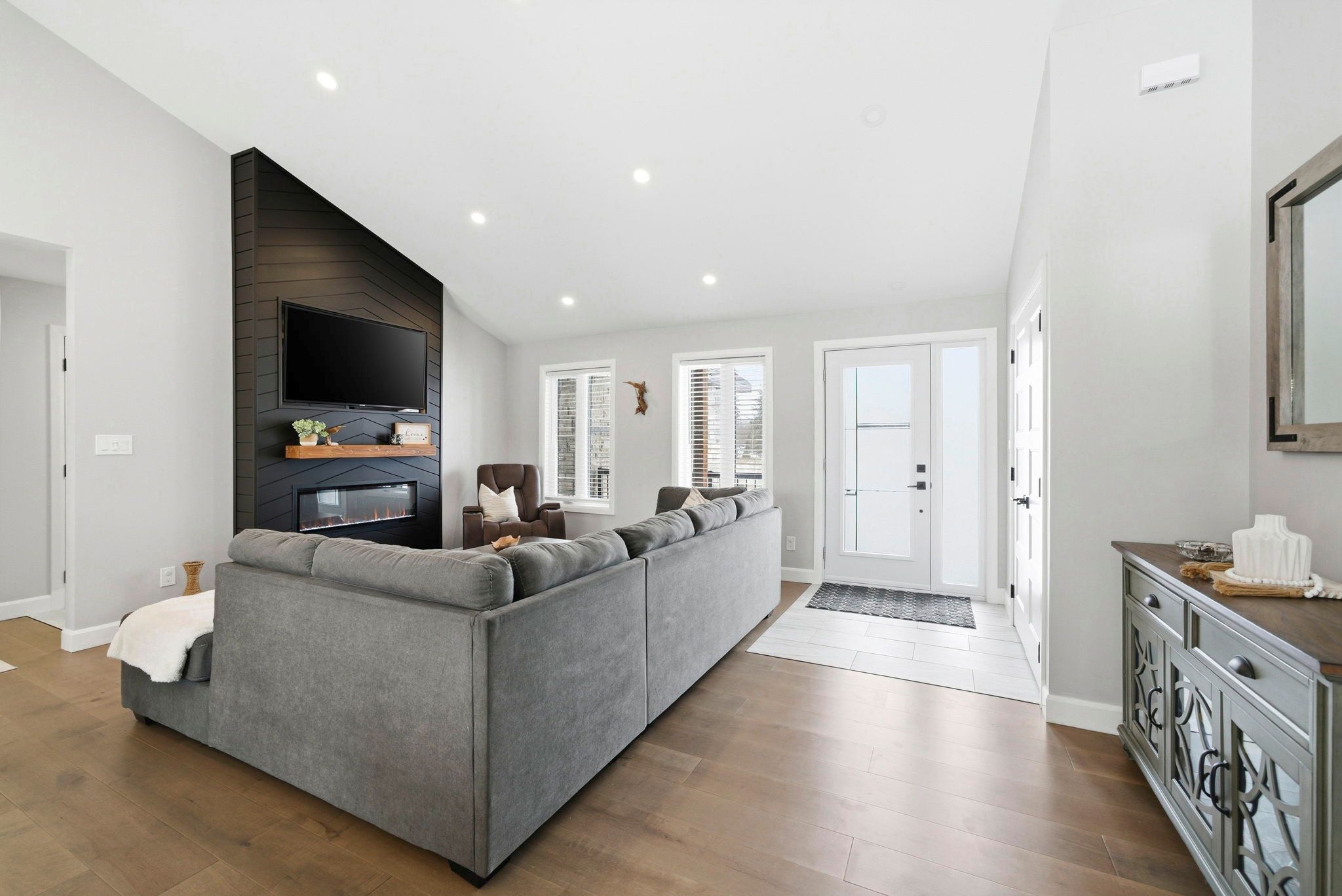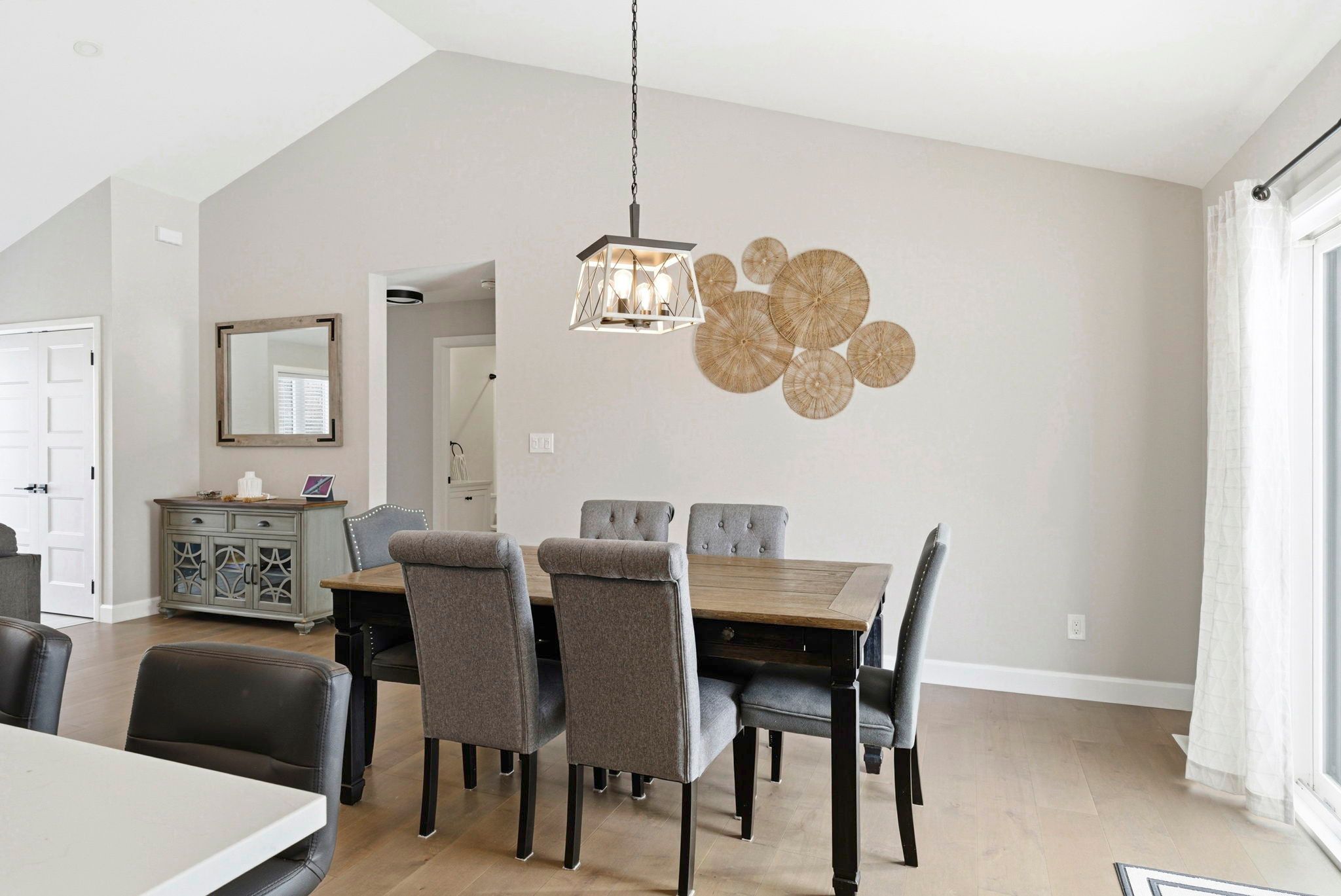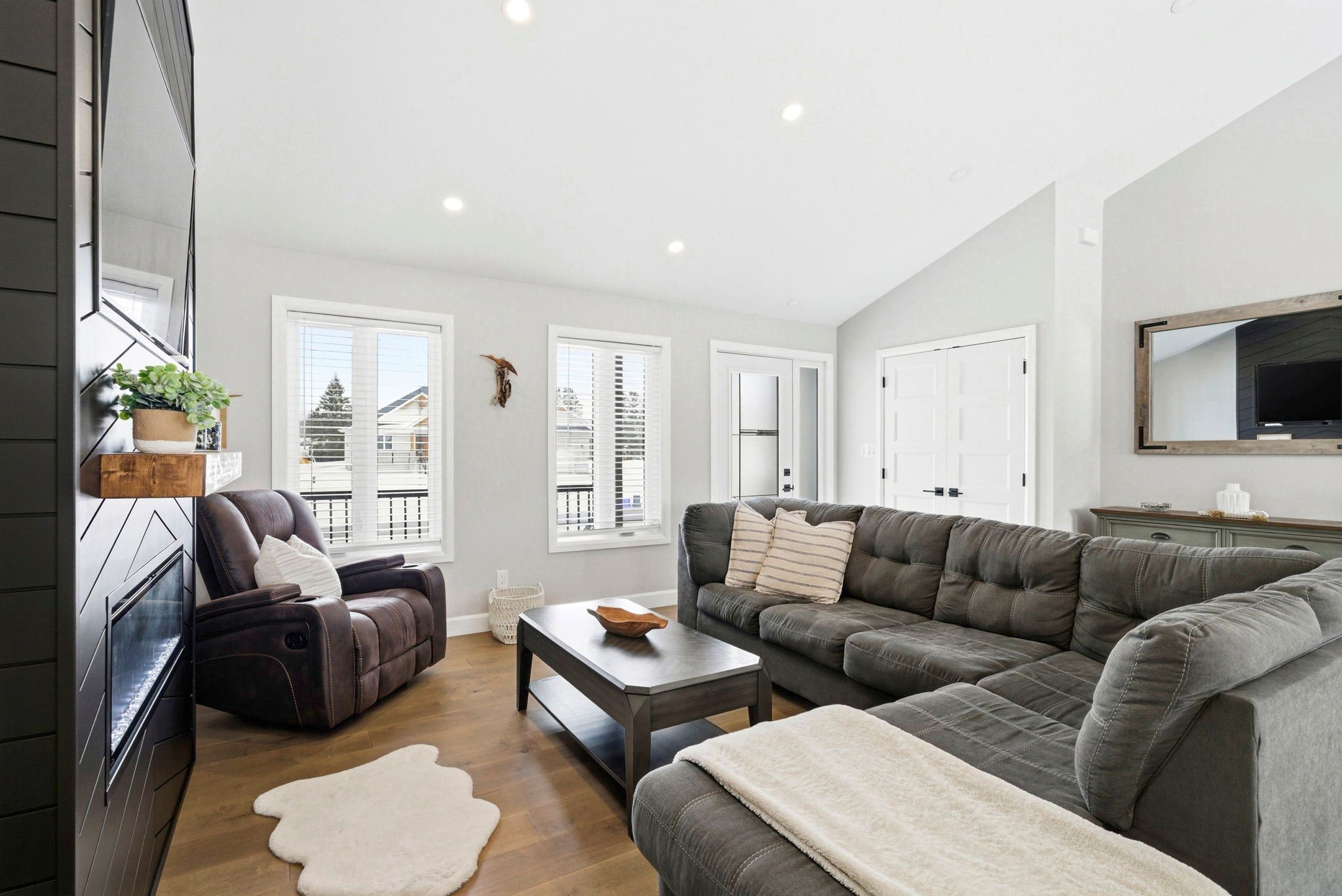 • Bright open-concept living area with engineered hardwood flooring and vaulted ceilings.