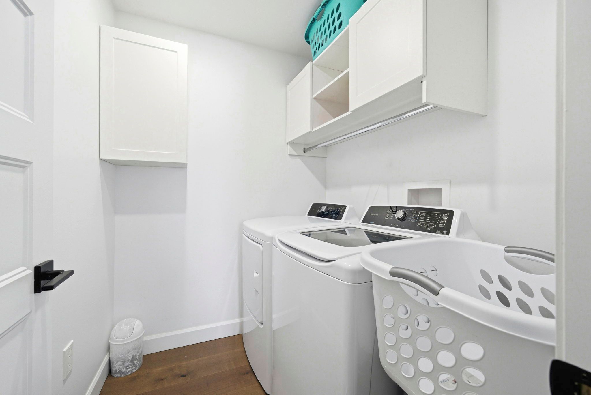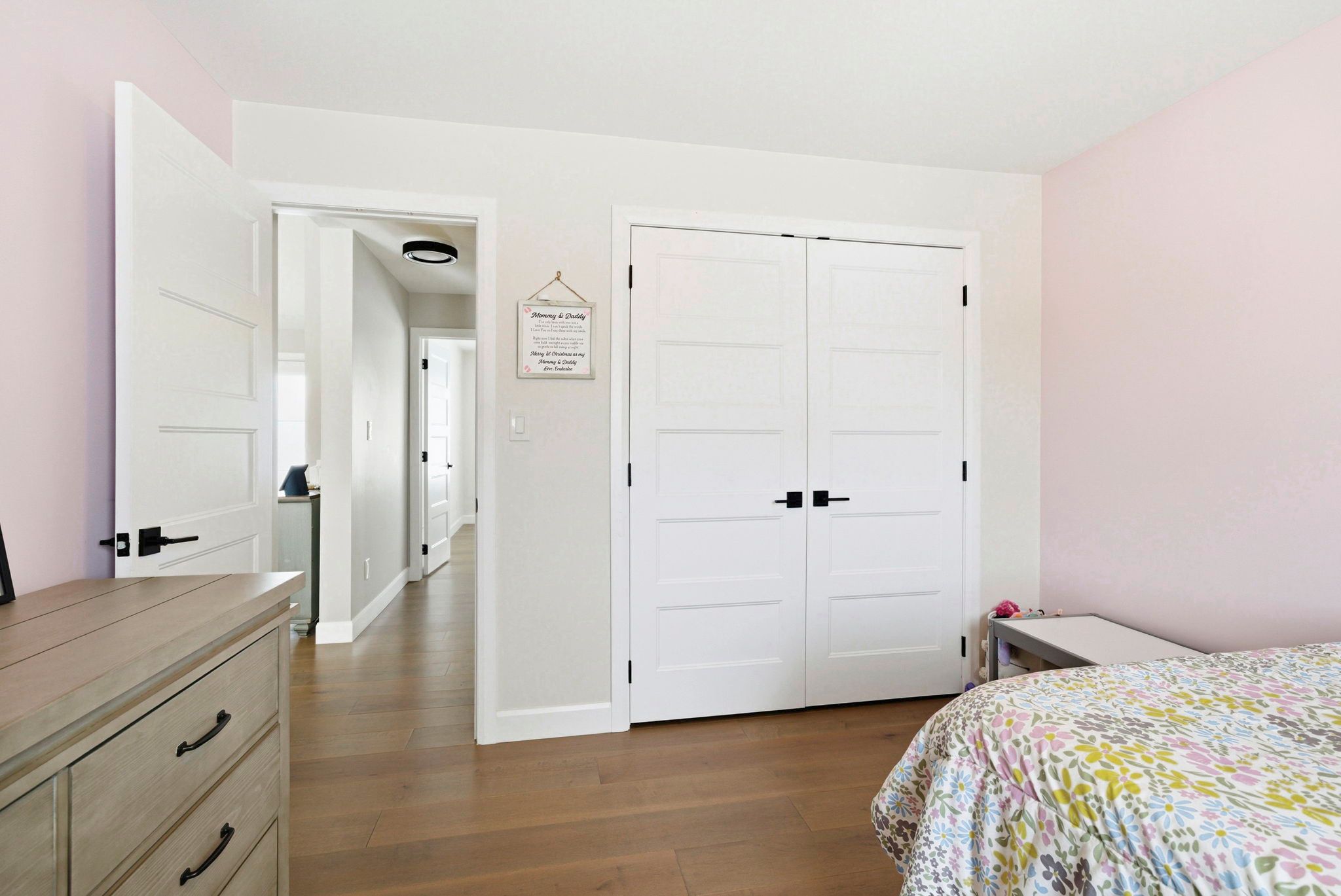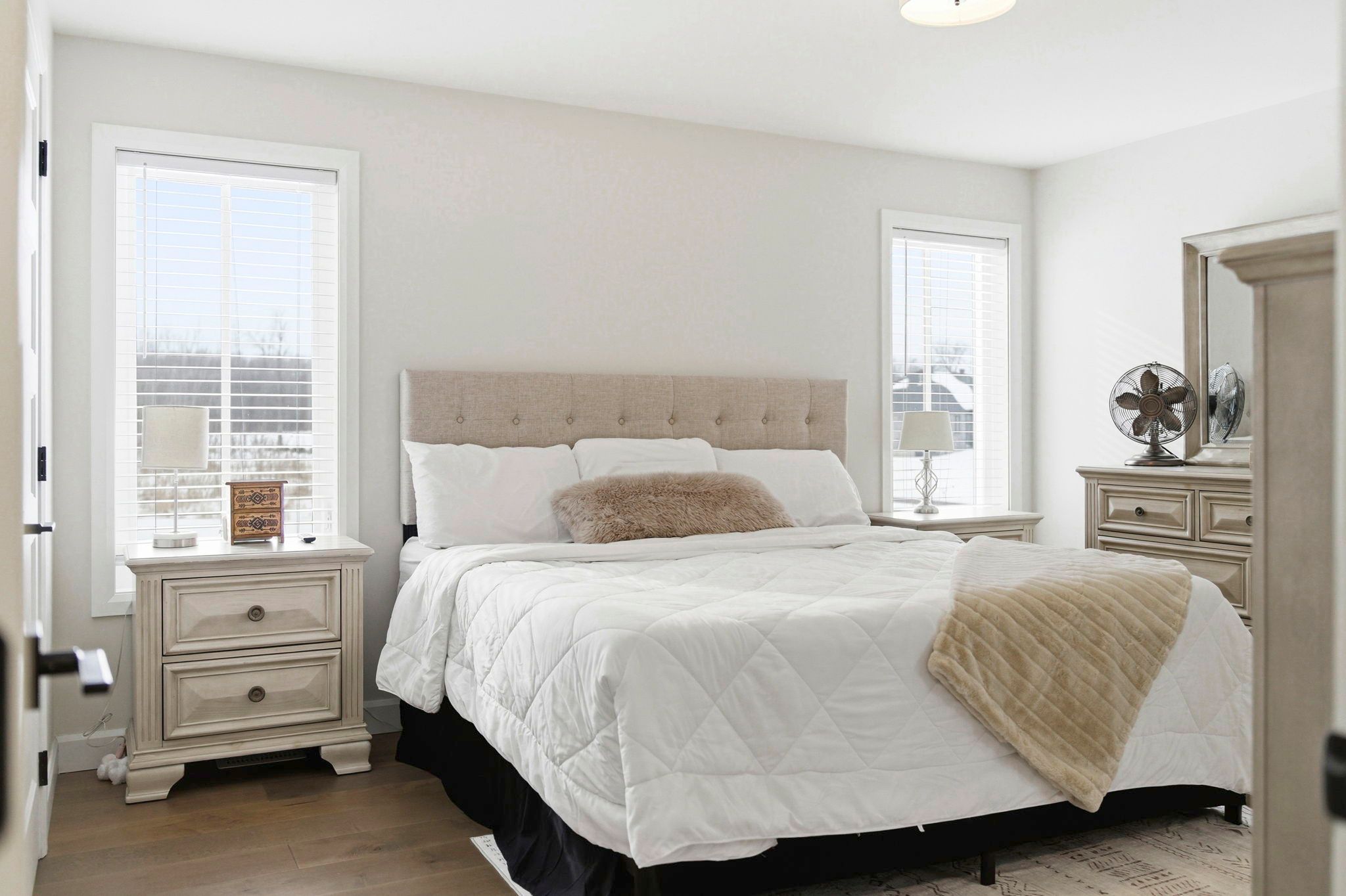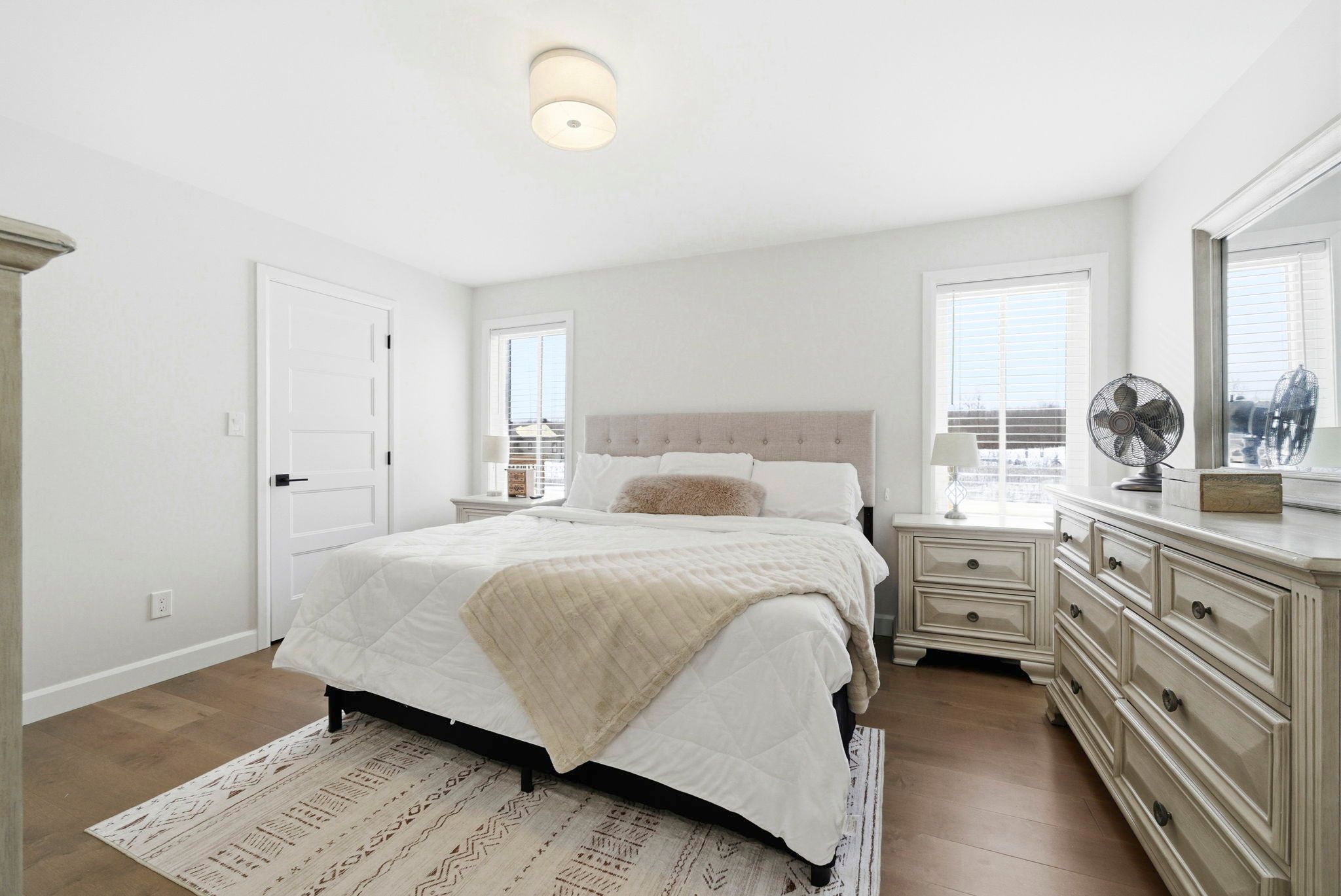 • Bright open-concept living area with engineered hardwood flooring and vaulted ceilings.