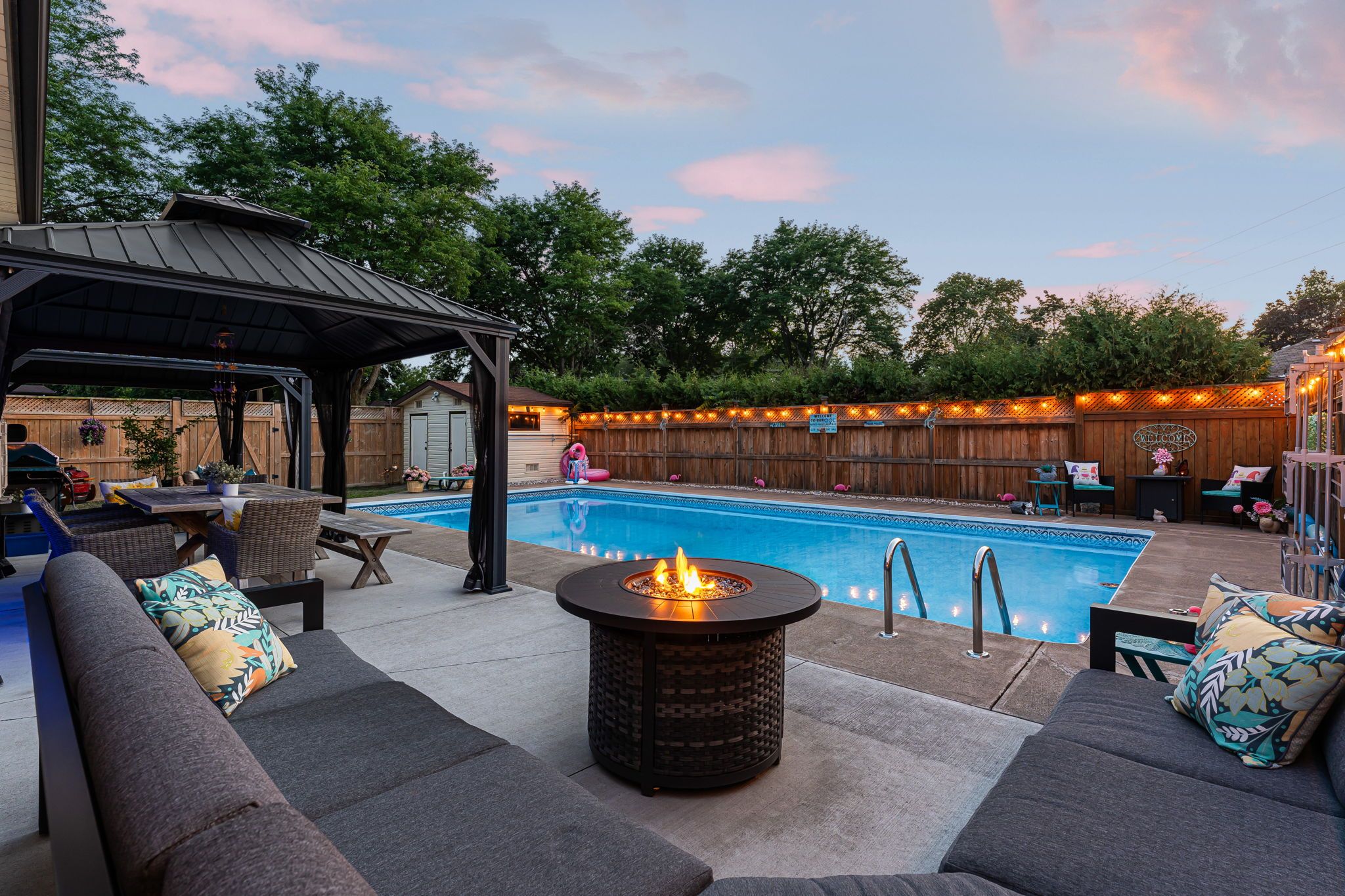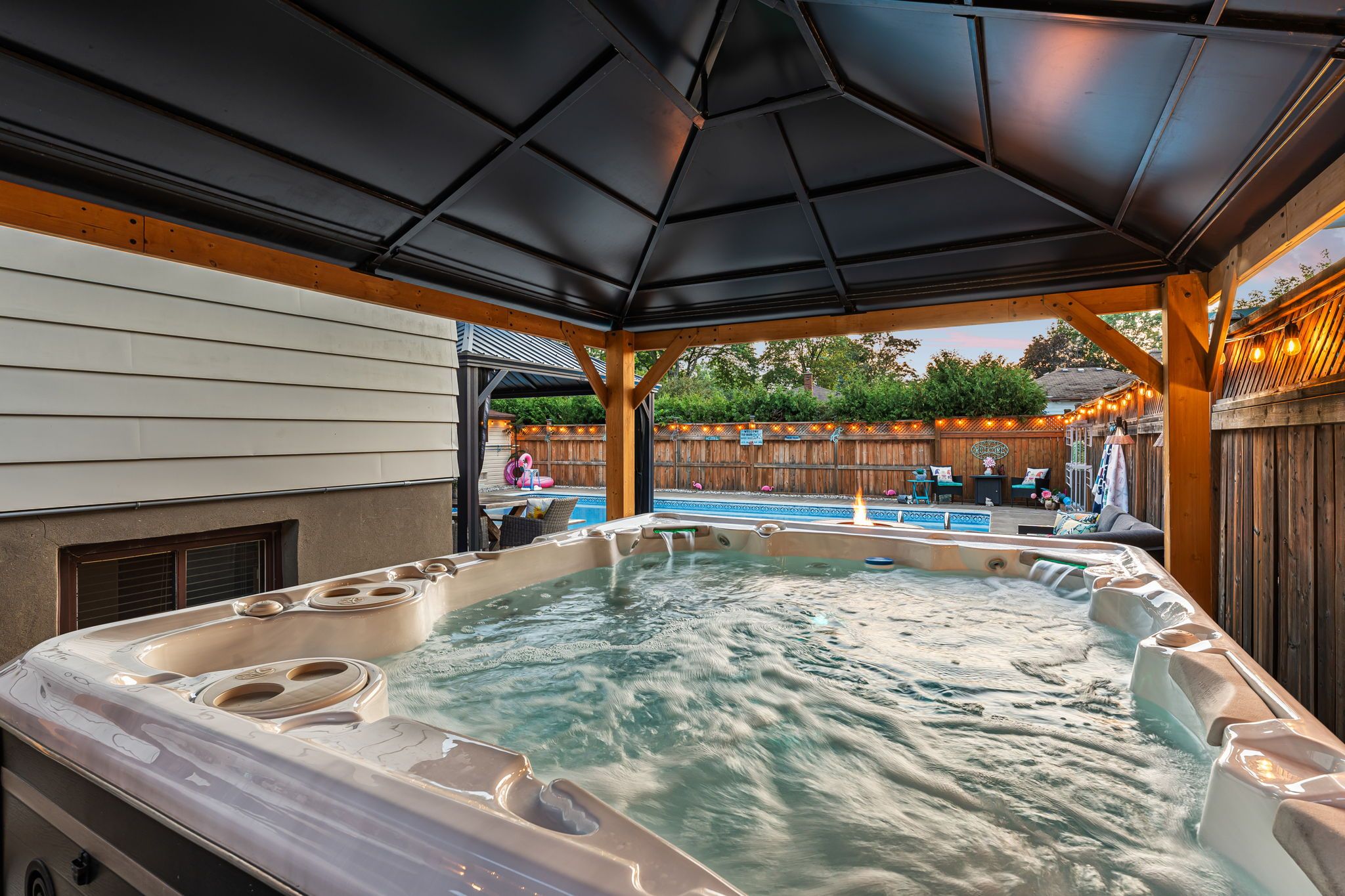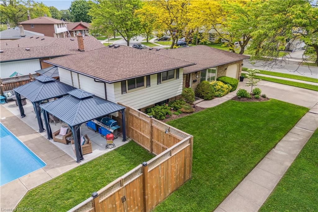 Welcome to your entertainers' paradise situated in one of the most sought-after neighbourhoods in niagara falls. This spacious 3+1 bedroom side split home offers approximately 2000 sq ft of finished living space and sits on a gorgeous 6600sq ft corner lot, surrounded by mature trees and parks. Enjoy the ultimate in unparalleled hosting in your private outdoor oasis that features a giant 30x18 inground pool (all equipment 2021 and will stay in poolhouse), an oversize 10 person hot tub covered by a large gazebo, a range of outdoor cooking appliances including 2 propane bbqs, as well as several dining and lounging areas under two more large gazebos. Your hosting continues through the sunroom to the xl garage that is currently set up as a sports bar and dining area, but can easily be converted back into a parking garage with ample workshop space. Not to be outdone by the spectacular exterior, step inside into the serene open dining area that features a cozy bay window and leads into the recently updated kitchen. All new countertops, backsplash and appliances, and sleek recessed lighting creates a modern farmhouse kitchen, and the abundance of countertop and storage space means cooking is not a task, it is a joy! There are three spacious bedrooms on the upper level that share a well appointed four piece bathroom. Step down to the large living room with beautiful original back-lit oak cabinets. This leads into the bonus room that can be used as a playroom, office, exercise room or lounge area. Another good-size bedroom and two-piece bathroom adds to the downstairs living space, with a built-in shower in the next room. Need storage? We've got you covered! The huge laundry room in the basement features washer and dryer, along with shelving and storage space in abundance. Immaculately maintained. Close proximity to schools, highway access, transport, shops, parks and more.