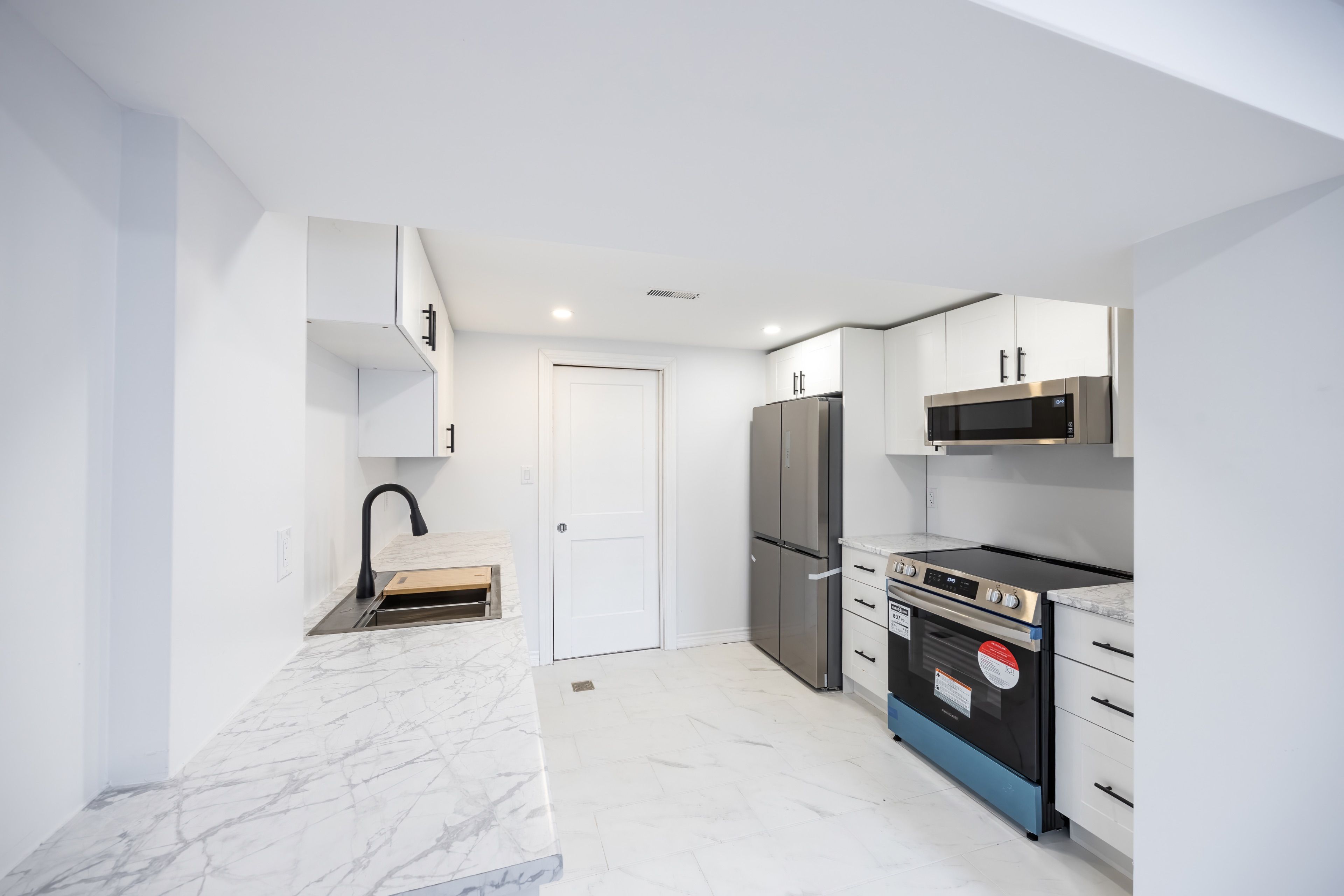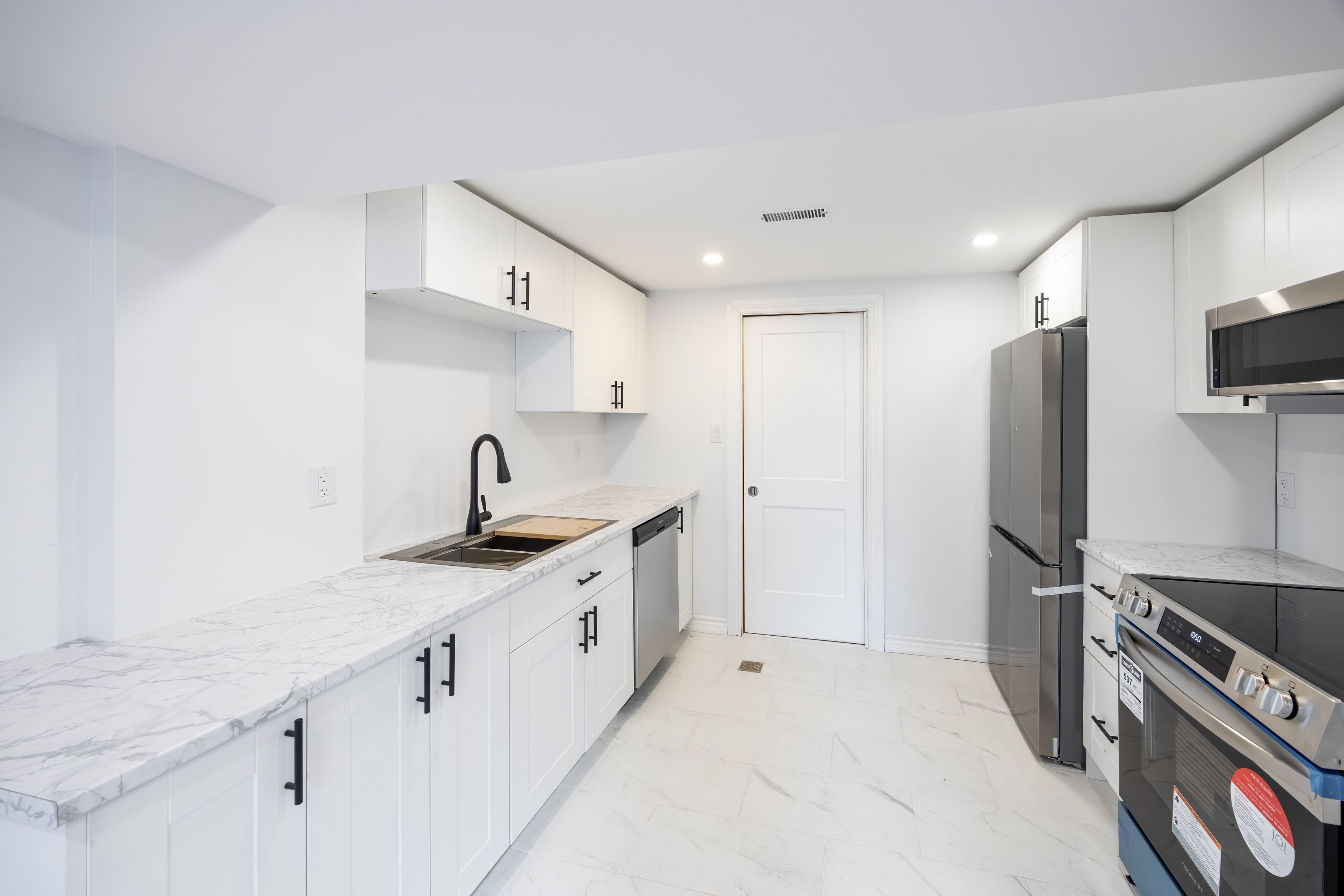 • Modern kitchen with stainless steel appliances and ample cabinetry.