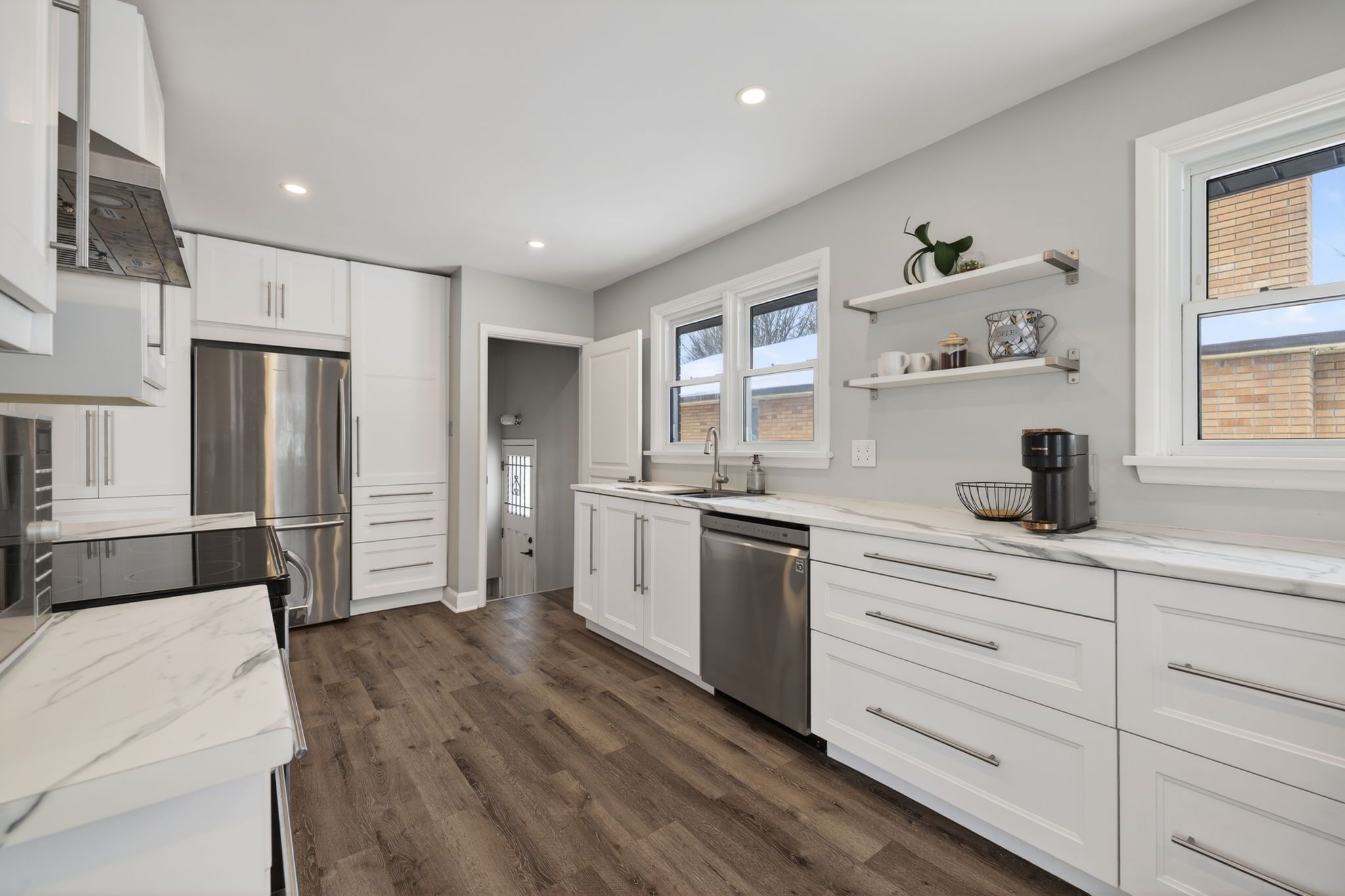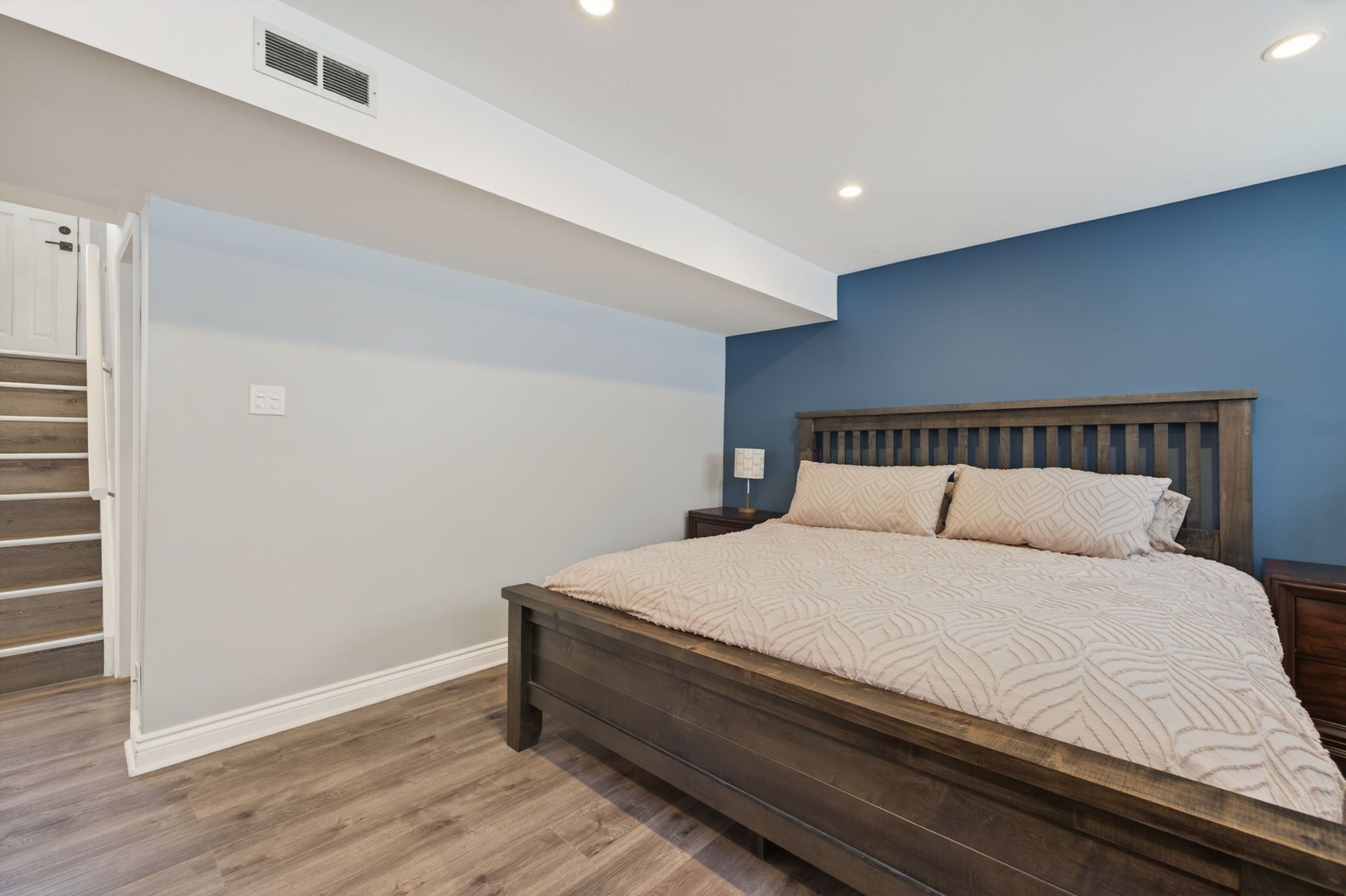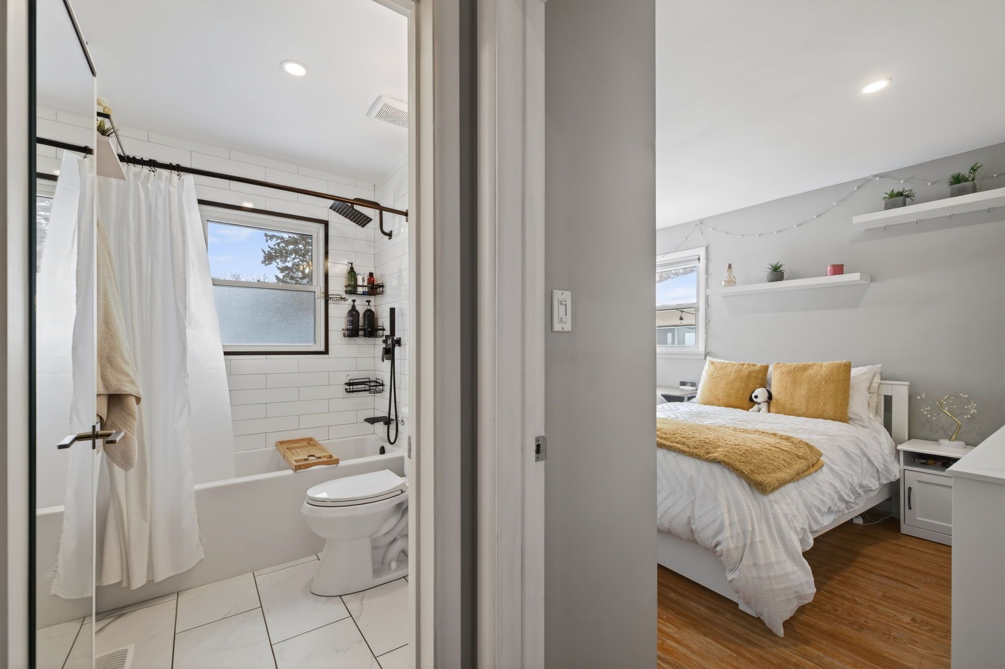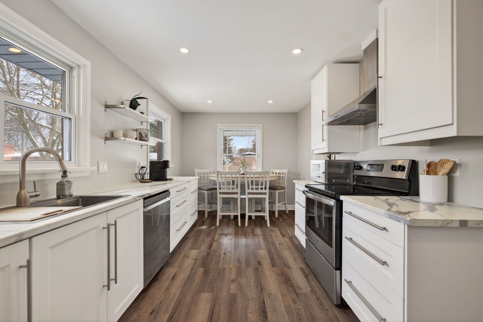 Welcome to this beautifully renovated all brick 3 bed, 2 full bath bungalow in a premium central london location close to downtown, major amenities, transit and easy access to western university and fanshawe college. This stylish mid century modern inspired home offers outstanding curb appeal with black accented windows, soffits and doors, plus a covered front porch that welcomes you inside. The spacious lot measures approximately 47 feet by 188 feet, offering exceptional outdoor space for kids, pets, gardening, future expansion or potential additional residential unit opportunities. Parking is abundant with a three car driveway and a detached single garage, ideal for storage, hobbies or a workshop. The backyard is also equipped with electrical already pre run for a future hot tub, adding extra comfort and lifestyle appeal. Inside, the main level features a functional front mudroom with bench seating and coat hooks that opens into a bright living room highlighted by a gas fireplace with brick surround. Original hardwood flooring flows through the living room and all three main floor bedrooms. The open concept kitchen has been fully renovated with white cabinetry, generous pantry and storage space, stainless steel appliances and a comfortable dining area. Three generously sized bedrooms are complemented by a beautifully updated four piece bathroom featuring subway tile surround and modern black fixtures. The finished lower level offers excellent flexibility with a separate side entrance, high end laminate flooring, oversized windows, a large recreation room with defined bedroom area, an additional four piece bathroom and plenty of storage with laundry facilities. This move in ready bungalow combines timeless character, thoughtful updates and a highly desirable location, making it ideal for families, professionals, investors or those seeking long term value in the heart of the city.
