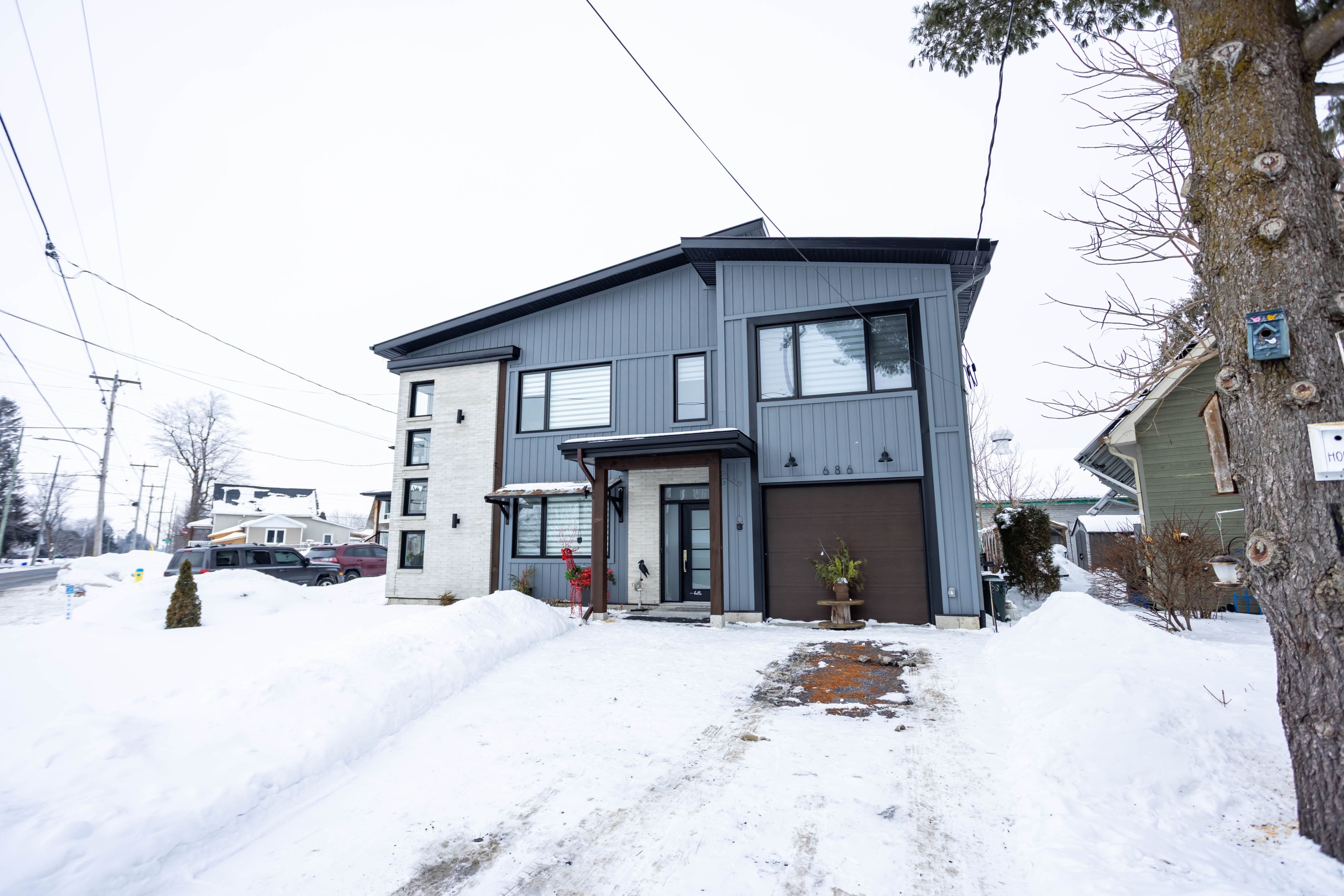 Welcome to 686 st. Isidore street in casselman, a truly unique, carpet-free home that blends modern design with functional living in a way that's anything but ordinary. This thoughtfully laid-out 2-bed, 2-bath property offers a bright and airy living experience, with the main living space elevated to the second floor to maximize light, flow, and comfort. The second level is the heart of the home, featuring an open-concept kitchen, dining, and living area with vaulted ceilings and oversized windows that flood the space with natural light. The stylish kitchen is equipped with granite countertops, a centre island ideal for casual meals or entertaining, and ample prep and storage space. The dining area opens directly onto a deck, perfect for morning coffee, summer barbecues, or unwinding at the end of the day. The living room is warm and inviting, offering a flexible space to relax or host guests. Also on this level is the primary bedroom, complete with a walk-in closet, a striking accent wall, and convenient ensuite access to the full bathroom. The layout offers both privacy and functionality, making everyday living feel effortless. The main floor provides excellent versatility with a spacious recreation area, a second bedroom, and an additional full bathroom, ideal for guests, a home office, or a cozy retreat for family members. Outside, enjoy a fully fenced backyard featuring a shed and gazebo, offering both storage and a comfortable outdoor space to relax or entertain. Located in the growing community of casselman, this home offers small-town charm with excellent commuter access. Conveniently situated just a short drive to ottawa and within easy reach of montreal, it's an ideal location for those seeking a quieter lifestyle without sacrificing connectivity. Close to schools, parks, shops, and everyday amenities, this home delivers comfort, style, and location all in one exceptional package.