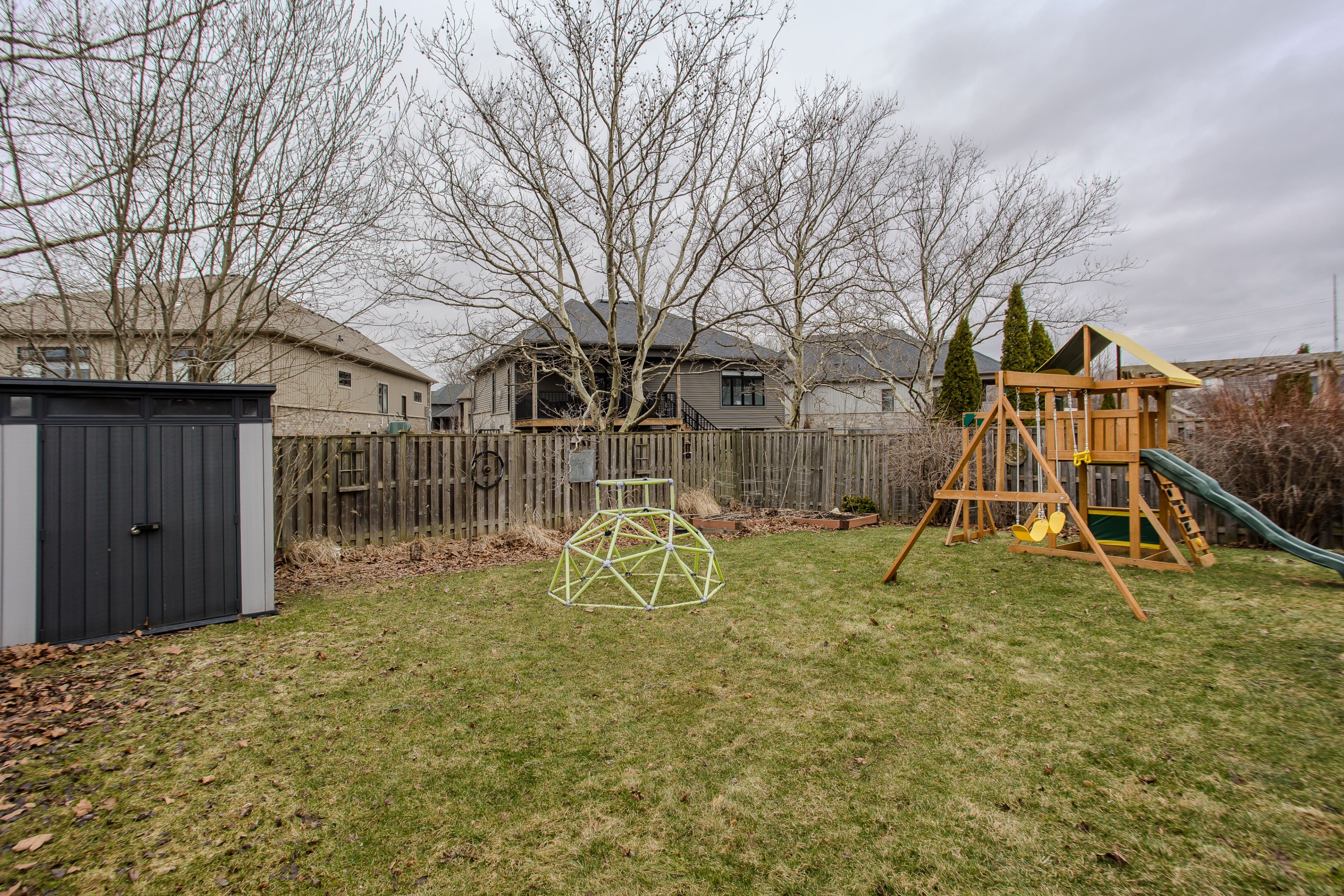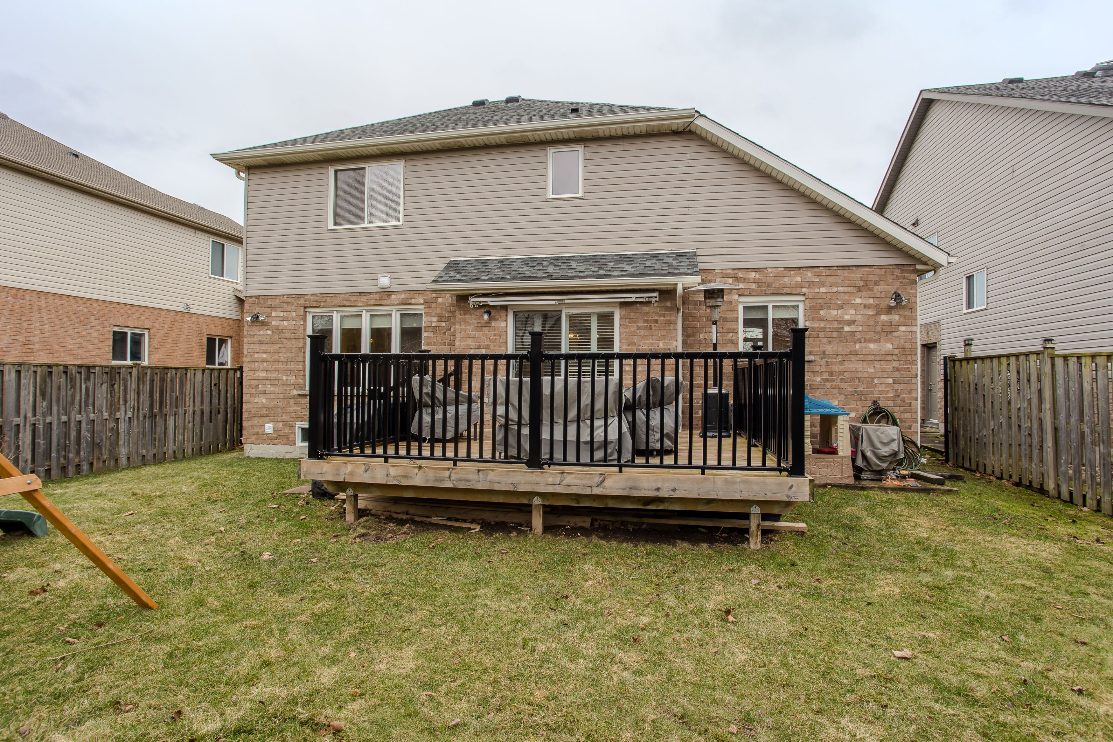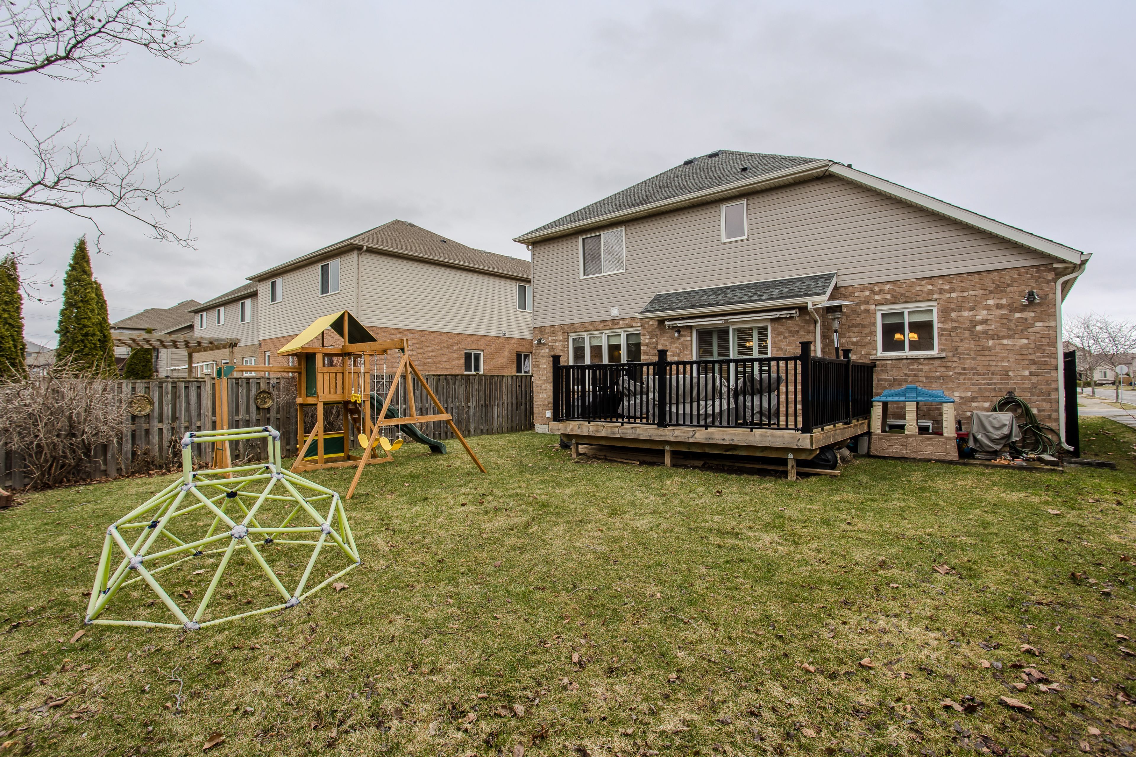 • Fully fenced backyard with a wooden deck and plenty of green space.
