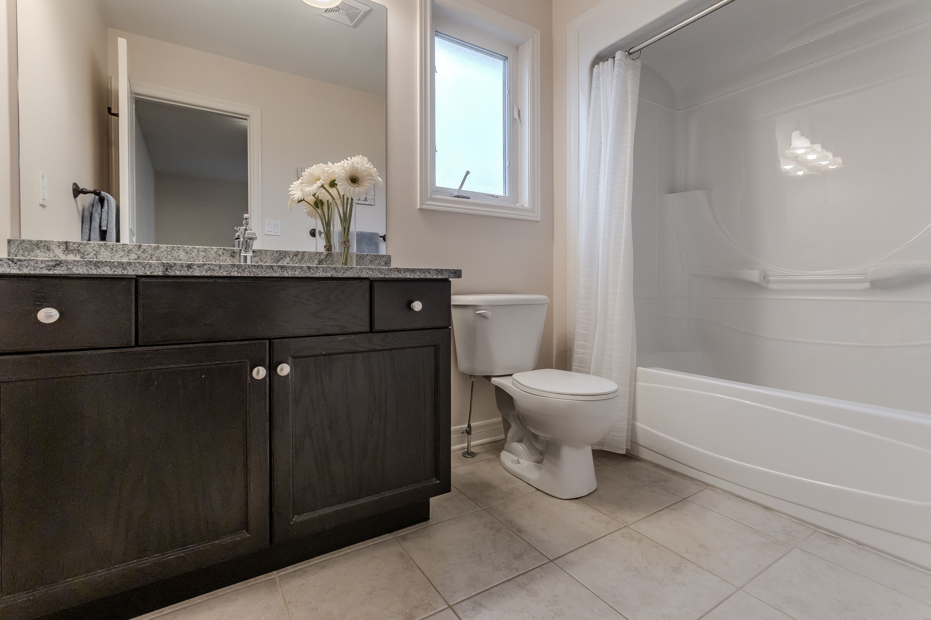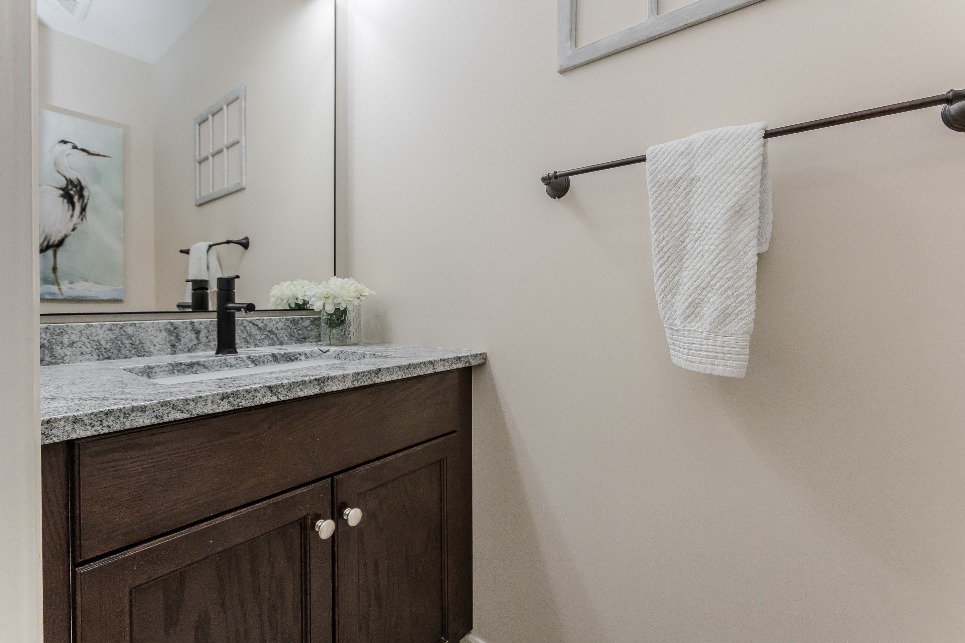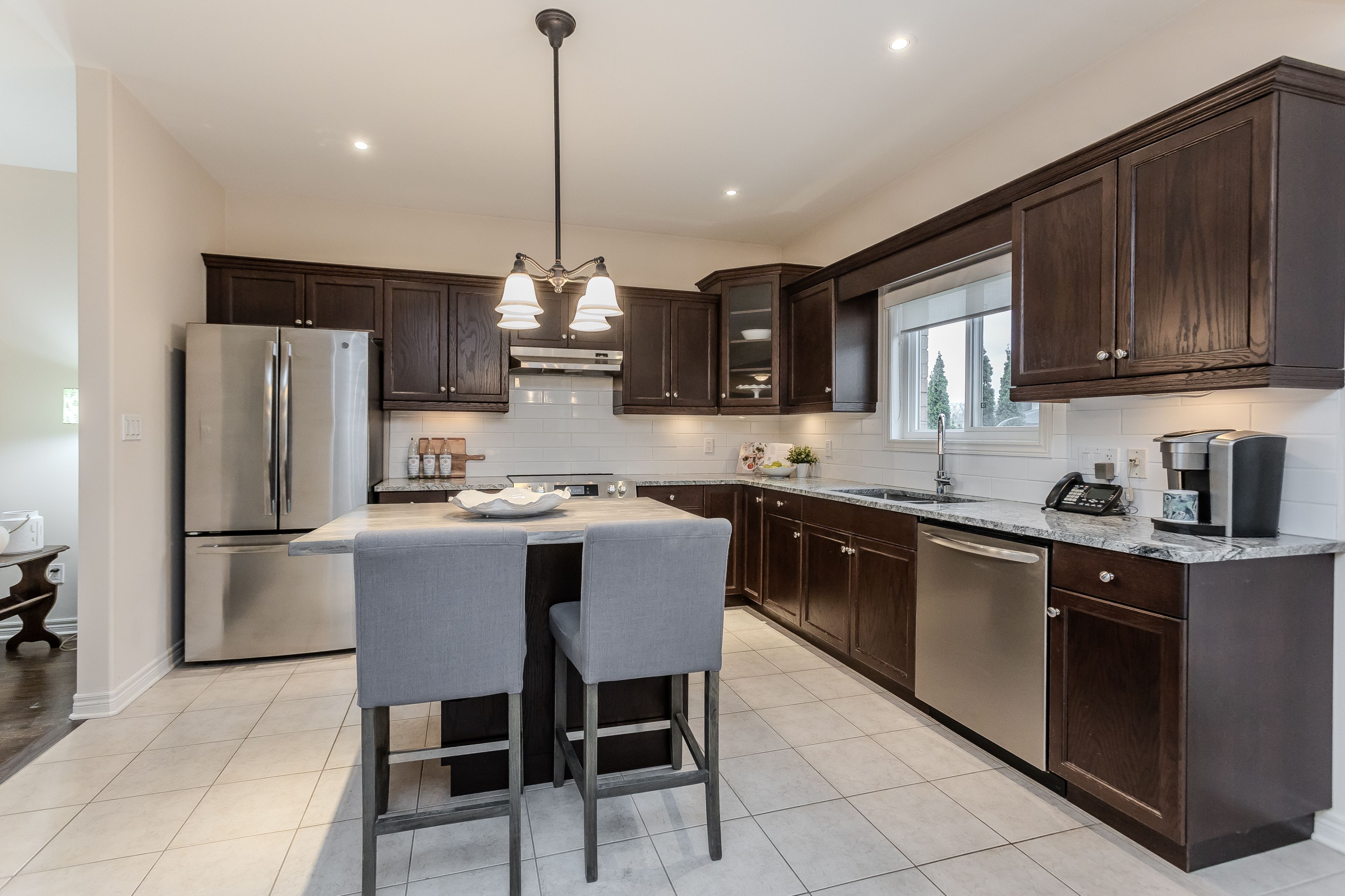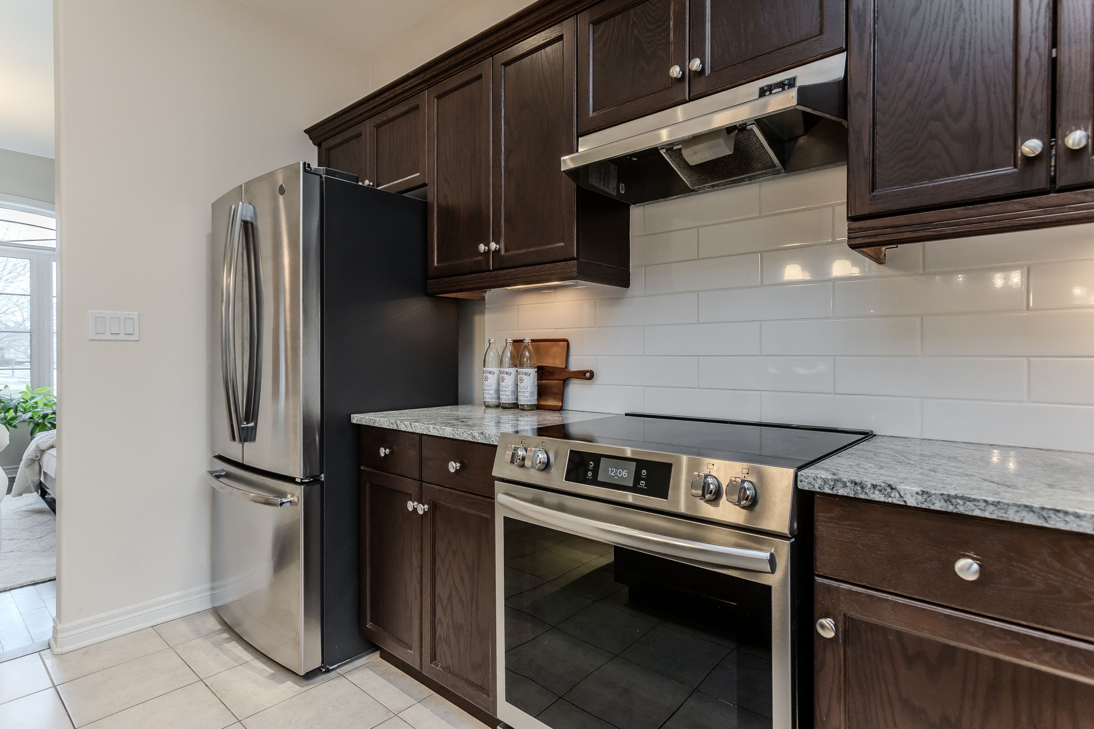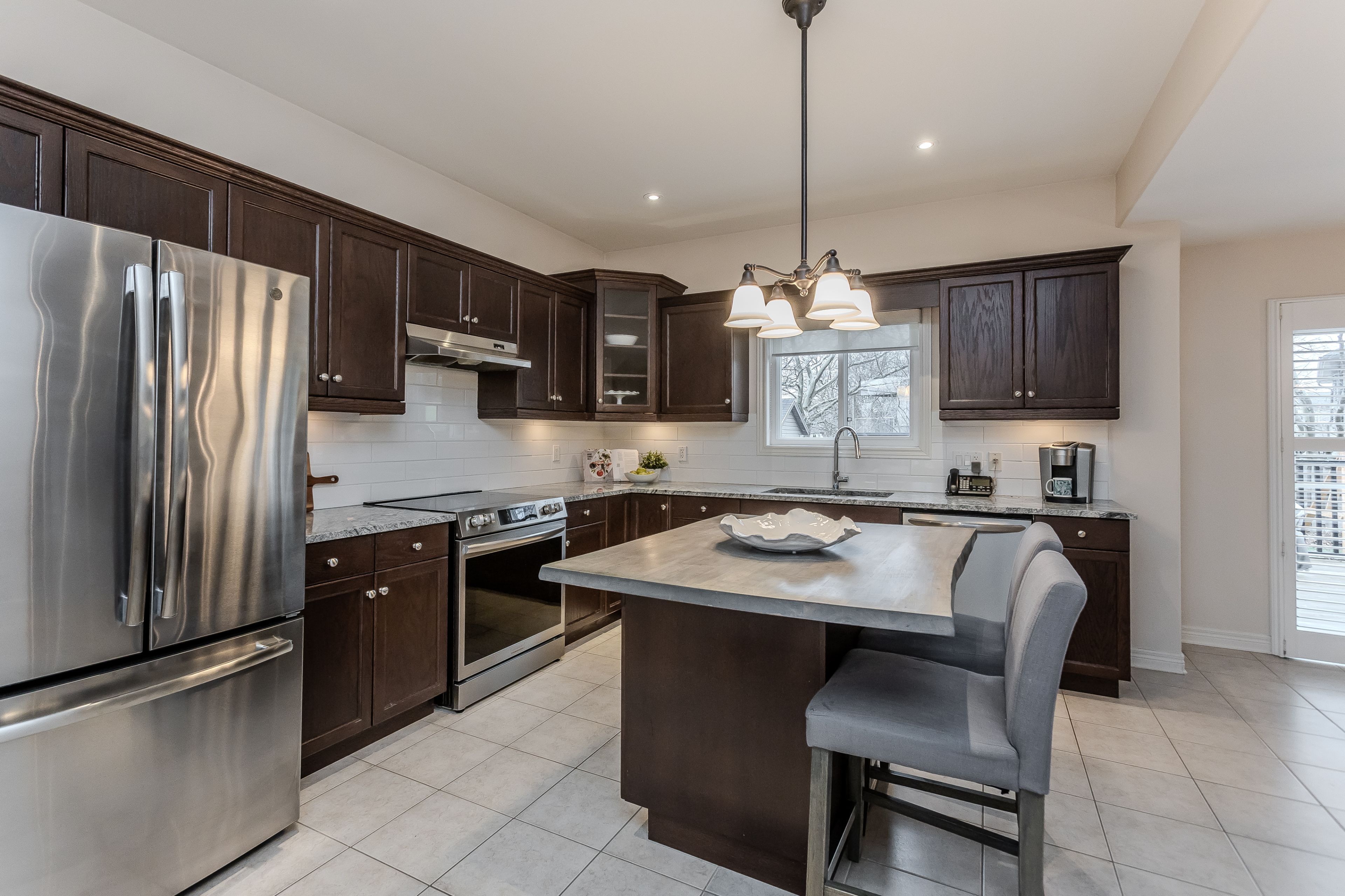 • Spacious kitchen with granite countertops and stainless steel appliances.