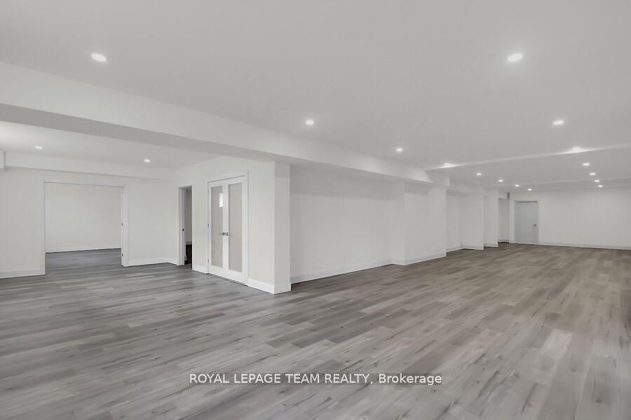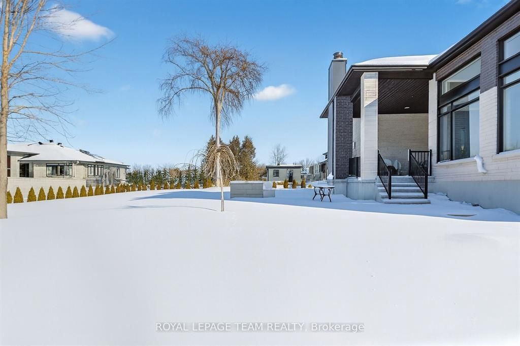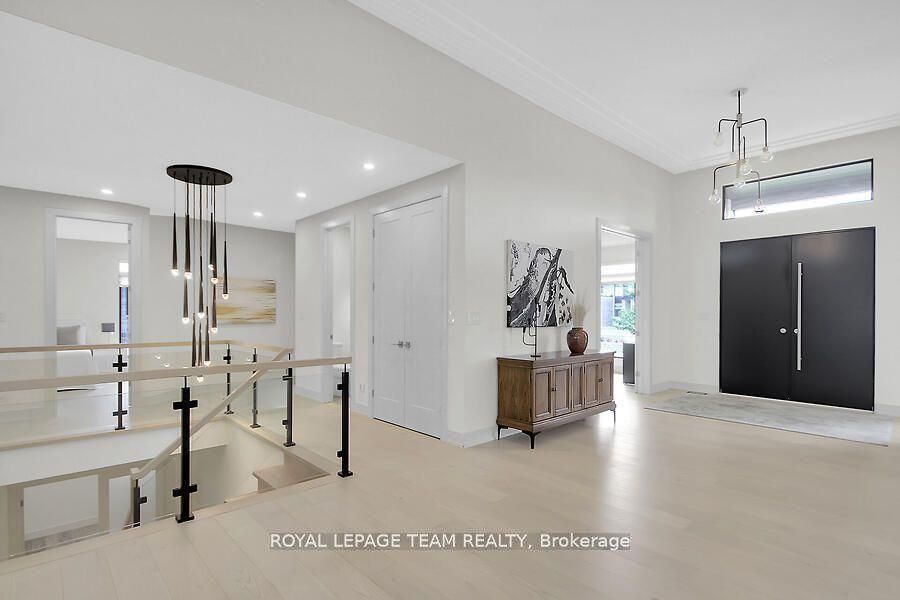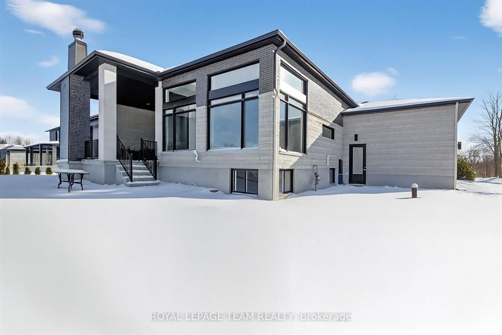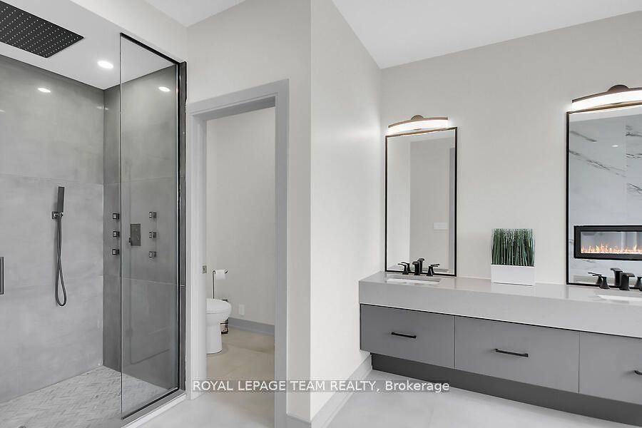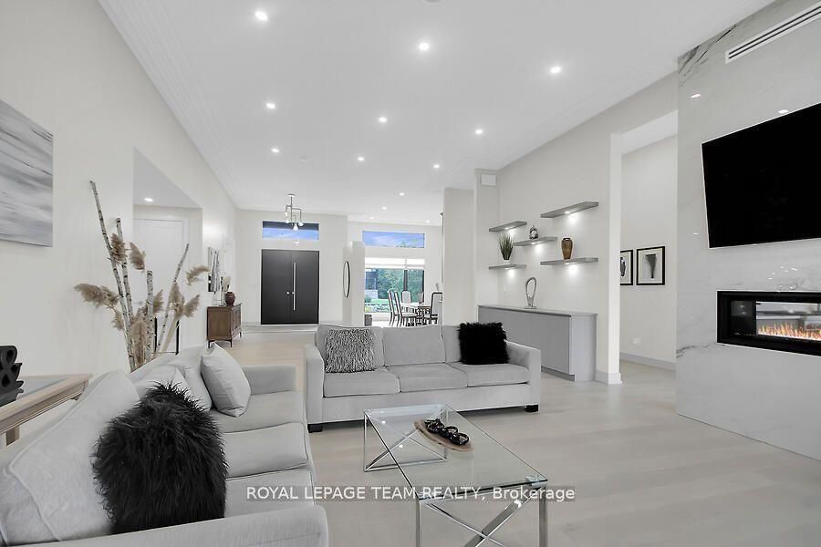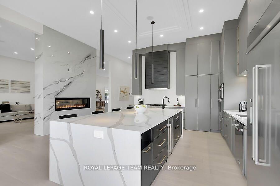 This expansive custom-built bungalow offers 6 bedrooms and 5 bathrooms, showcasing elegant wide plank oak hardwood flooring, oversized windows, and exquisite craftsmanship throughout. Designed with modern living in mind, the open-concept layout welcomes you through a stylish foyer into a grand living room that seamlessly extends to a covered veranda, complete with a cozy wood-burning fireplace. The chef-inspired kitchen is a true centrepiece, featuring a stunning waterfall quartz island with generous seating, quartz backsplash, gas cooktop, and a bright breakfast nook perfectly complemented by a separate formal dining room for more refined gatherings. The luxurious primary suite is a private retreat, boasting a spacious walk-in closet with custom vanity, a 5-piece ensuite with double sinks, a glass-enclosed shower, freestanding soaker tub, and a gas fireplace for added comfort. Three additional bedrooms are located on the main floor, two of which offer private en-suites. The fully finished lower level features heated floors throughout, three large bedrooms, a full bathroom, and a vast recreational space with endless potential for entertainment or relaxation. Additional highlights include a heated 3-car attached garage with soaring 20-ft ceilings and a fully integrated smart home system with wireless control and state-of-the-art 5-zone wireless speakers. Please note that lower level rooms have been virtually staged.