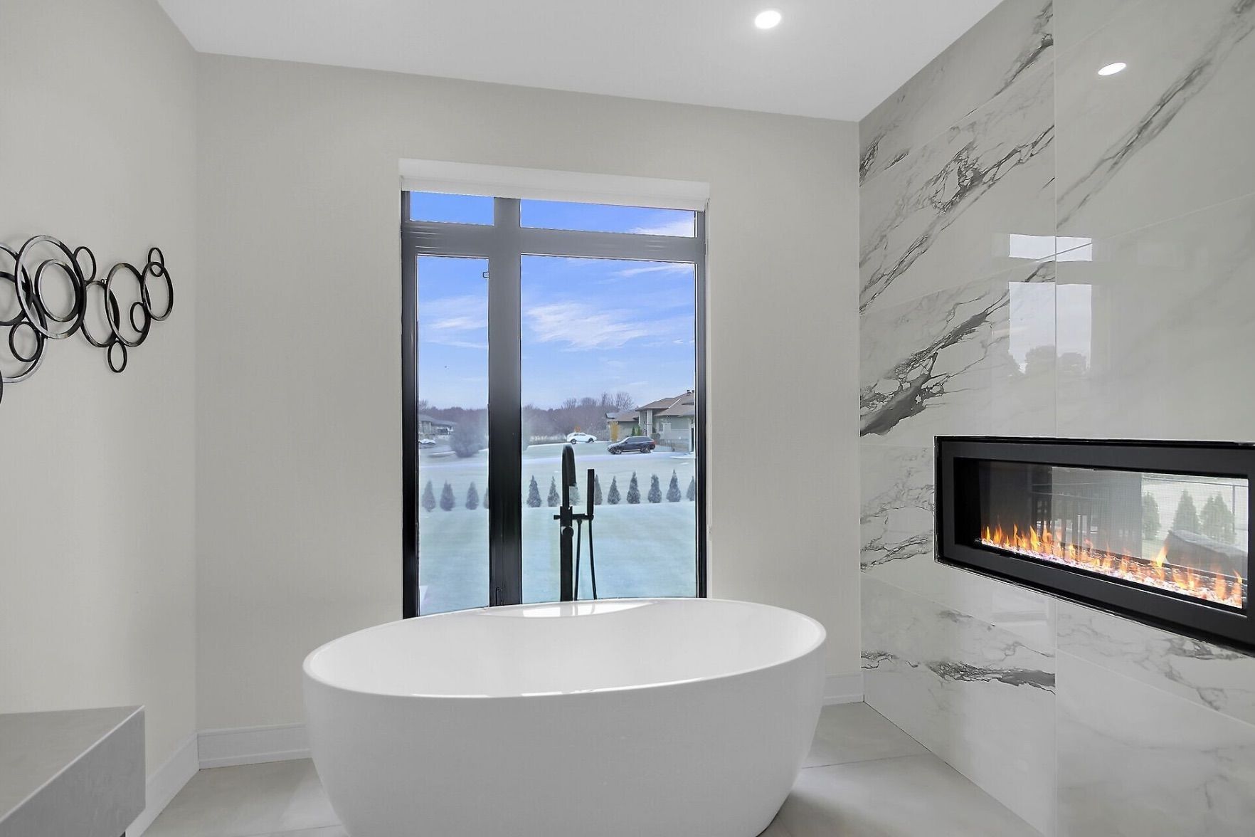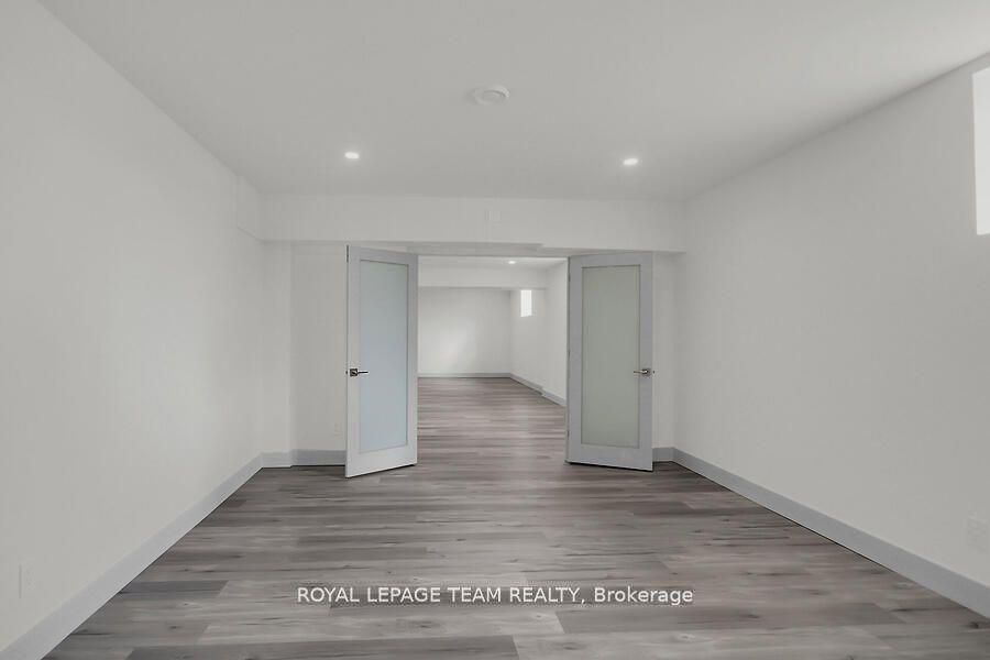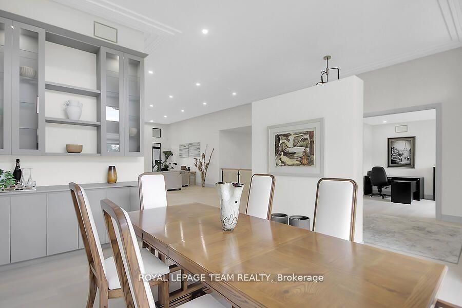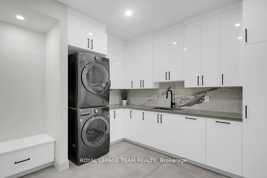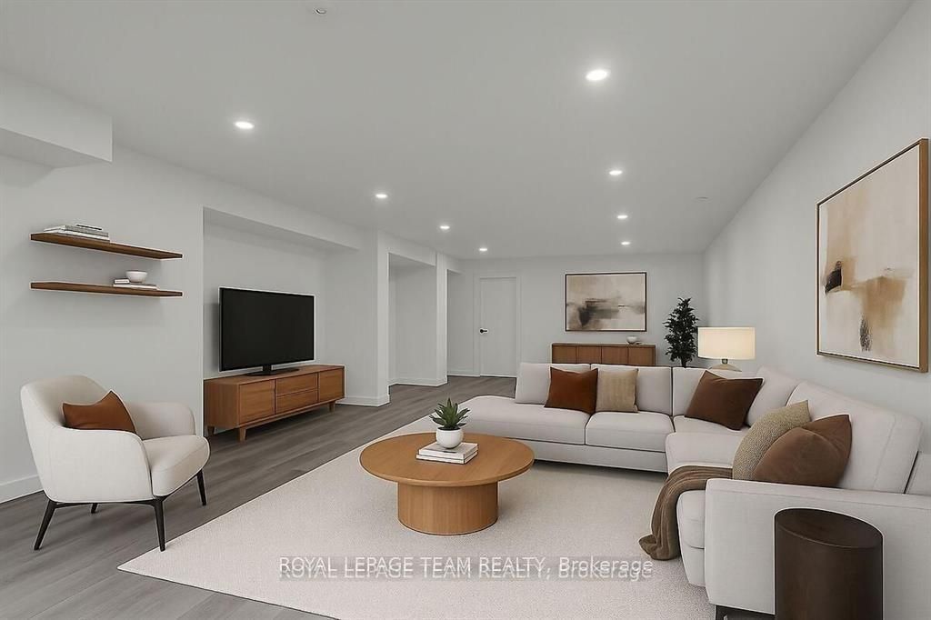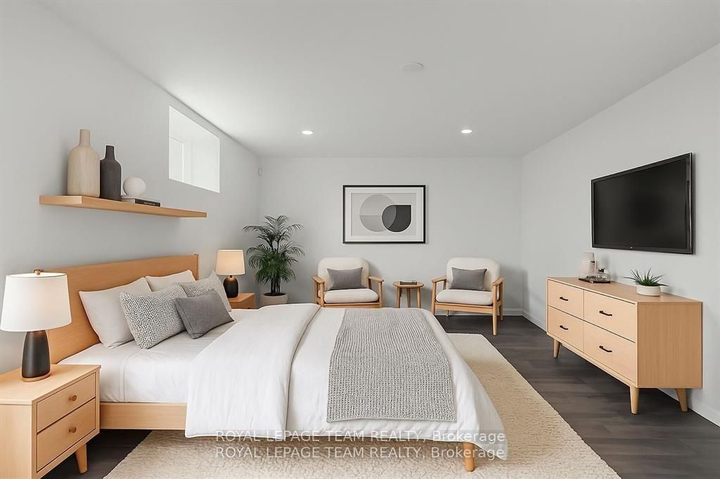 This expansive custom-built bungalow offers 6 bedrooms and 5 bathrooms, showcasing elegant wide plank oak hardwood flooring, oversized windows, and exquisite craftsmanship throughout. Designed with modern living in mind, the open-concept layout welcomes you through a stylish foyer into a grand living room that seamlessly extends to a covered veranda, complete with a cozy wood-burning fireplace. The chef-inspired kitchen is a true centrepiece, featuring a stunning waterfall quartz island with generous seating, quartz backsplash, gas cooktop, and a bright breakfast nook perfectly complemented by a separate formal dining room for more refined gatherings. The luxurious primary suite is a private retreat, boasting a spacious walk-in closet with custom vanity, a 5-piece ensuite with double sinks, a glass-enclosed shower, freestanding soaker tub, and a gas fireplace for added comfort. Three additional bedrooms are located on the main floor, two of which offer private en-suites. The fully finished lower level features heated floors throughout, three large bedrooms, a full bathroom, and a vast recreational space with endless potential for entertainment or relaxation. Additional highlights include a heated 3-car attached garage with soaring 20-ft ceilings and a fully integrated smart home system with wireless control and state-of-the-art 5-zone wireless speakers. Please note that lower level rooms have been virtually staged.