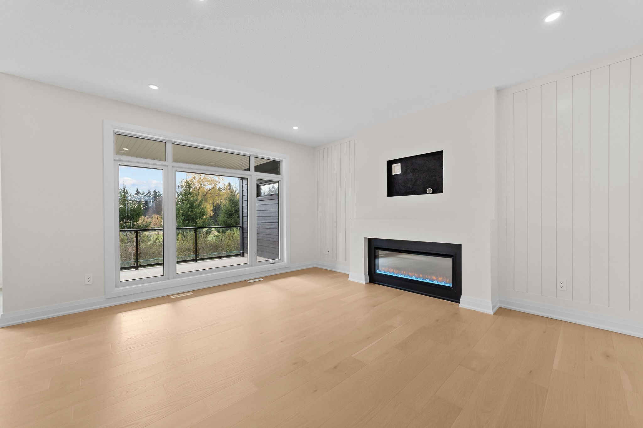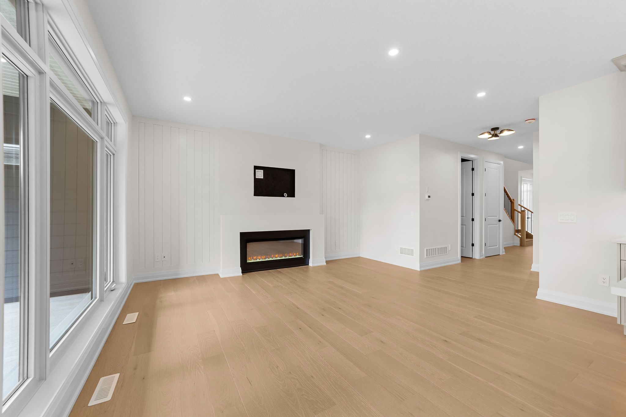 • Warm family room featuring an electric fireplace and stylish wall paneling.