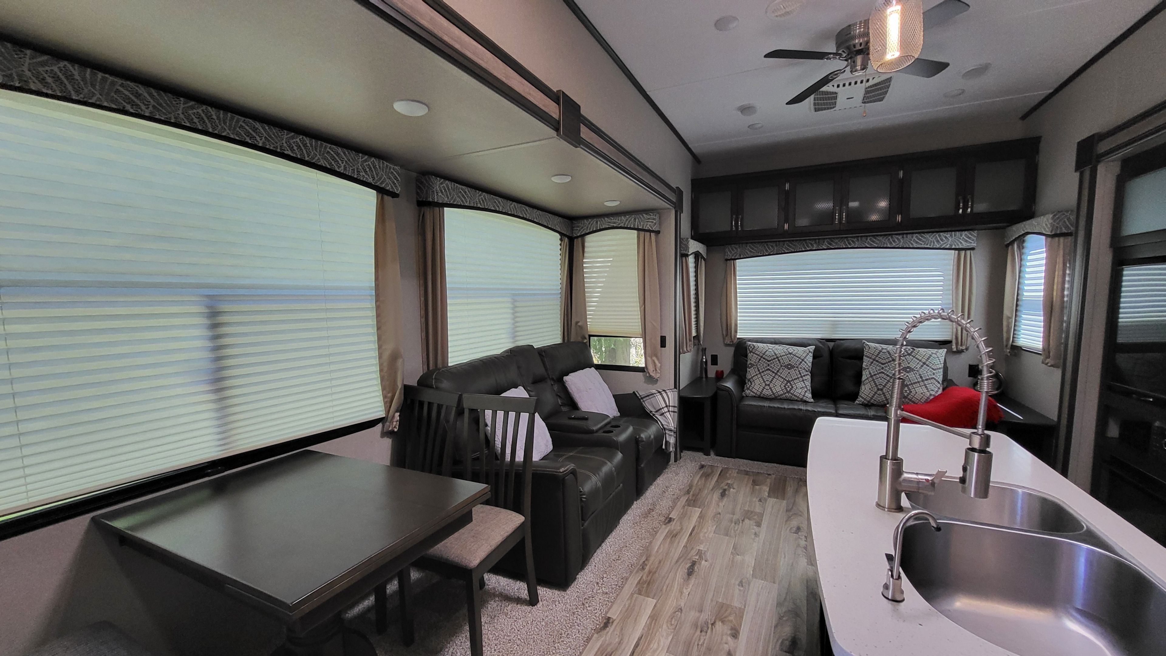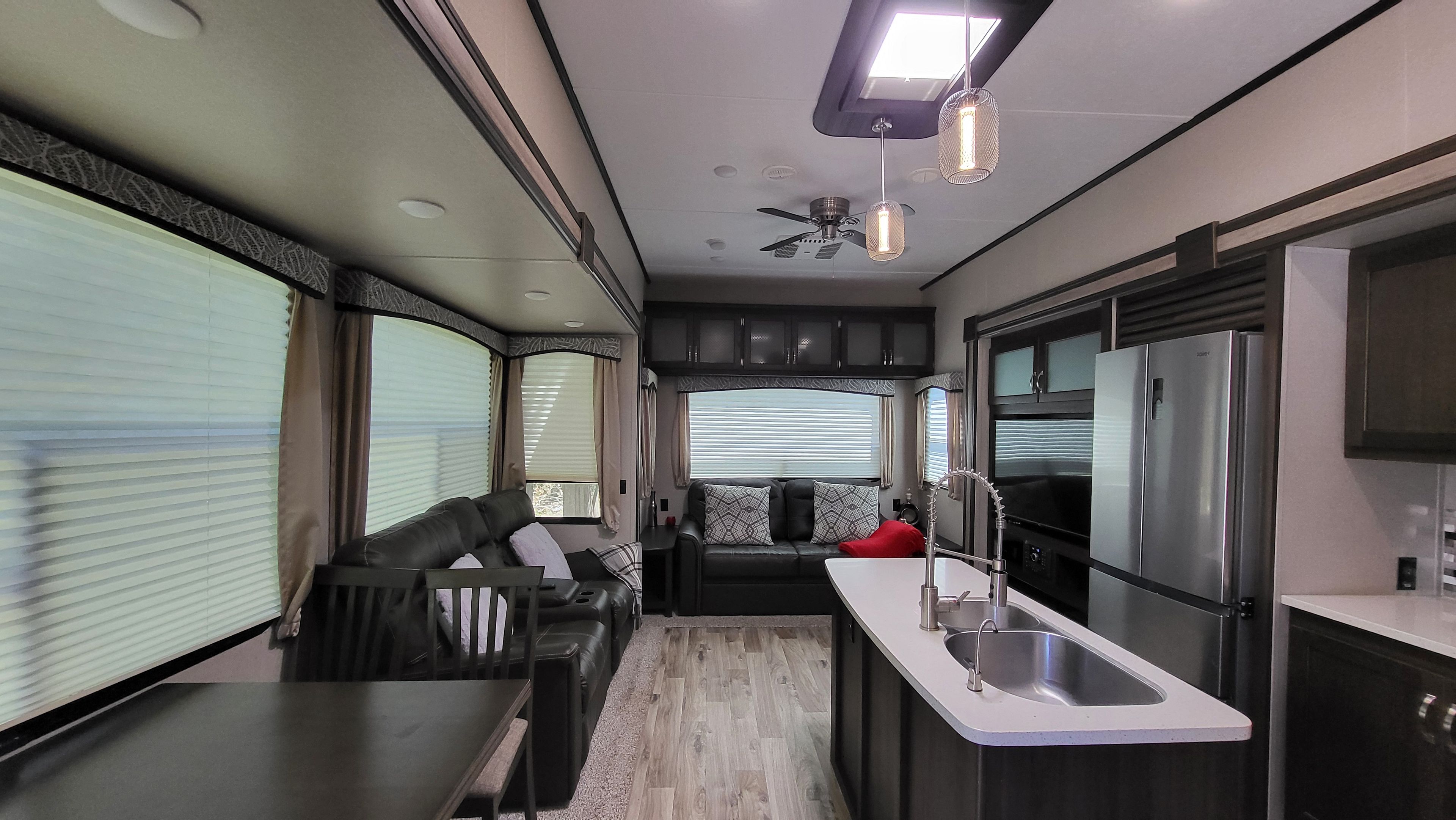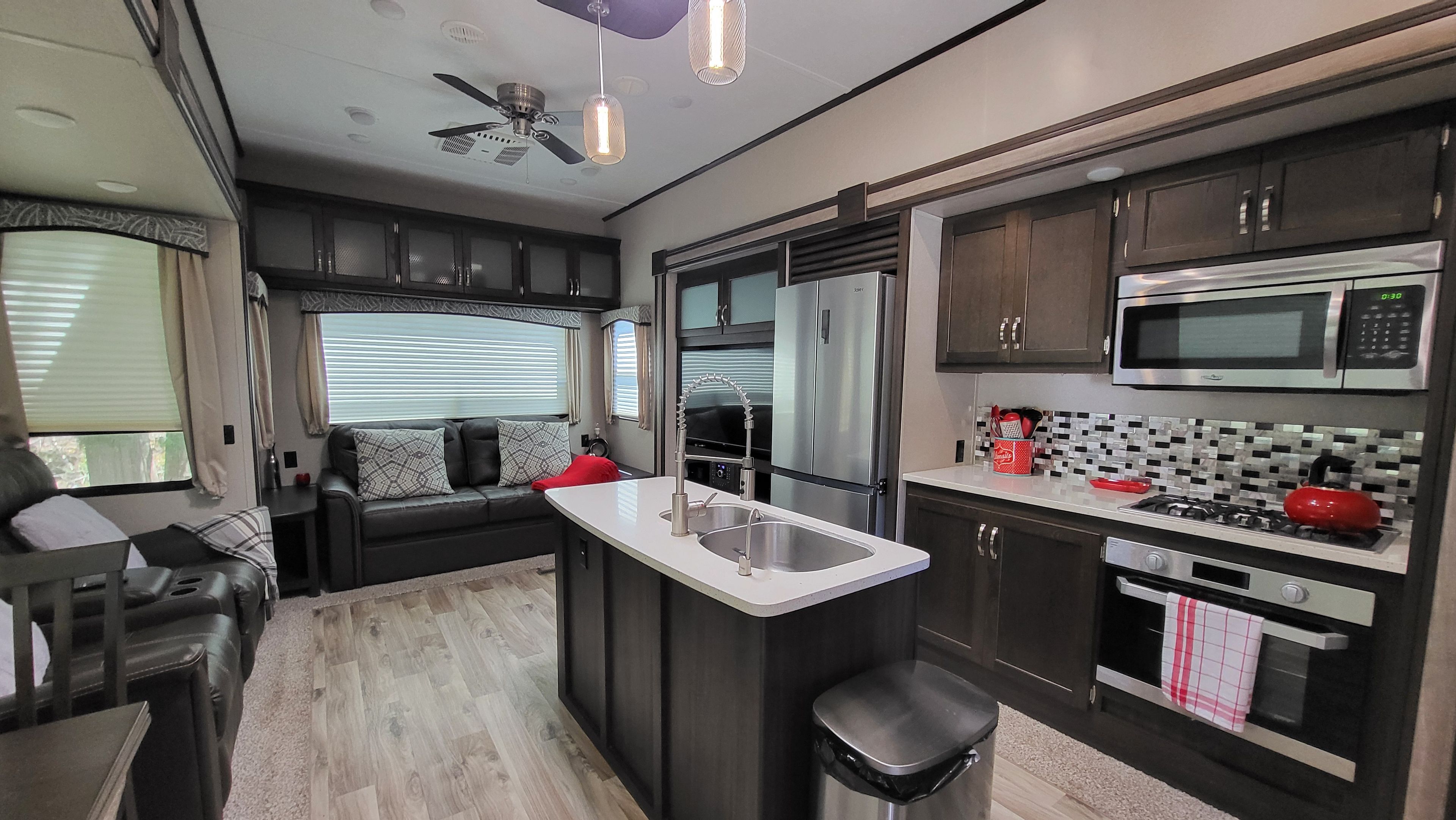 • Modern one-bedroom mobile home with two lofts, perfect for entertaining.
