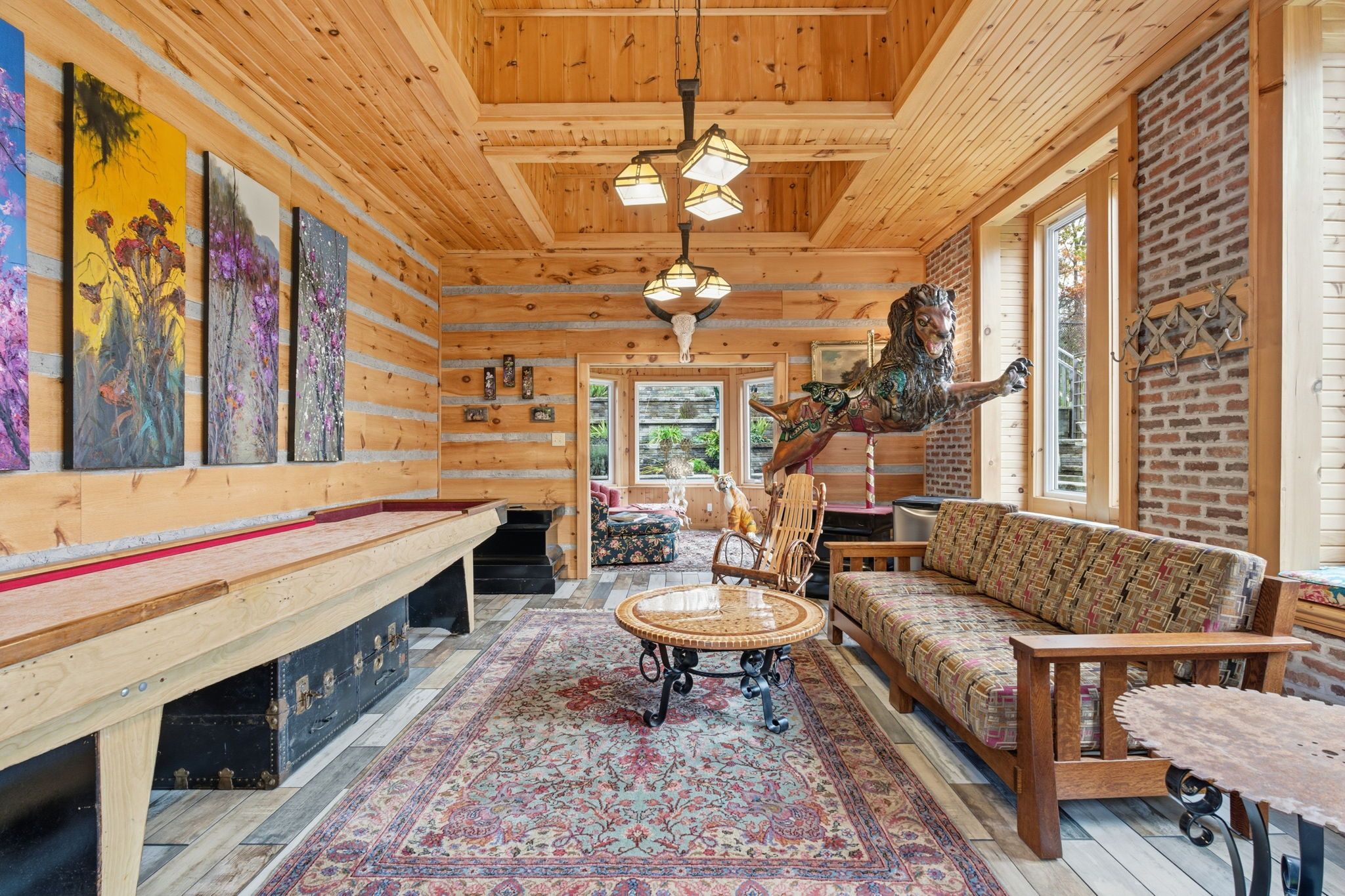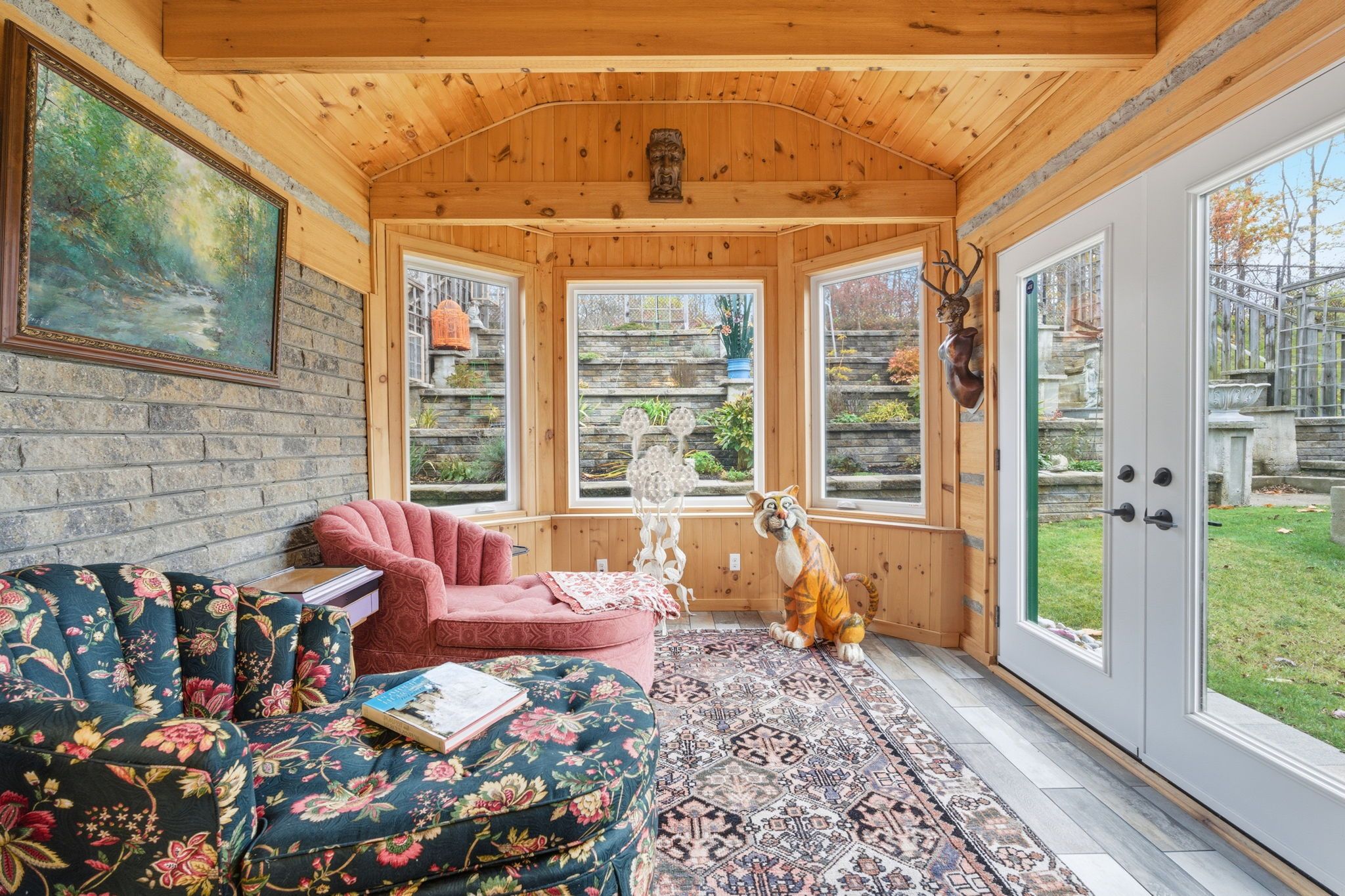 Welcome to 69 hunter way - a one-of-a-kind, architecturally stunning home in the highly sought-after west brant neighborhood. Offering over 3,000 sq. Ft. Of finished living space, this detached 4+1-bedroom, 5 bathroom home blends modern updates with bold, eclectic character. The heart of the home is the dramatic great room, featuring soaring two-storey ceilings, oversized windows, and a striking fireplace that creates an unforgettable first impression. The updated kitchen offers style and function with sleek finishes, ample storage, and an open layout that flows effortlessly into the living and dining spaces - perfect for entertaining. Upstairs, the spacious primary suite includes a large walk-in closet and private ensuite. Three additional bedrooms provide generous space for family, guests, or work-from-home needs. The lower level adds even more flexibility with a fifth bedroom, full bathroom, and a spacious rec/media area - ideal for extended family or teens who want their own space. Outside, enjoy your own backyard retreat designed for relaxation and entertaining. Multiple seating zones, mature landscaping, and the star attraction: a heated 400+ sq. Ft. Bunkie, ideal as a studio, gym, home office, or guest space. With three fireplaces throughout the home and a layout that's anything but ordinary, this property stands out in all the best ways. A rare offering in a family-friendly community close to schools, parks, groceries, and walking trails.