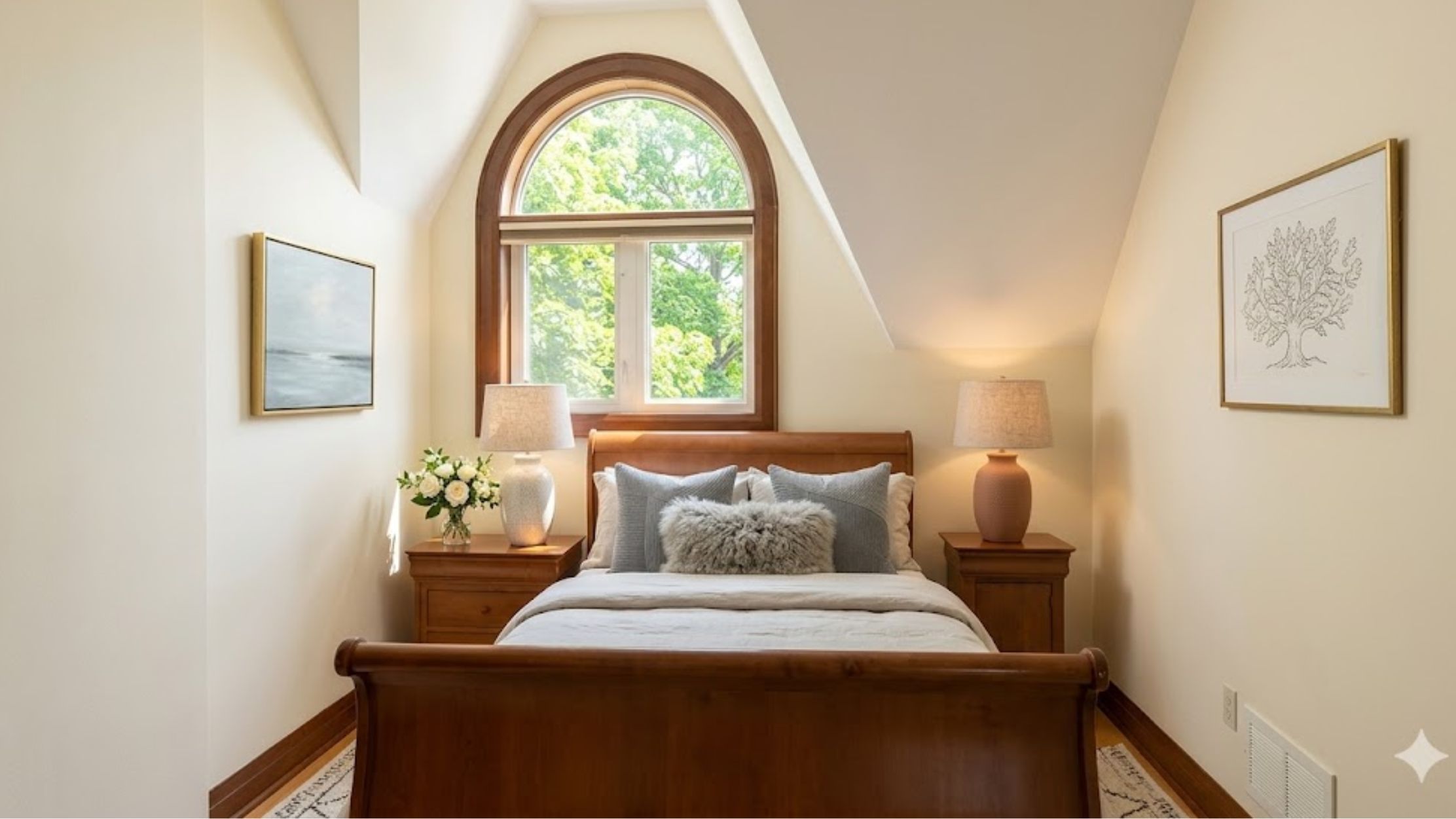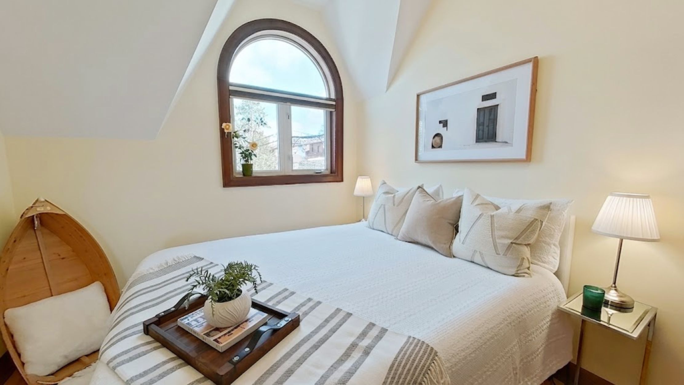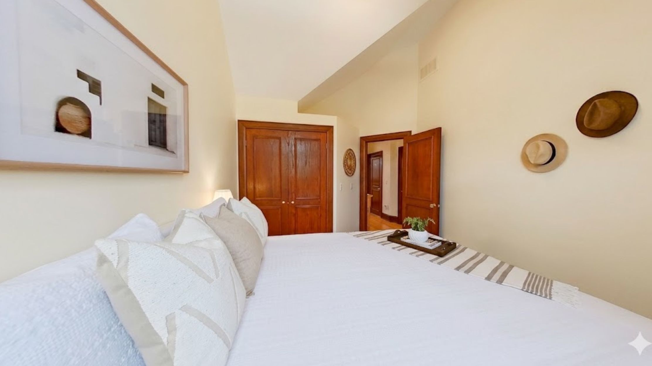 • Three spacious bedrooms with vaulted ceilings and large windows.