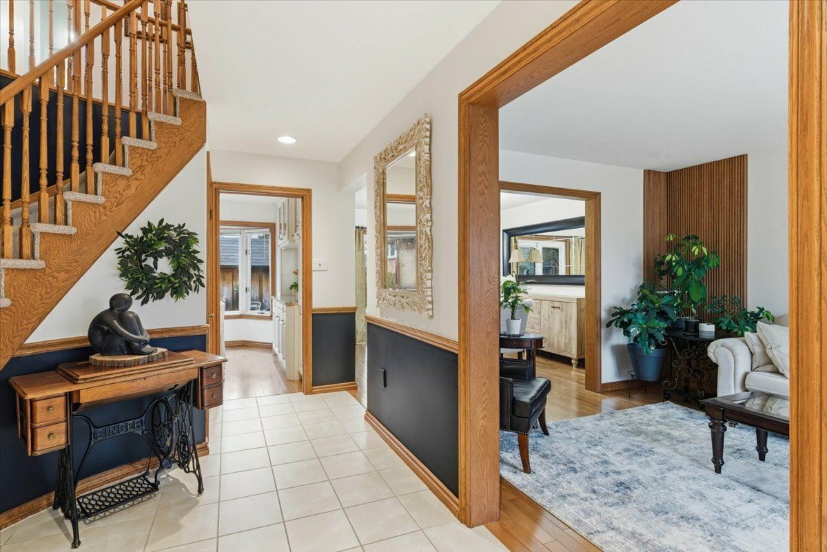 • Hardwood flooring and natural wood details throughout the home.