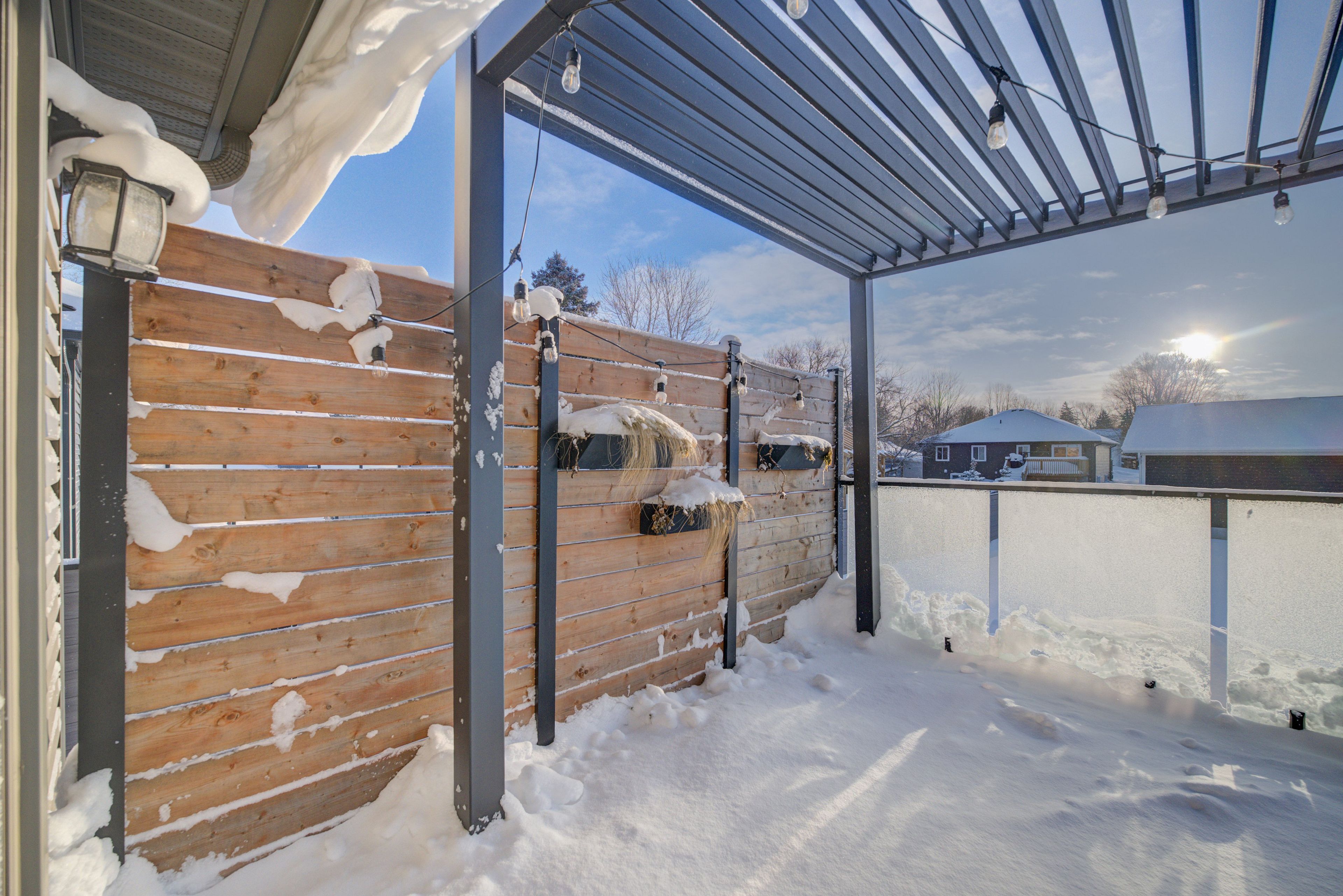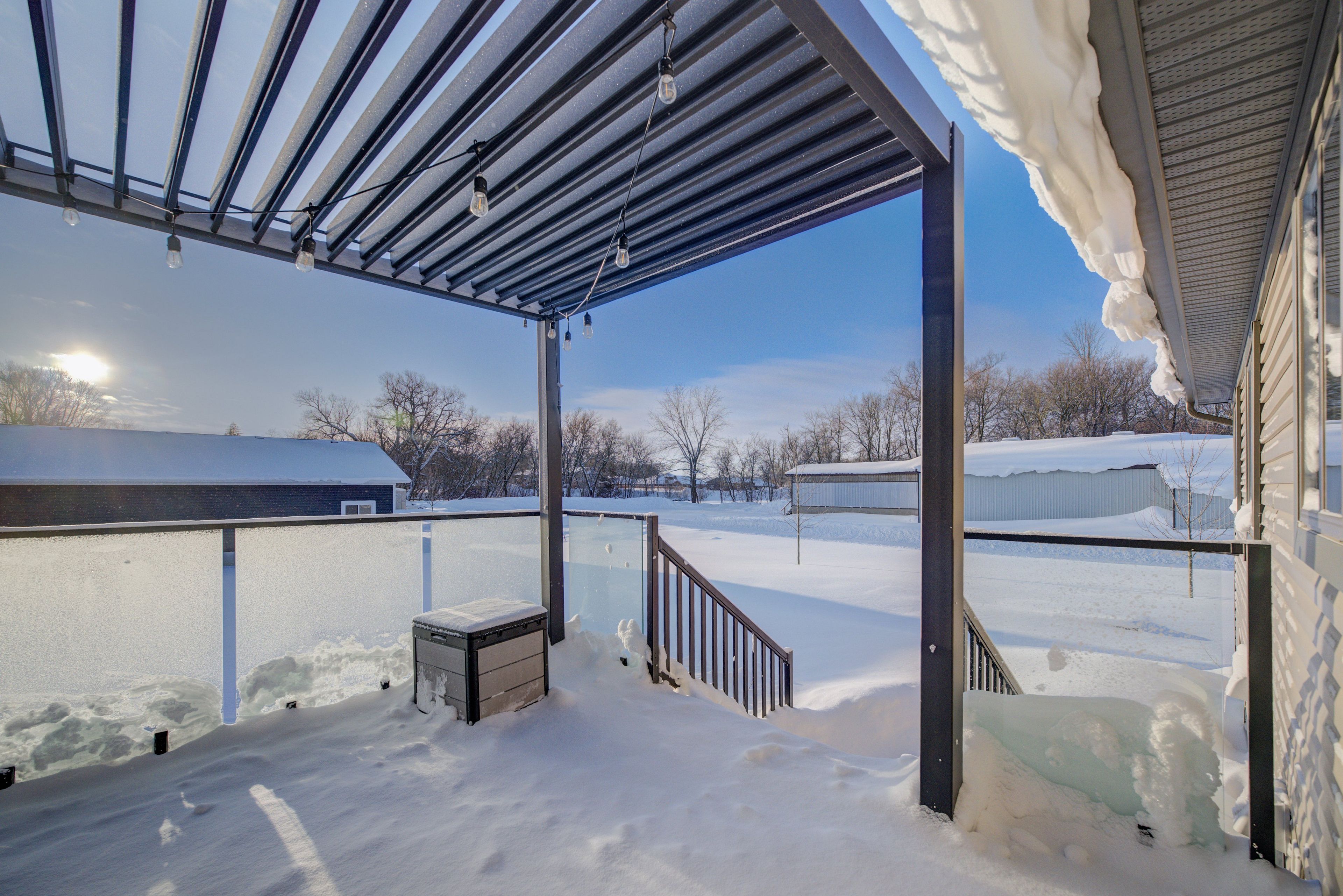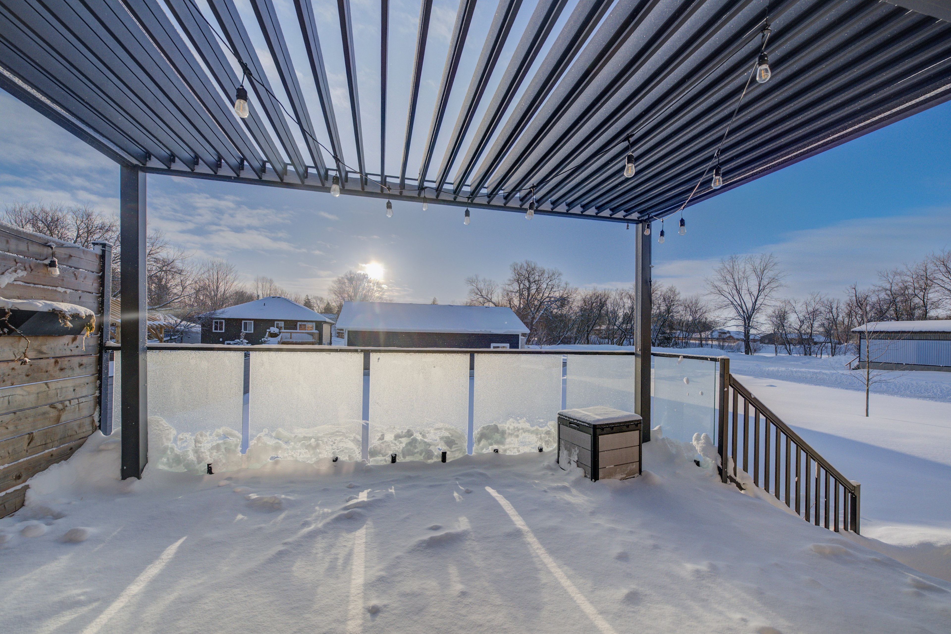 • Outdoor deck with glass railings and pergola for entertaining.
